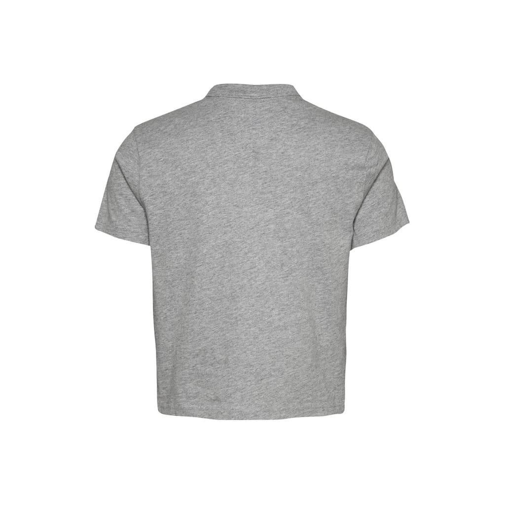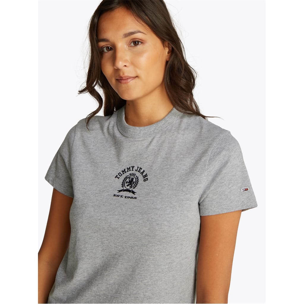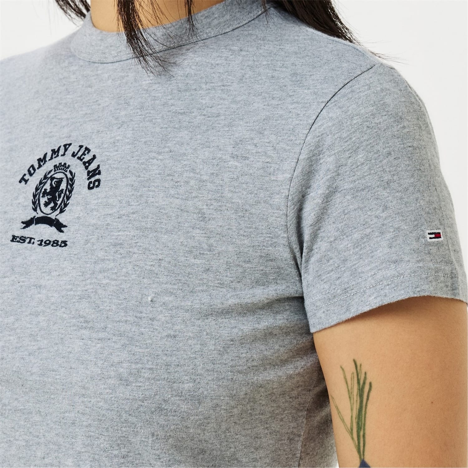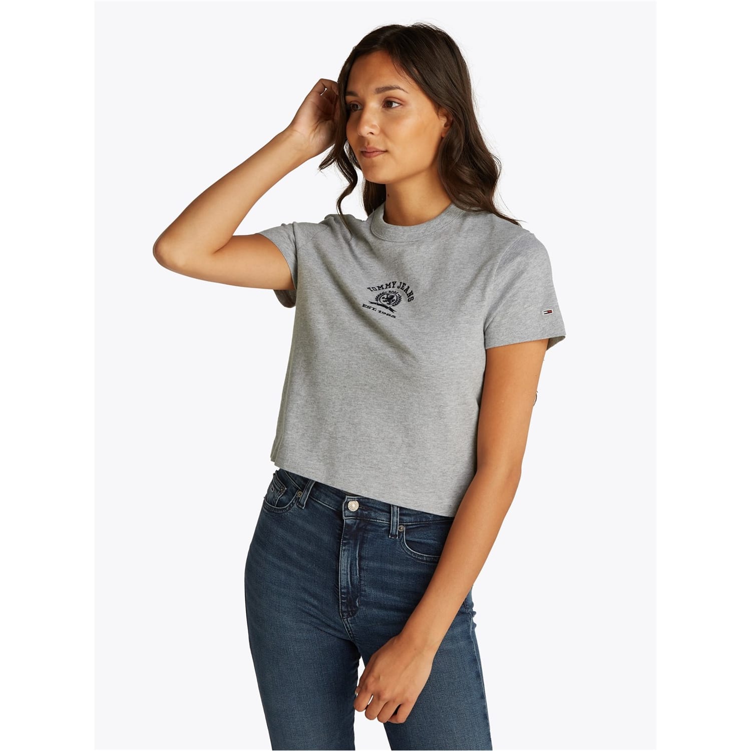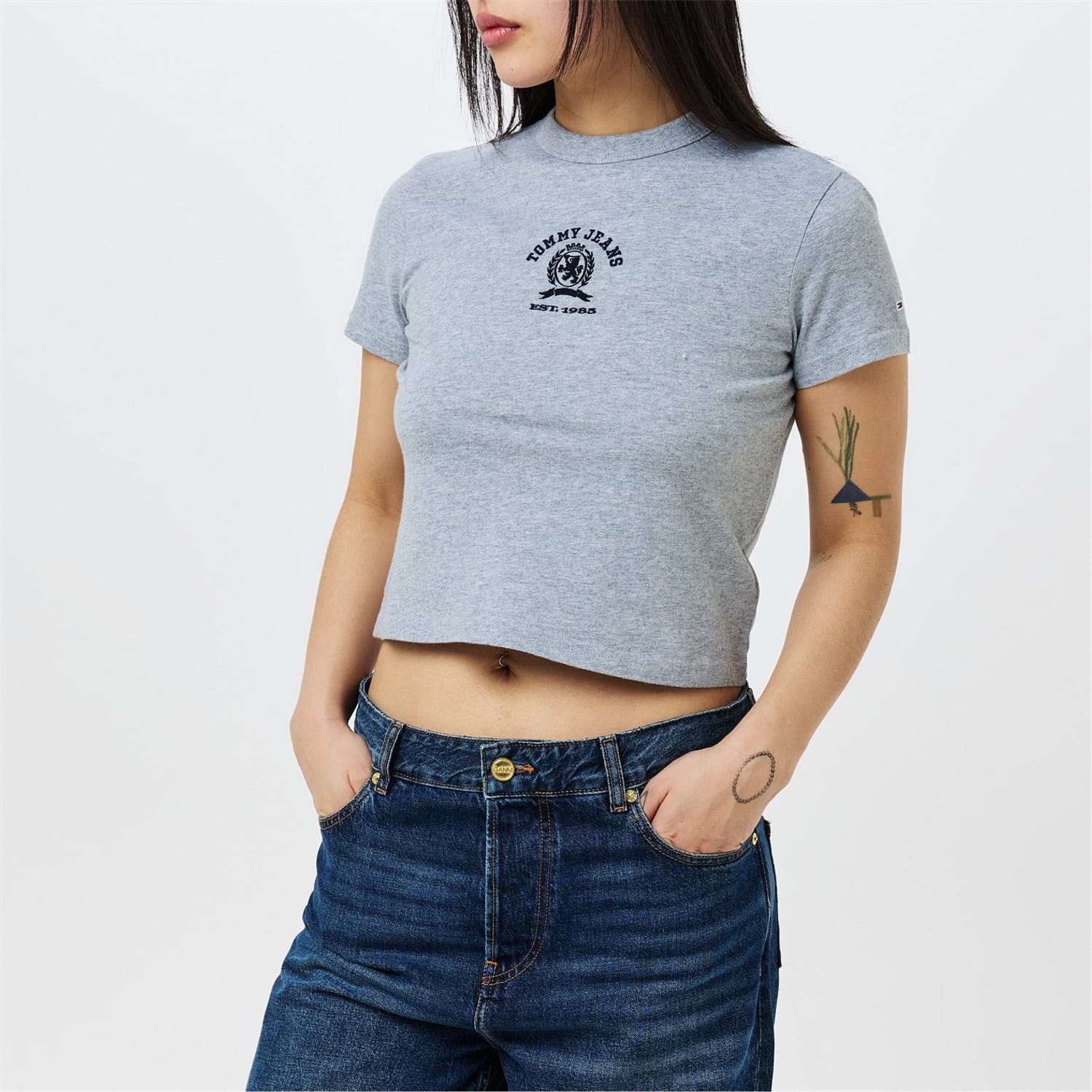 Discover the Tommy Jeans varsity top, a casual cropped piece with a regular fit. This short-sleeve design features a crew neck and a striking graphic print. The standout element is the embroidered crest logo, adding a touch of distinction to your wardrobe. -