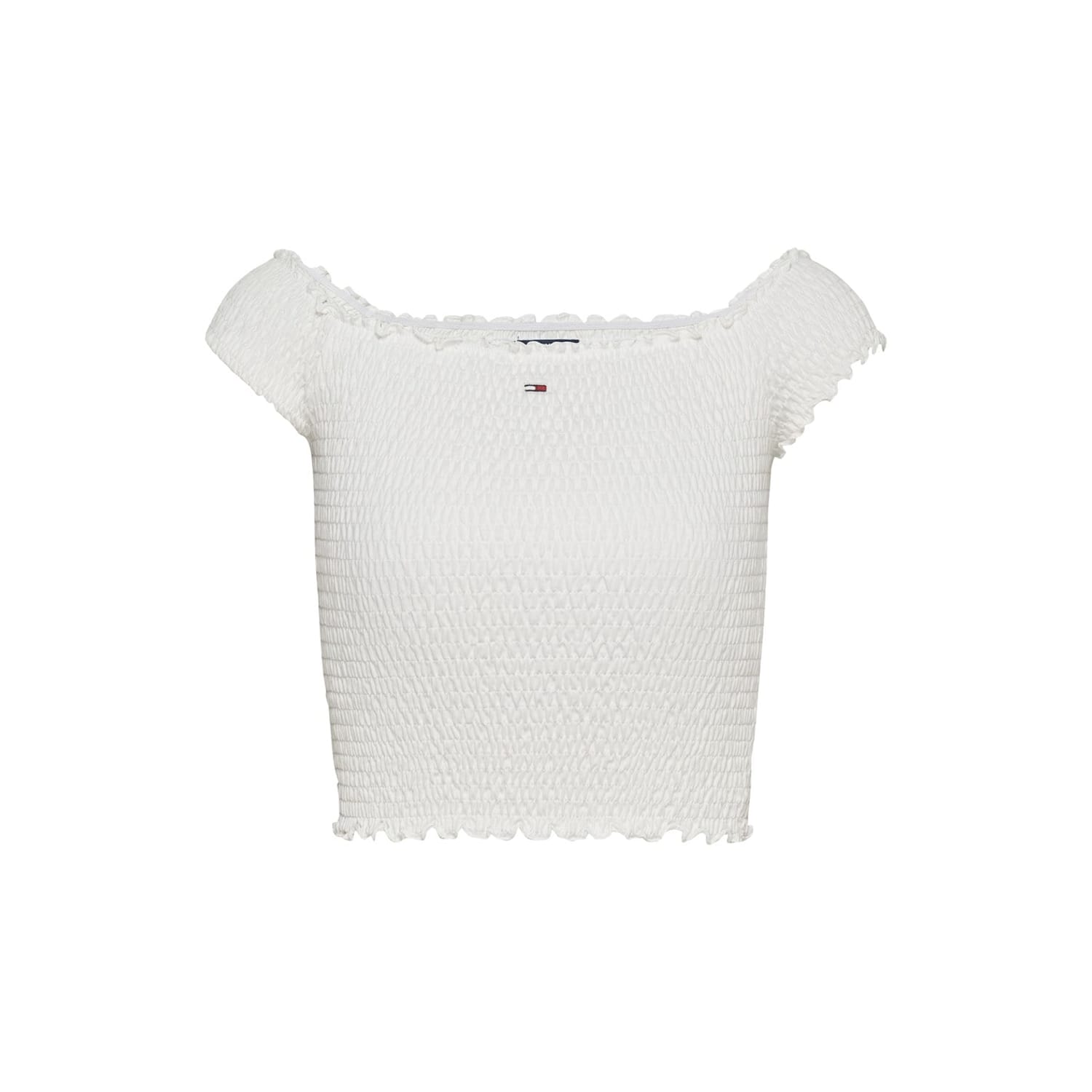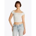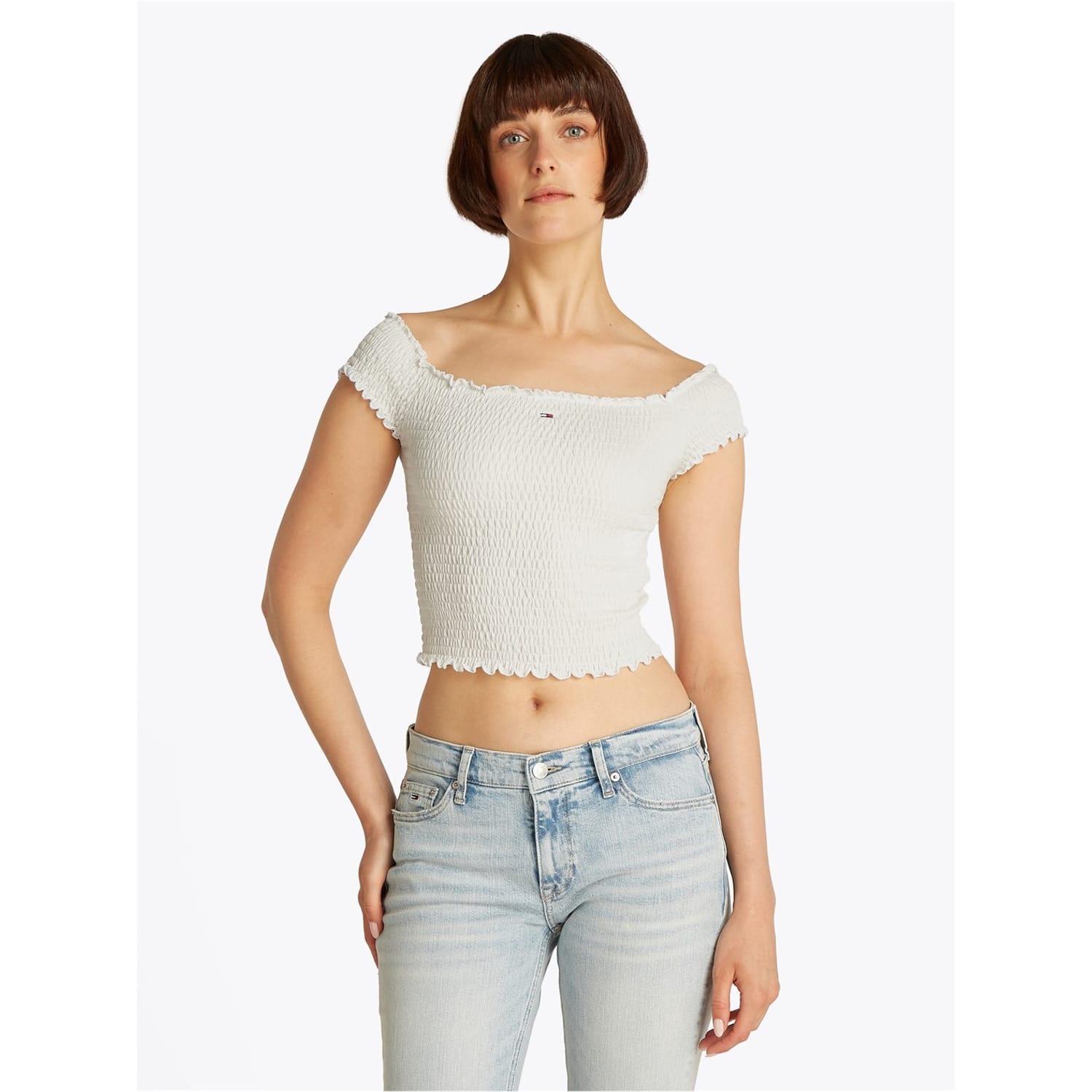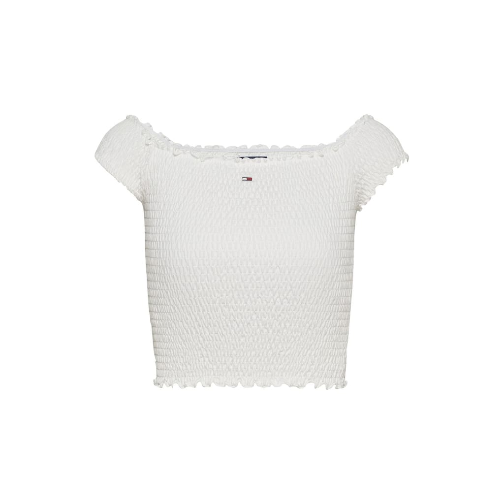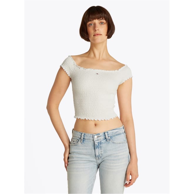 This Tommy Jeans cropped top features a stylish off-the-shoulder neckline and cap sleeves, perfect for a modern look. The ribbed pattern and smocked embellishments add texture, while the slim fit ensures a flattering silhouette. A subtle logo detail completes this chic piece, ideal for those who appreciate both comfort and style. -