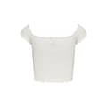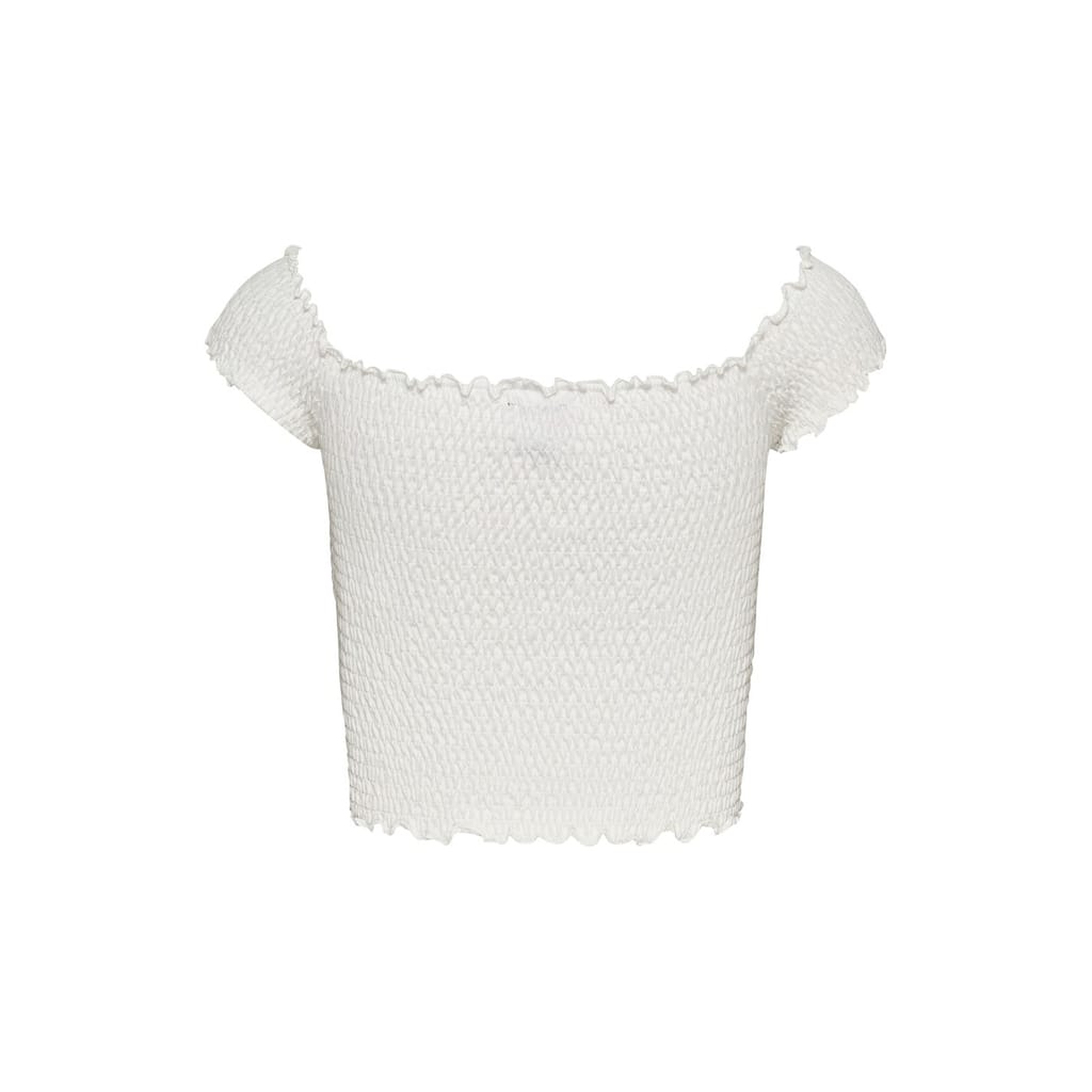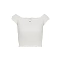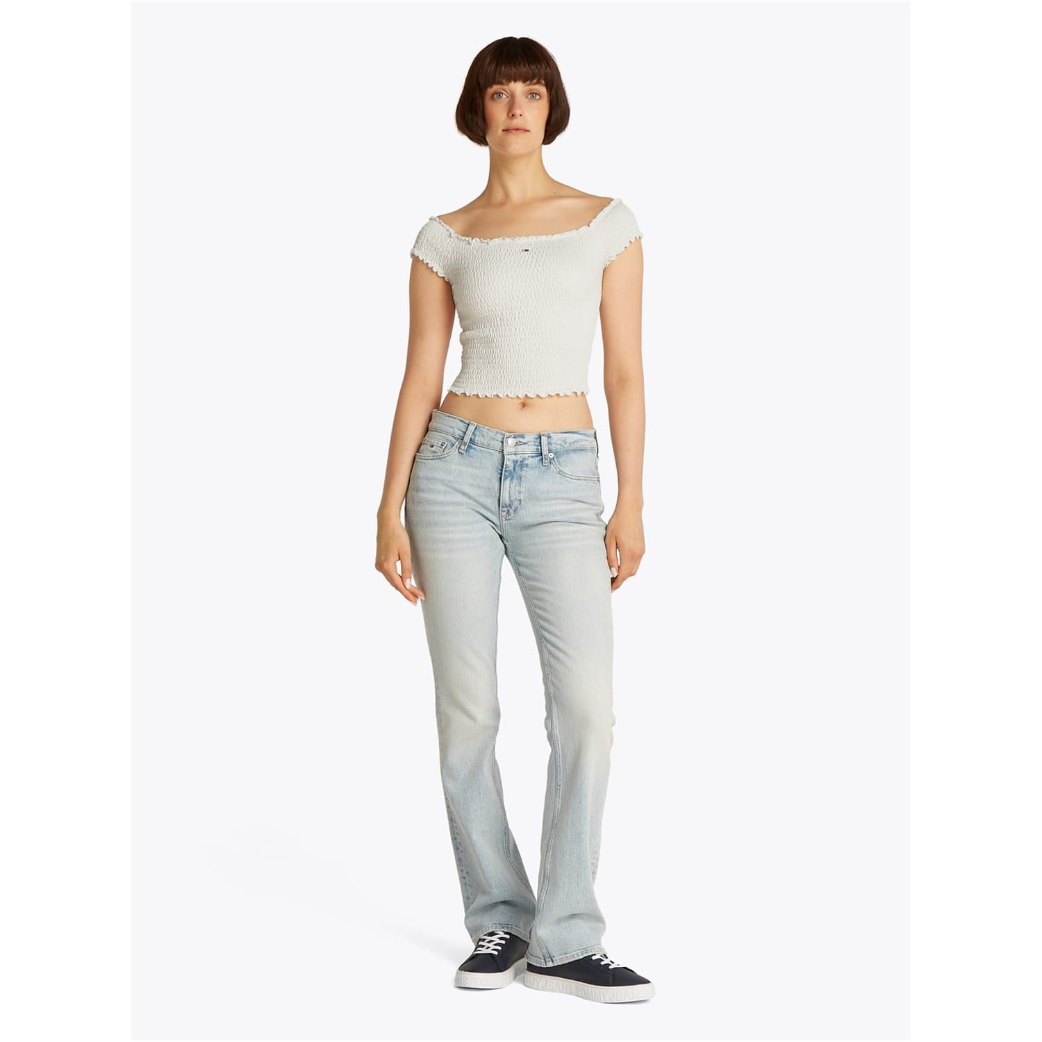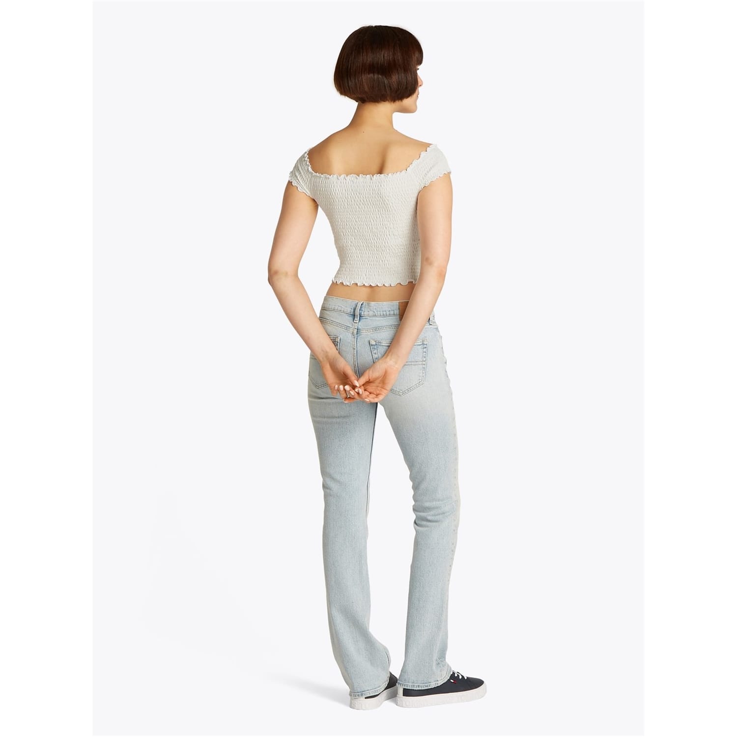 This Tommy Jeans cropped top features a stylish off-the-shoulder neckline and cap sleeves, perfect for a modern look. The ribbed pattern and smocked embellishments add texture, while the slim fit ensures a flattering silhouette. A subtle logo detail completes this chic piece, ideal for those who appreciate both comfort and style. -