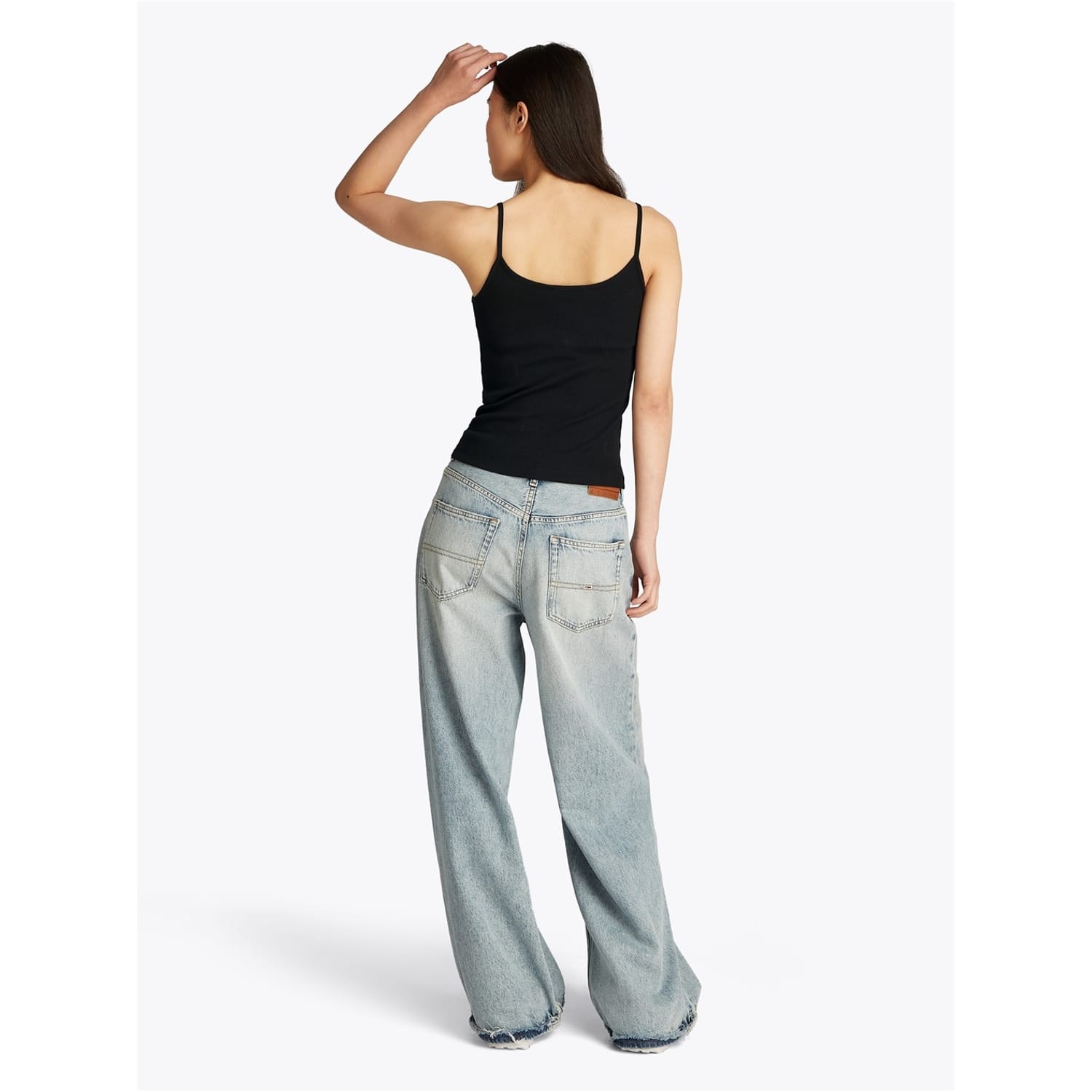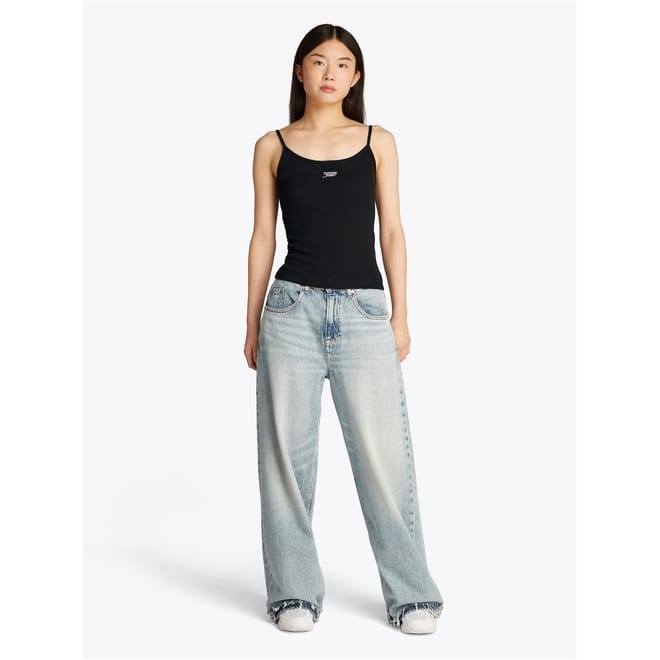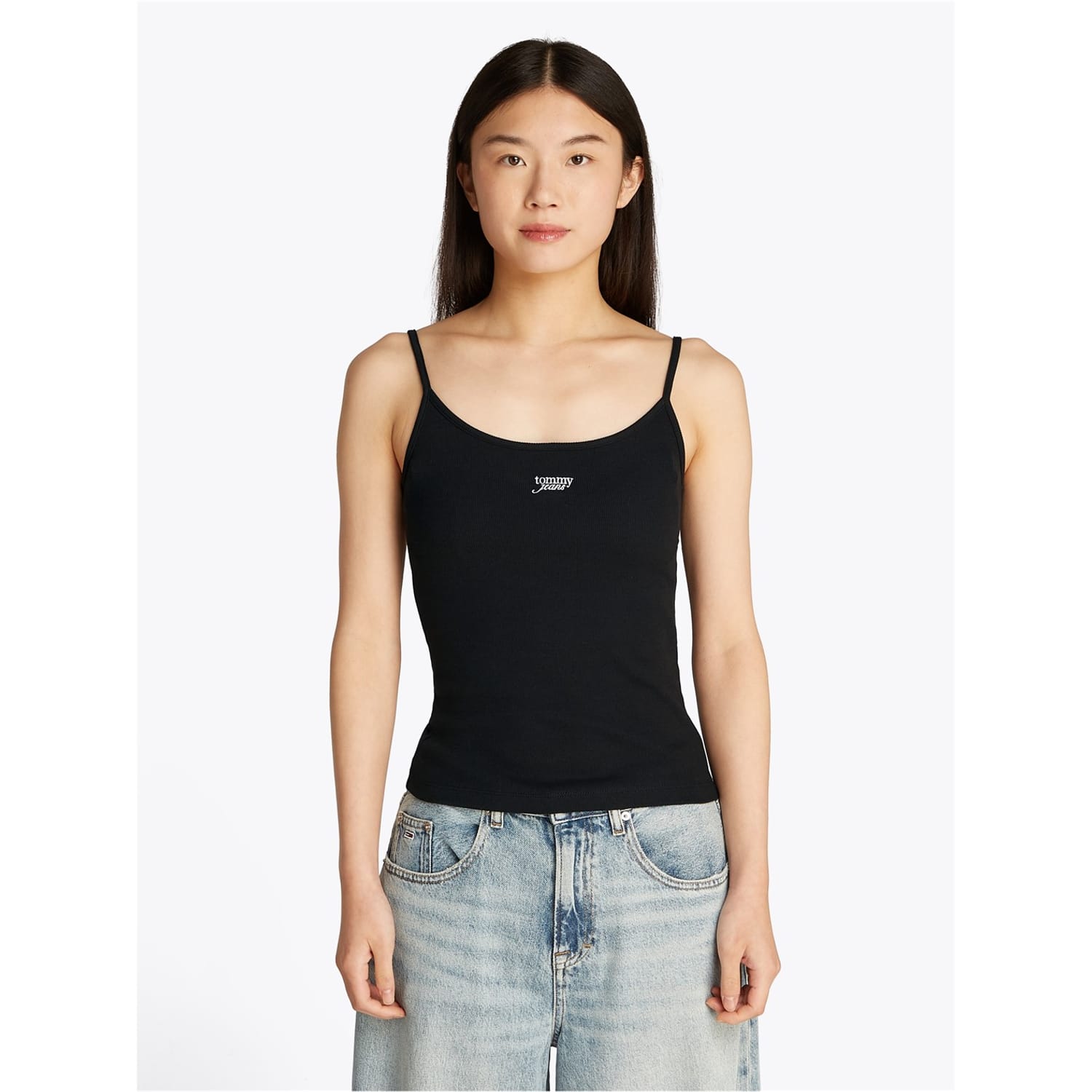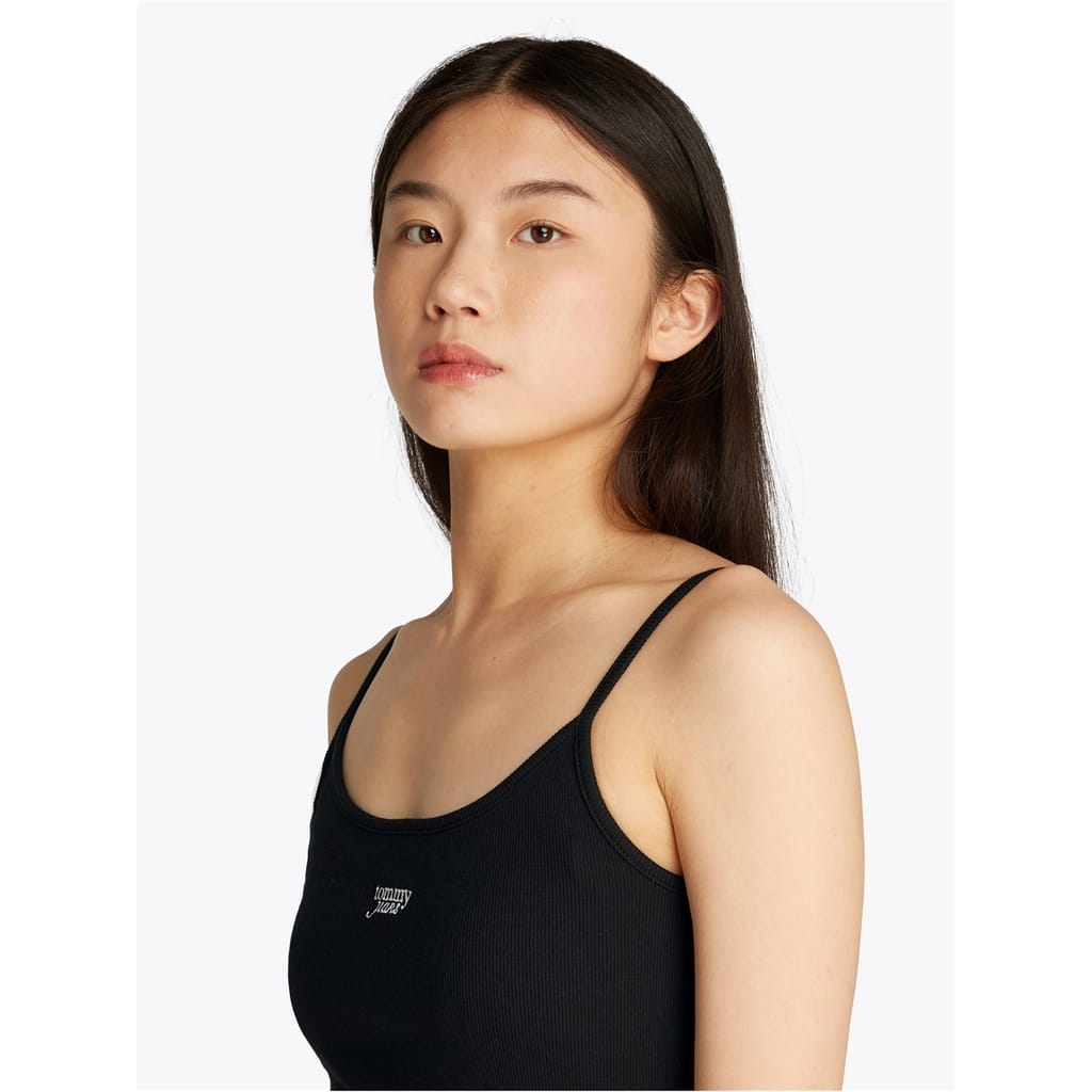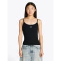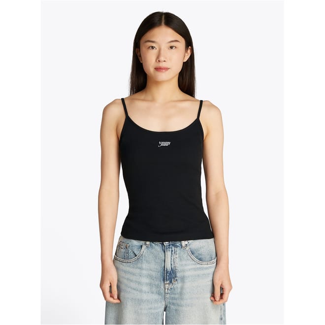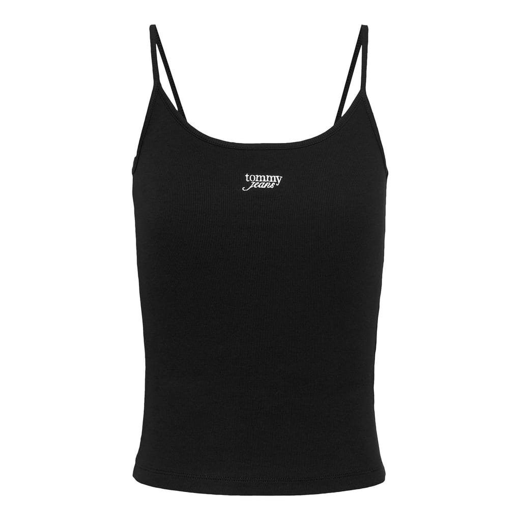 This Tommy Jeans top features a sleek spaghetti strap design with a scoop neck, offering a sleeveless and slim fit. The solid pattern is complemented by a subtle logo embellishment, adding a touch of brand identity to the piece. Ideal for those seeking a minimalist yet stylish addition to their wardrobe. -