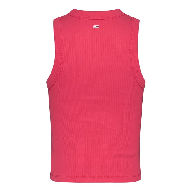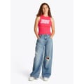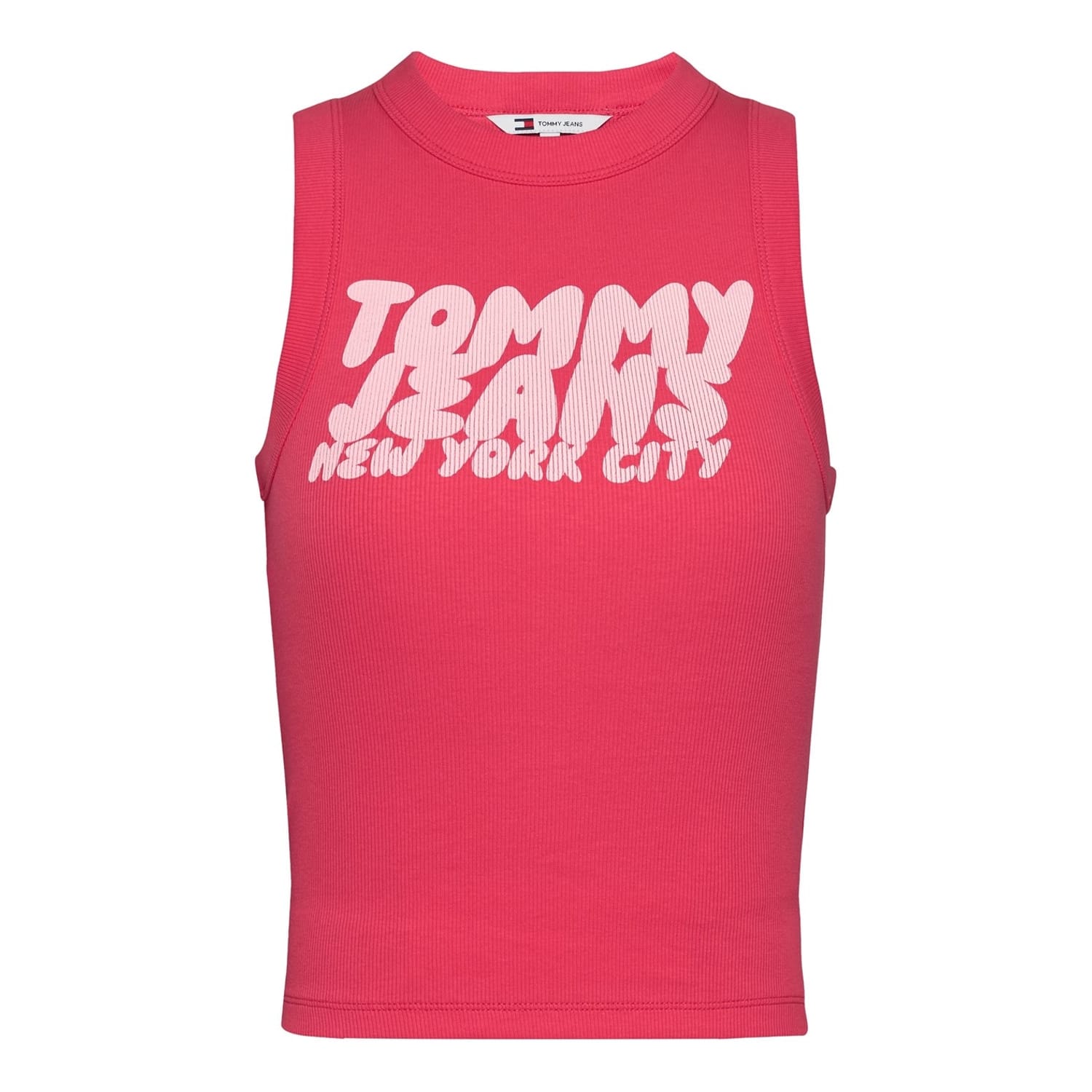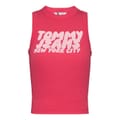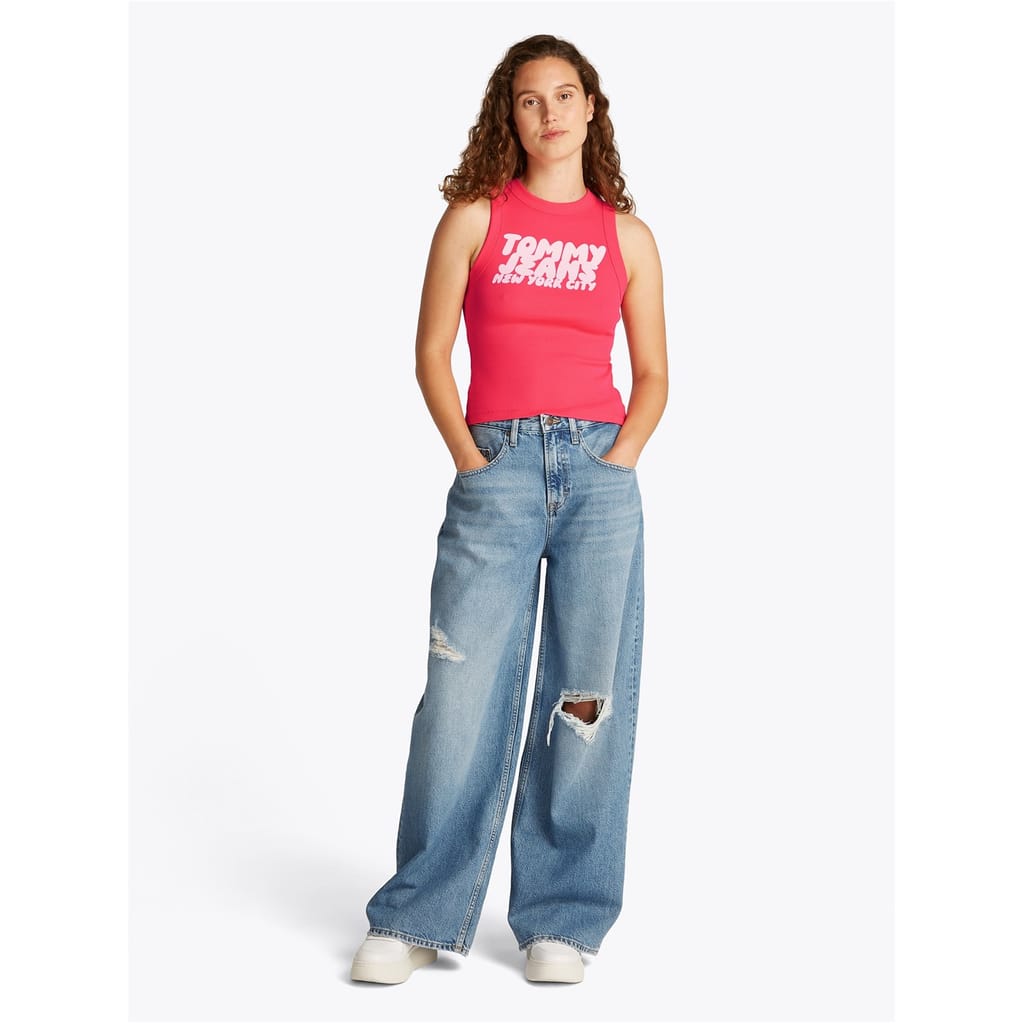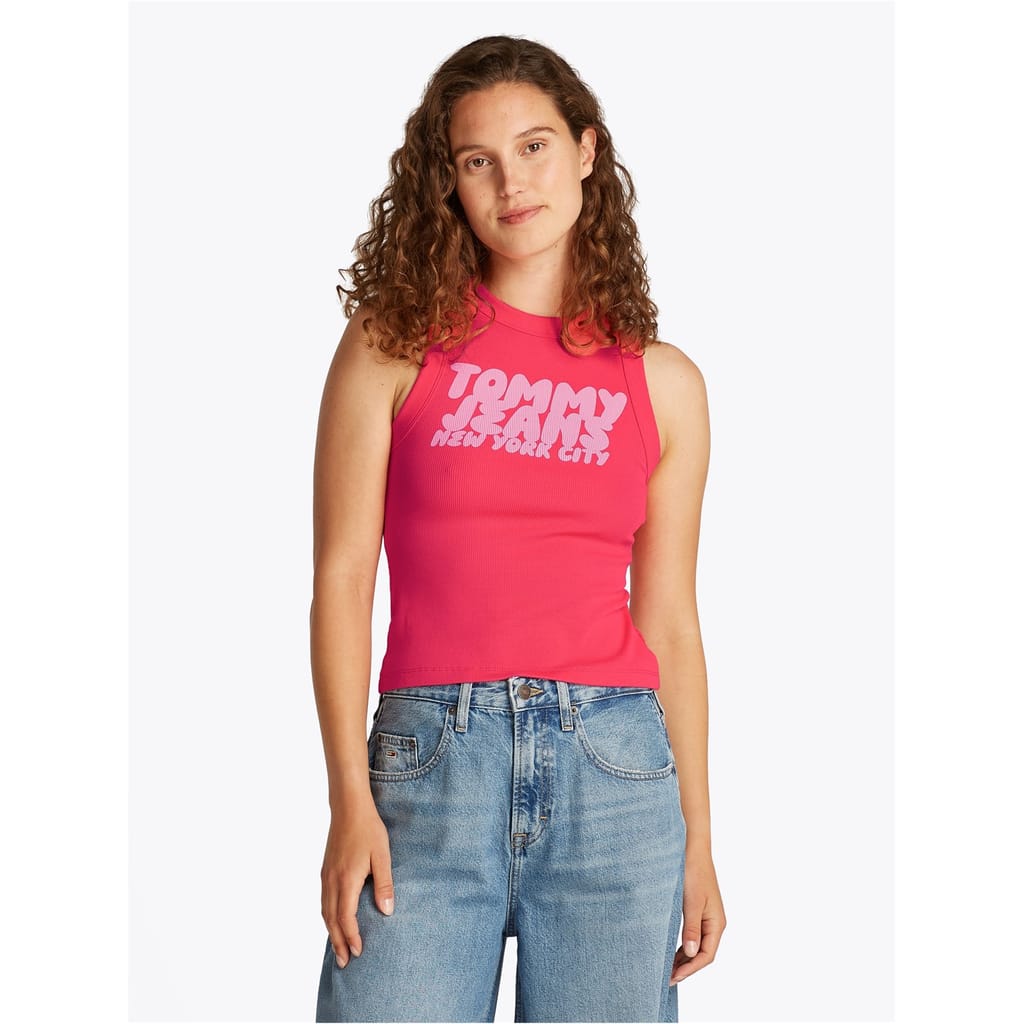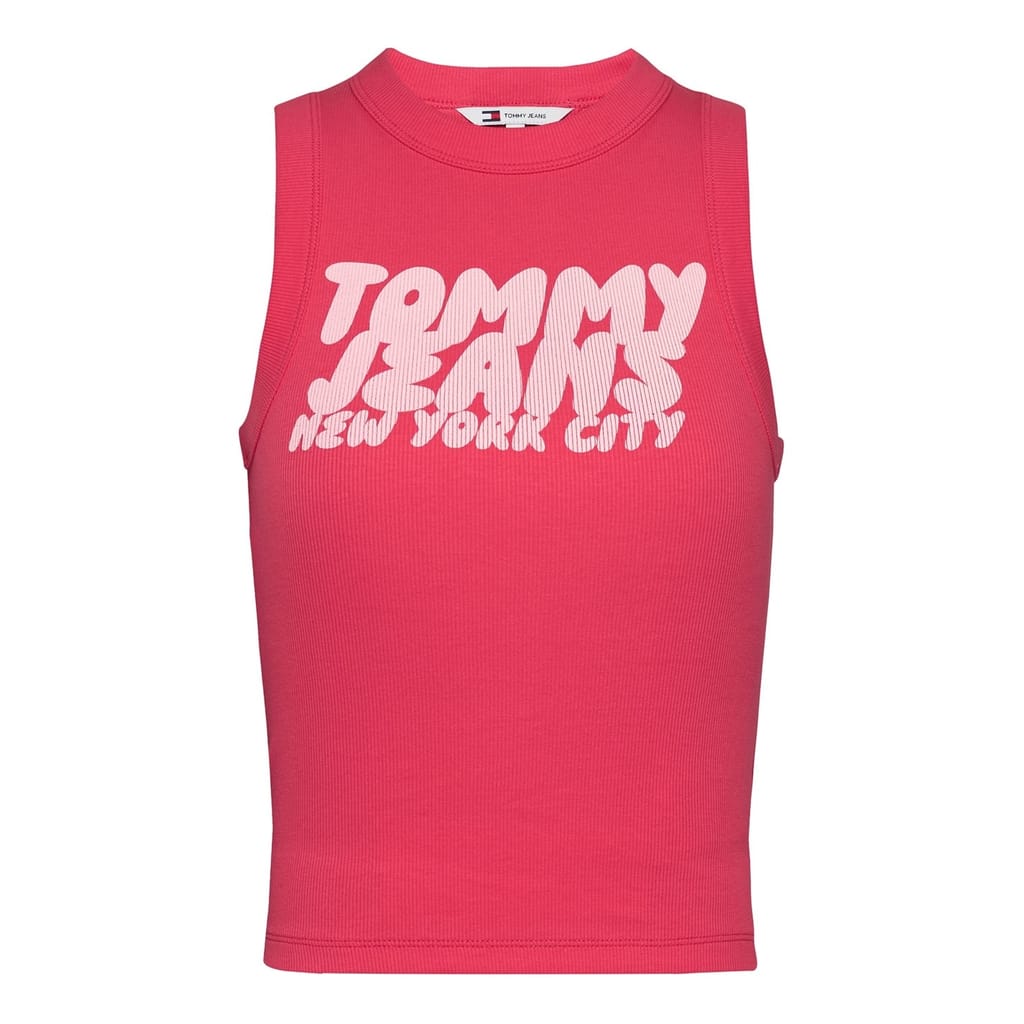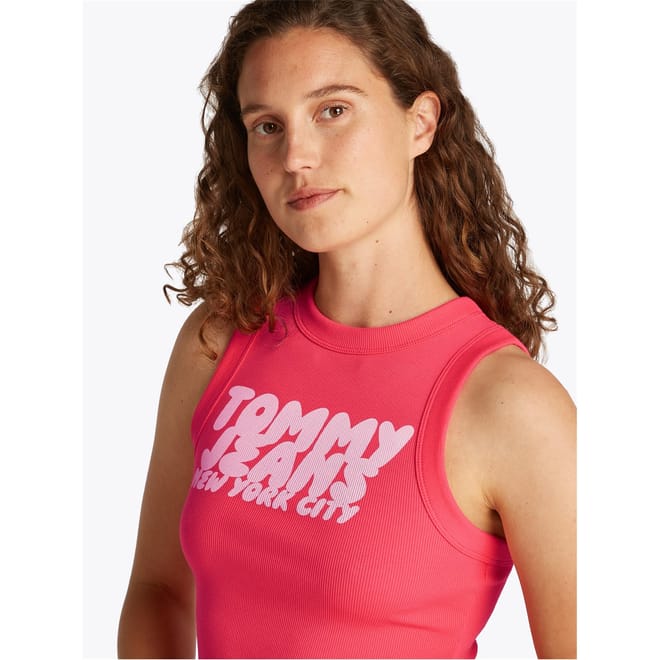 This Tommy Jeans sleeveless top features a slim fit and a classic crew neck. Adorned with a distinctive logo and eye-catching lettering, it showcases a bold graphic print that adds a modern touch to your wardrobe. -