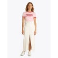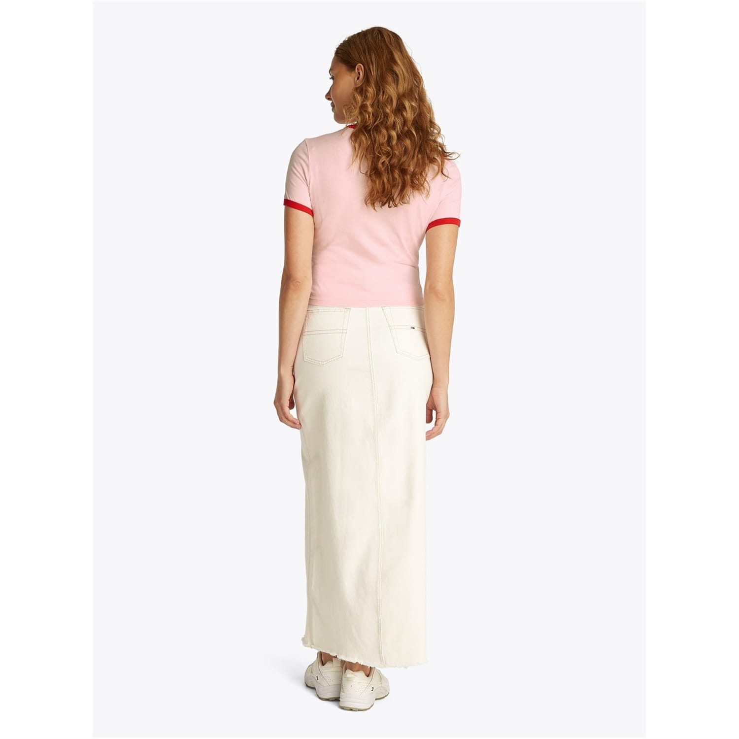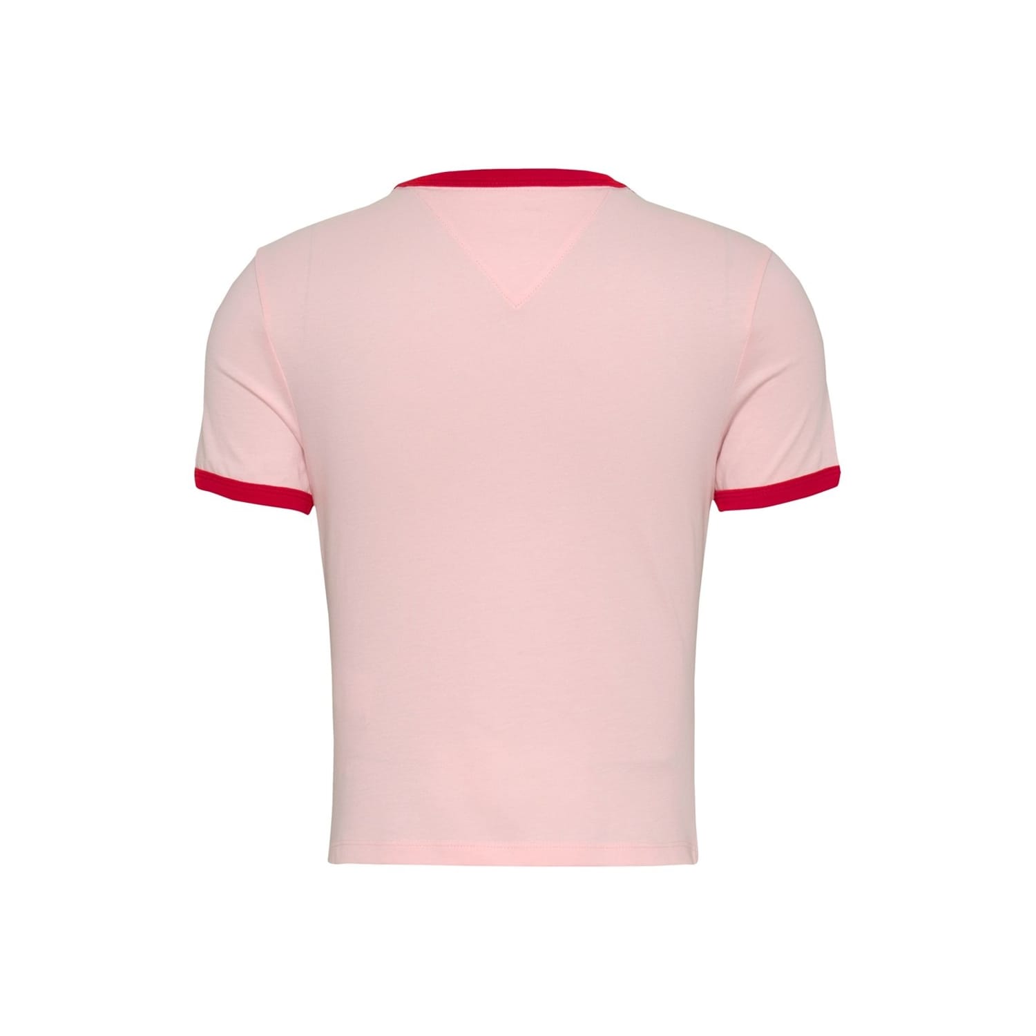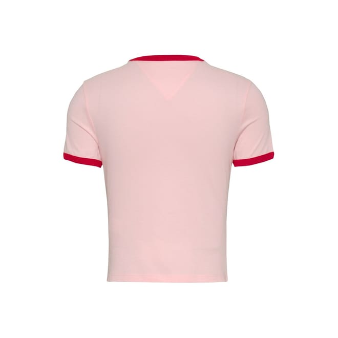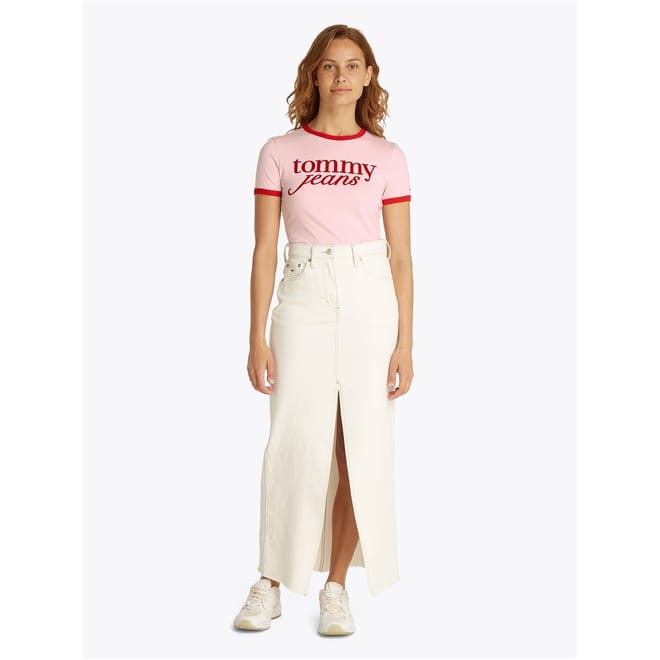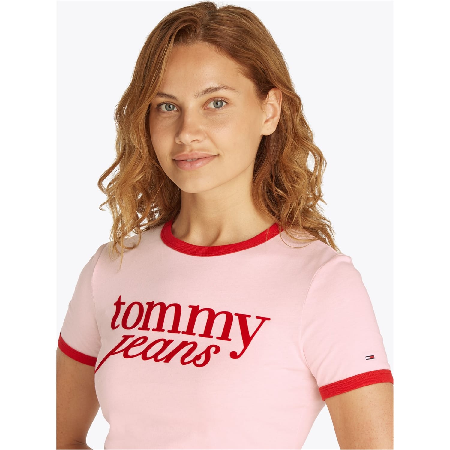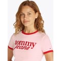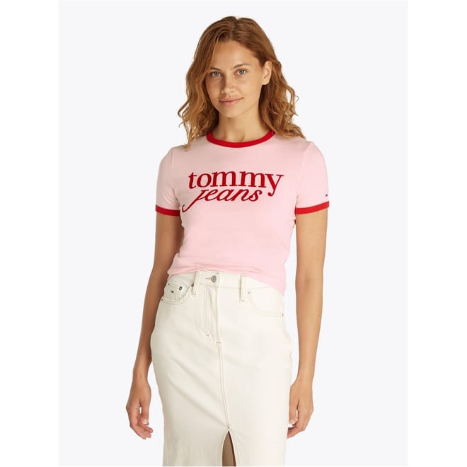 Discover the Tommy Jeans Script Timmy top, a casual staple with a slim fit. This solid short-sleeve piece features a crew neck and ribbed cuffs, offering a comfortable and stylish look. The iconic logo embellishment adds a touch of brand identity, making it a versatile addition to your wardrobe. -