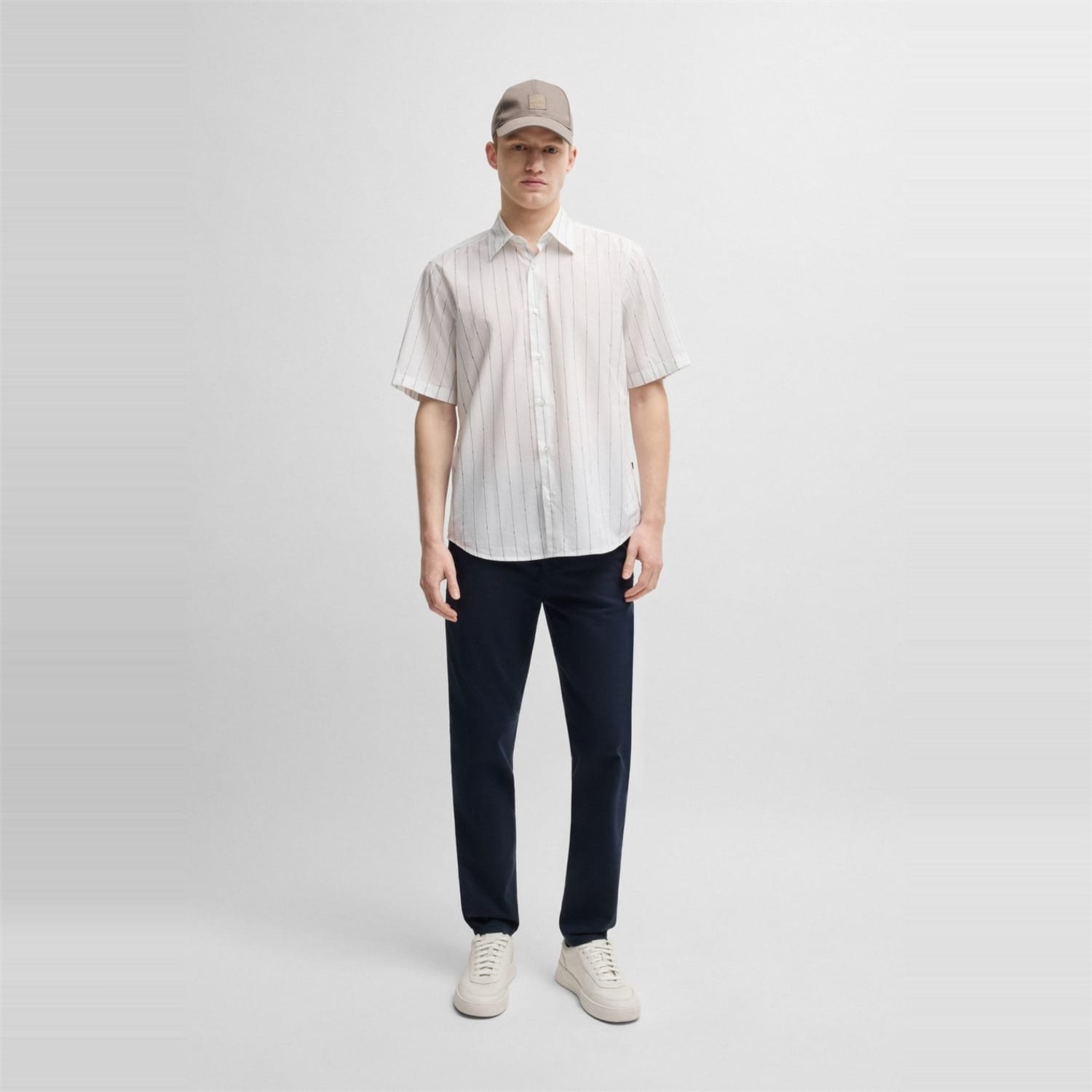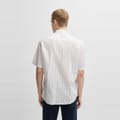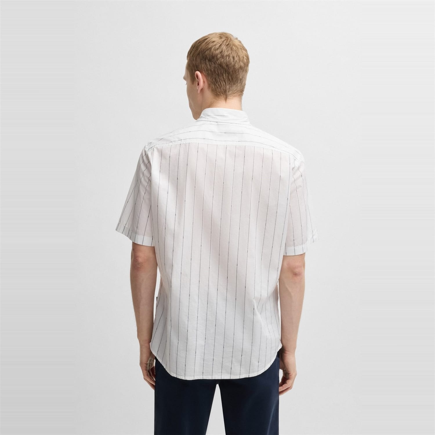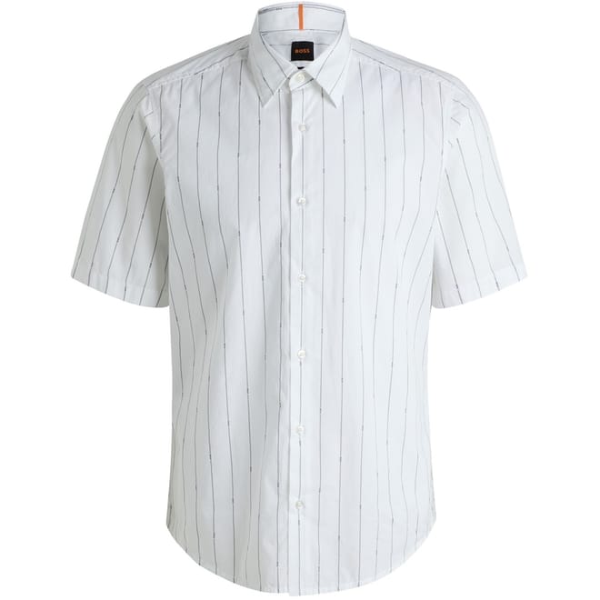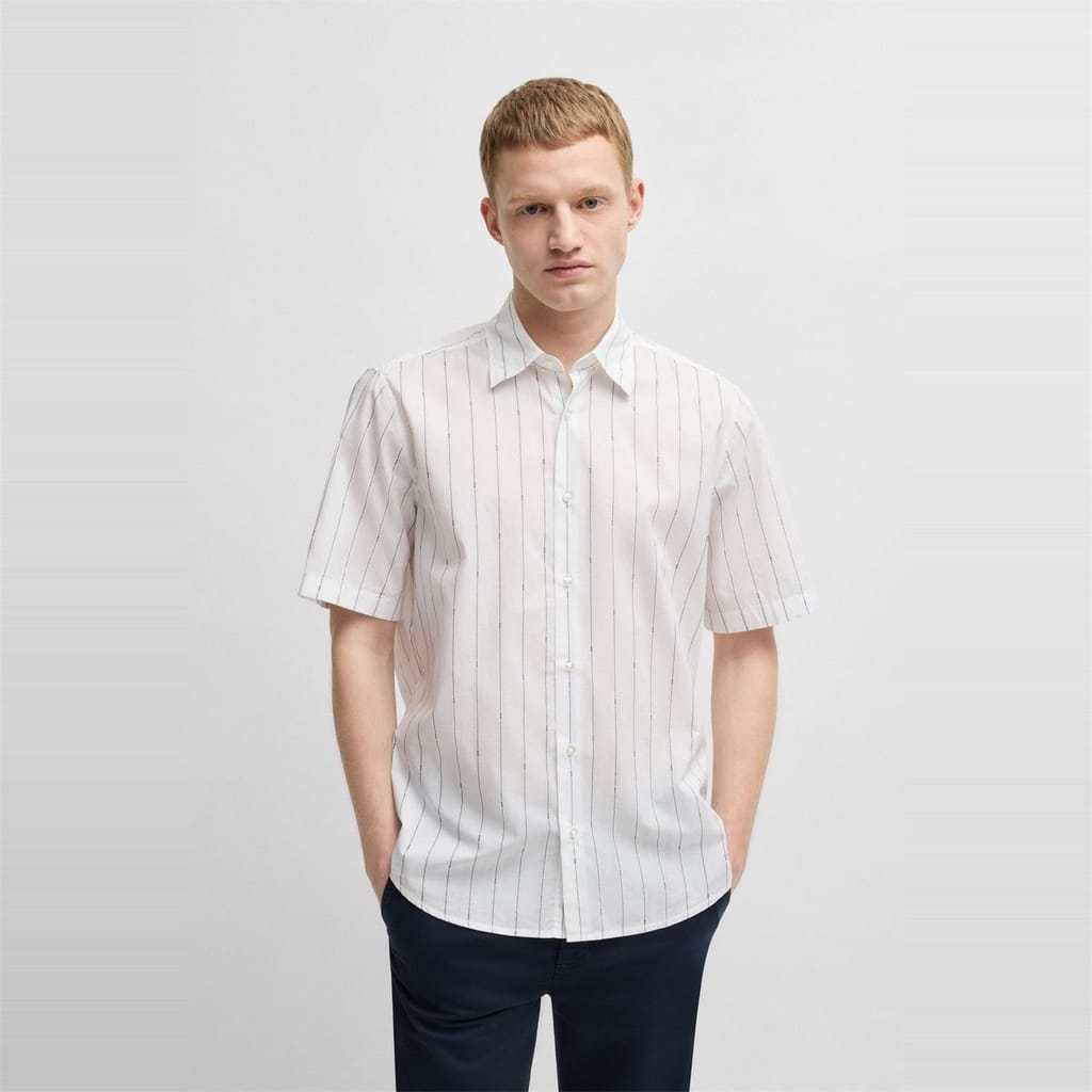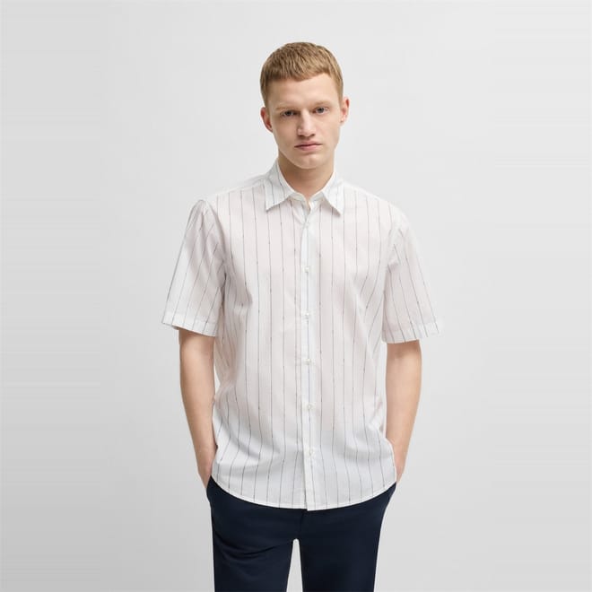 This Boss top is a formal piece featuring a regular fit and short sleeves. It showcases a vertical stripe pattern and a shirt collar. The button-down closure adds a classic touch, while the logo embellishment subtly highlights the brand's identity. -