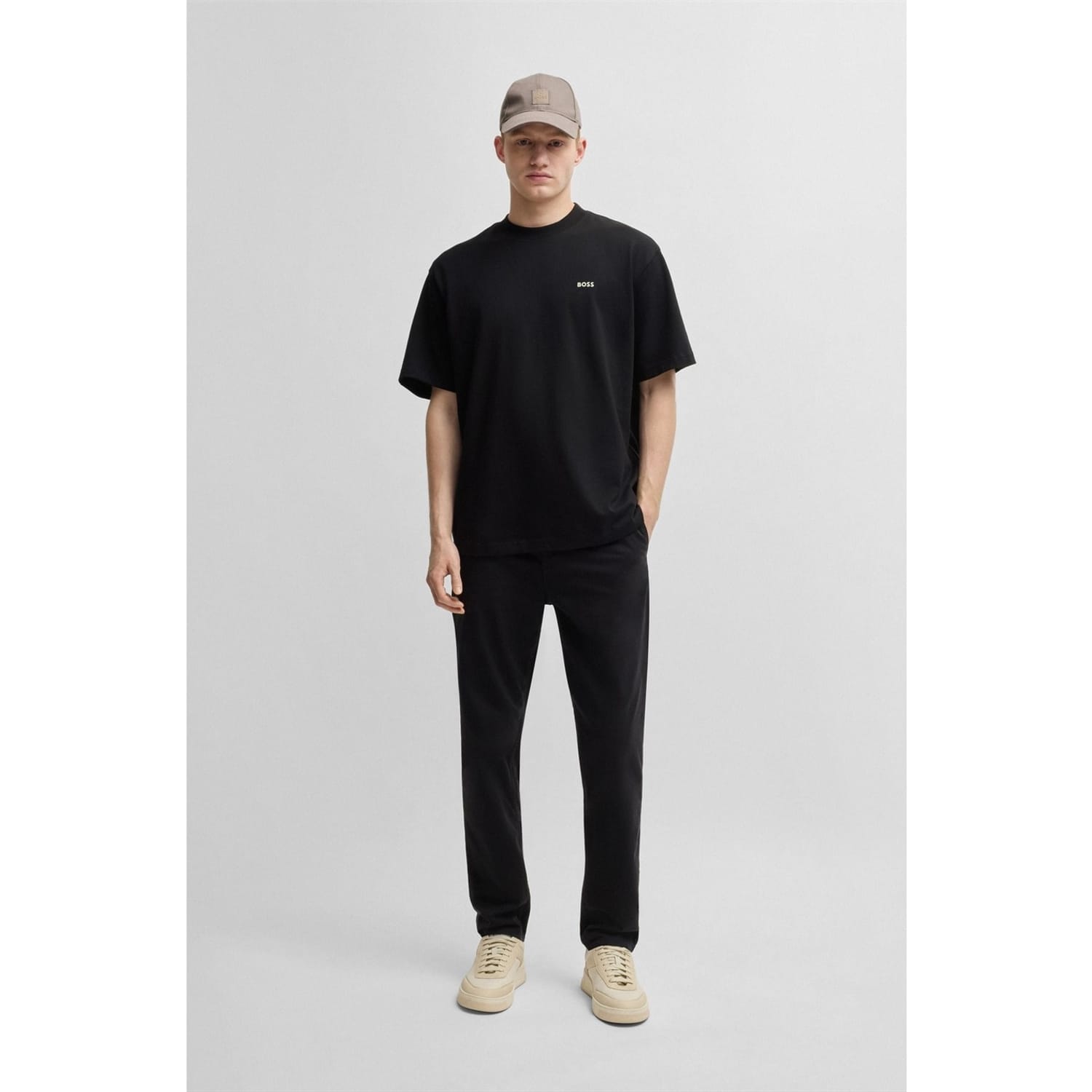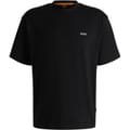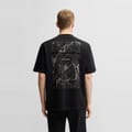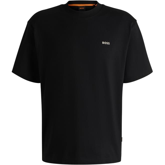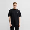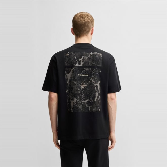 This Boss top features an oversize fit and short sleeves, offering a relaxed and comfortable style. The crew neck design is complemented by a striking graphic print, adding a modern touch. A subtle logo embellishment completes the look, making it a versatile addition to any wardrobe. -
