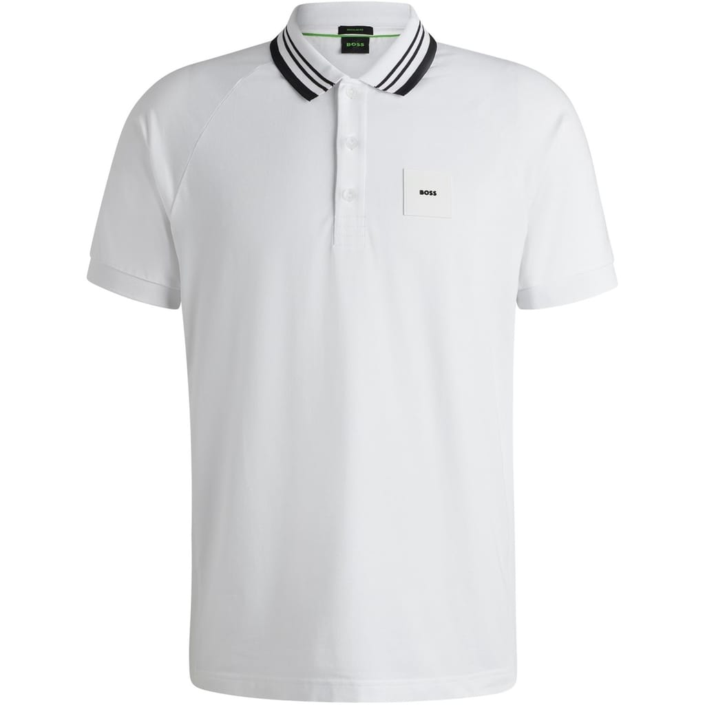 This Boss top features a ribbed pattern and a classic polo collar. Designed with short raglan sleeves, it offers a regular fit for comfortable wear. The button closure adds a touch of sophistication, while the logo embellishment provides a subtle brand statement. -