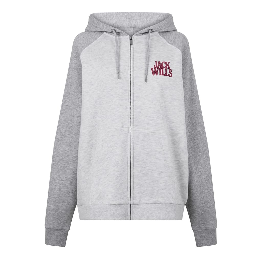 This Jack Wills sweatshirt jacket features a relaxed fit with a hooded neckline and a convenient zipper closure. The raglan sleeves and ribbed cuffs provide comfort and style, while the ribbed hem adds a neat finish. The color block pattern and logo embellishment offer a distinctive look, making it a versatile addition to your wardrobe. -