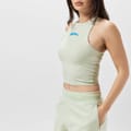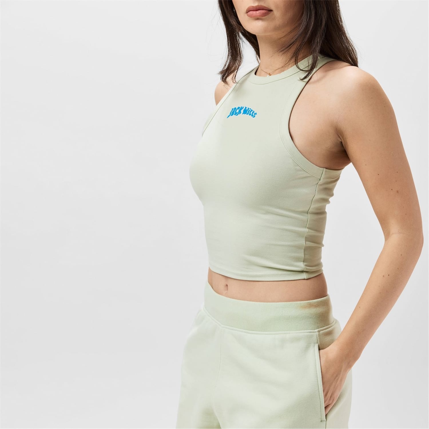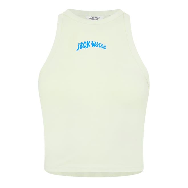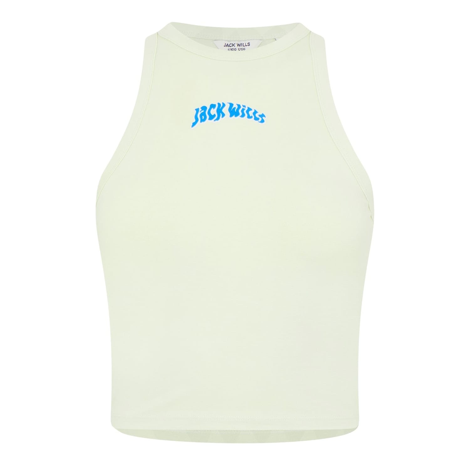 This Jack Wills cropped top is a casual essential, featuring a sleeveless design and a crew neck. The slim fit enhances its modern appeal, while the graphic print with lettering adds a stylish touch. The racerback and logo embellishments complete the look, making it a versatile addition to your wardrobe. -