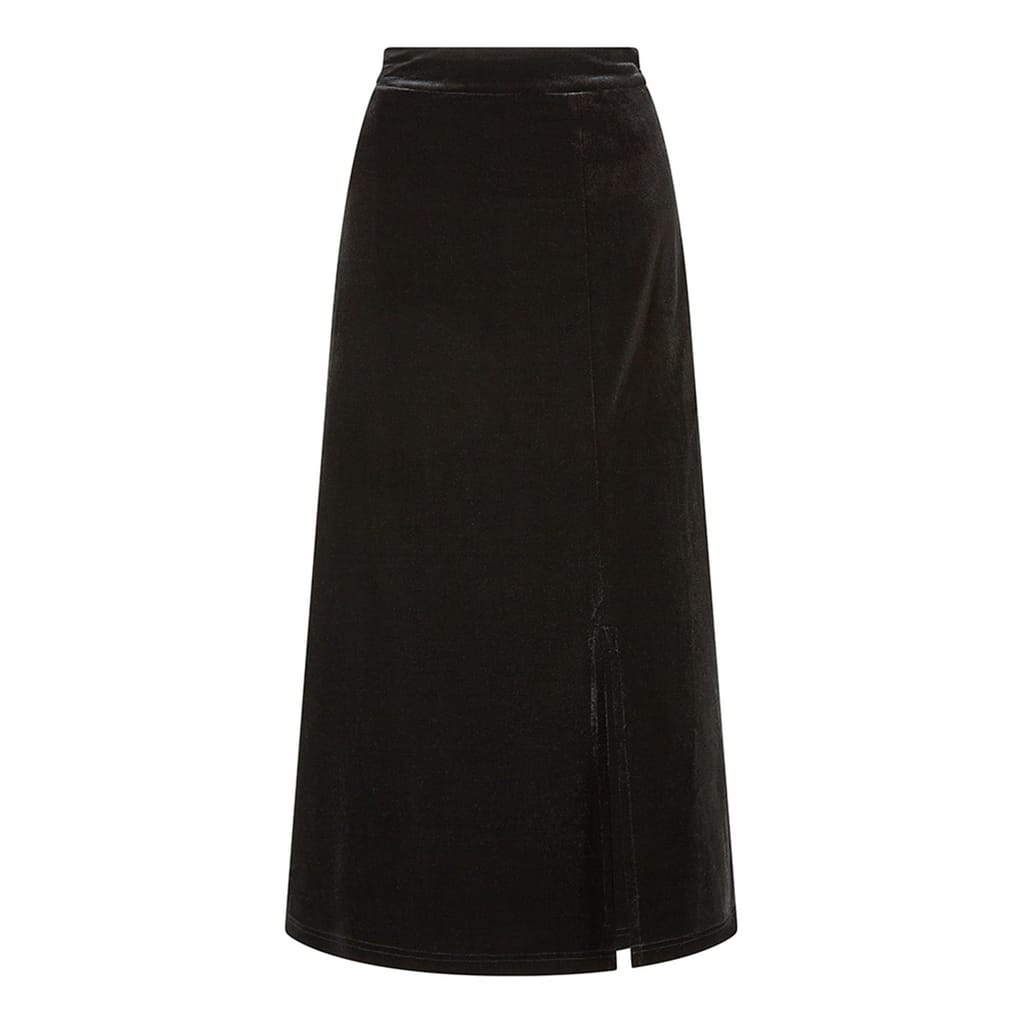 Perfect for parties or just adding to your everyday rotation. This black velvet skirt features a high waist band that zips in the back, a flared style and that slit in the hemline for a flirty fit. Style with a body suit or roll neck and boots for everyday, or up the glam and go for sequins on top. -