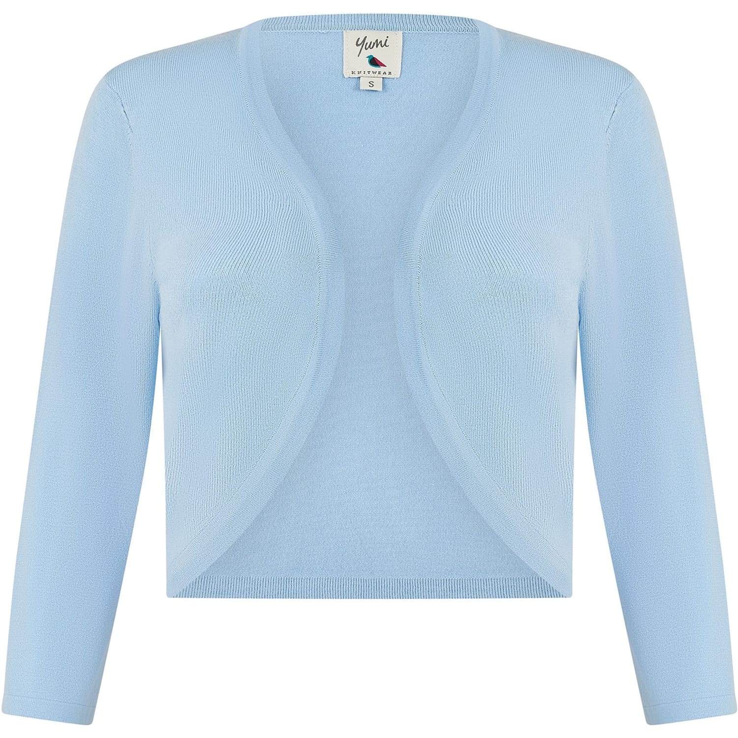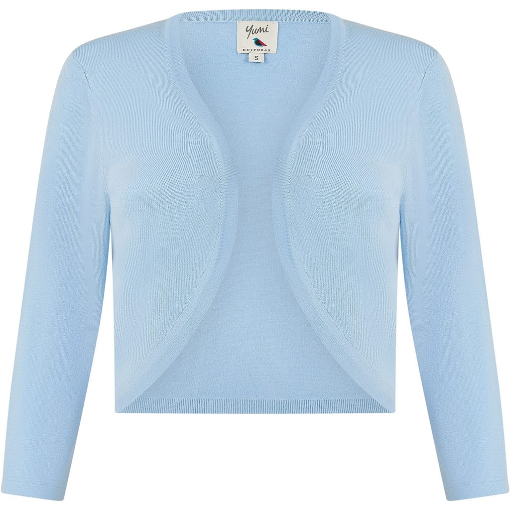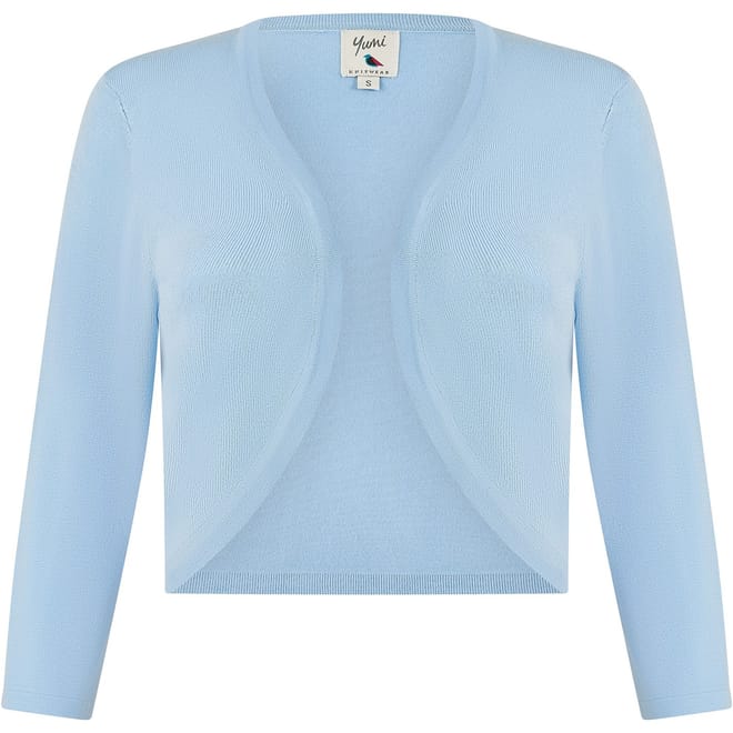 Layer up with this Yumi Blue Knitted Bolero. Made in a close knit soft feel fabric. This little number is perfect to layer over any dress for those fancy events to keep you looking sophisticated. In a simple edge to edge curve design, this piece will sit at the waist, with a 3/4 sleeve to keep the chill off. -