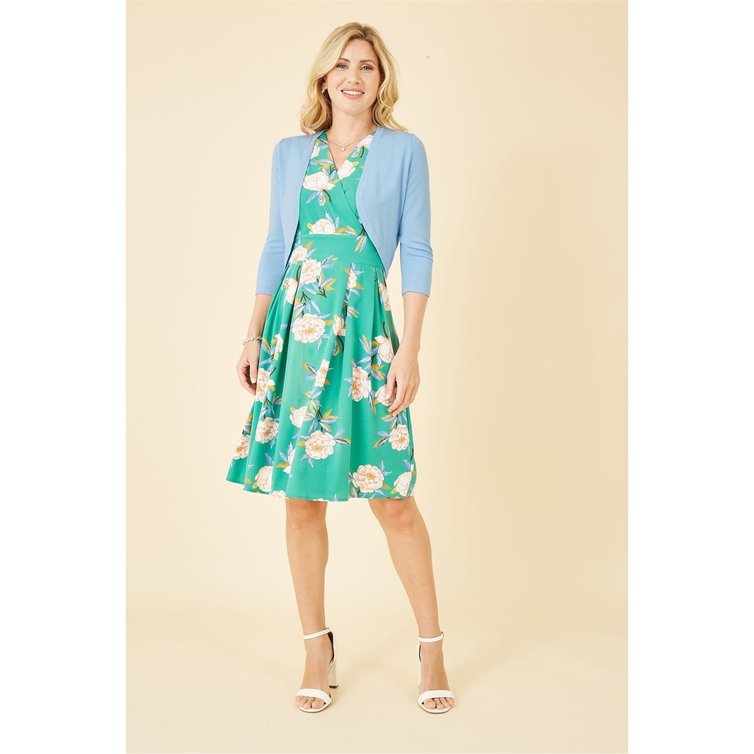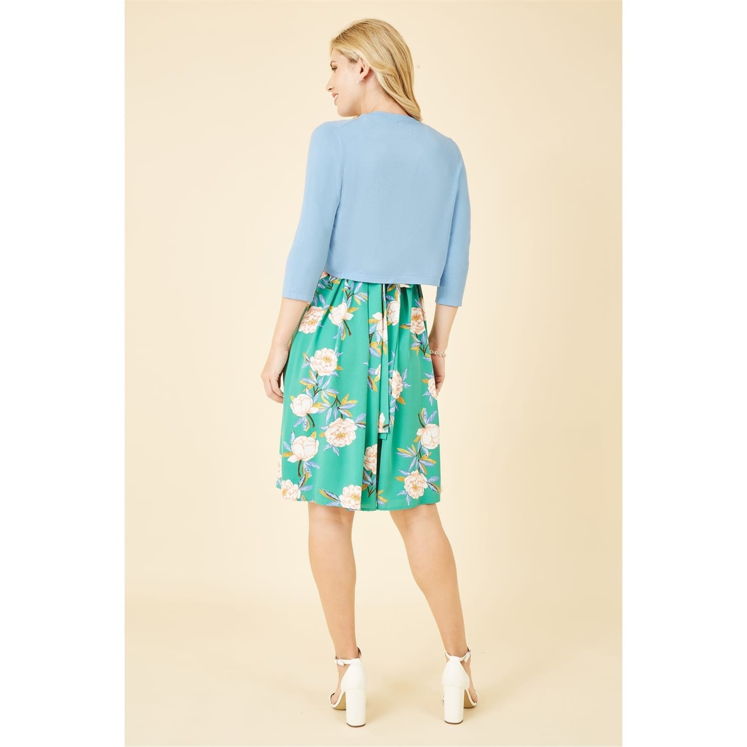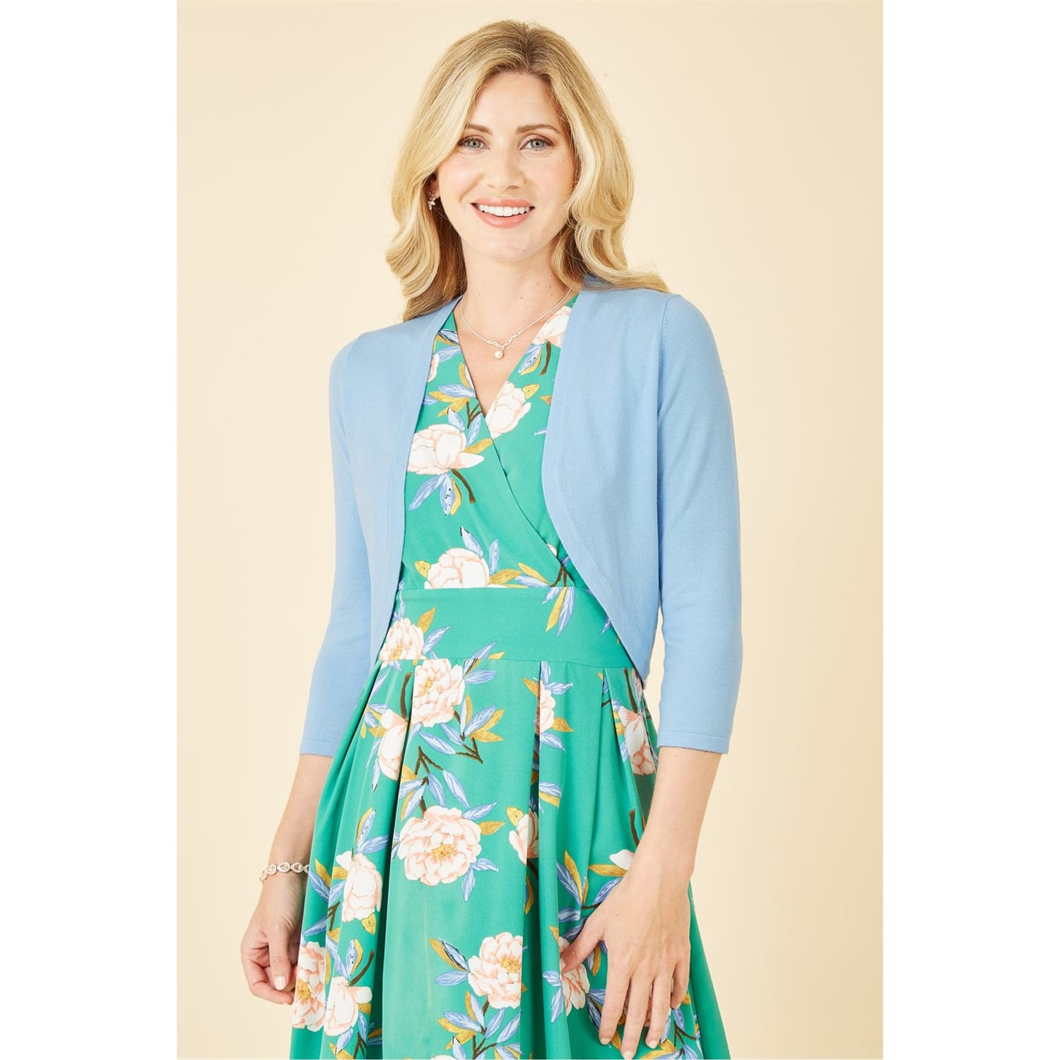 Layer up with this Yumi Blue Knitted Bolero. Made in a close knit soft feel fabric. This little number is perfect to layer over any dress for those fancy events to keep you looking sophisticated. In a simple edge to edge curve design, this piece will sit at the waist, with a 3/4 sleeve to keep the chill off. -