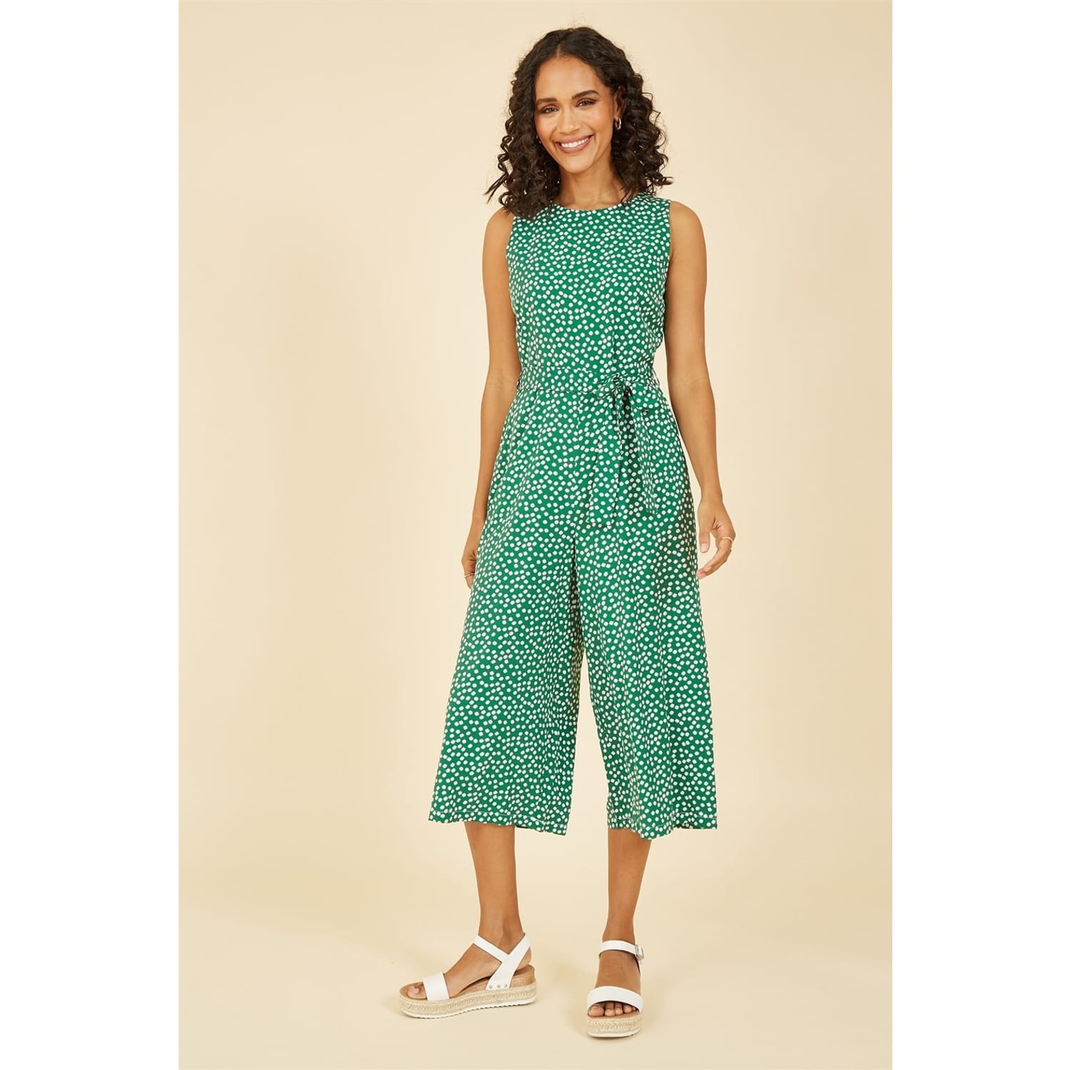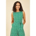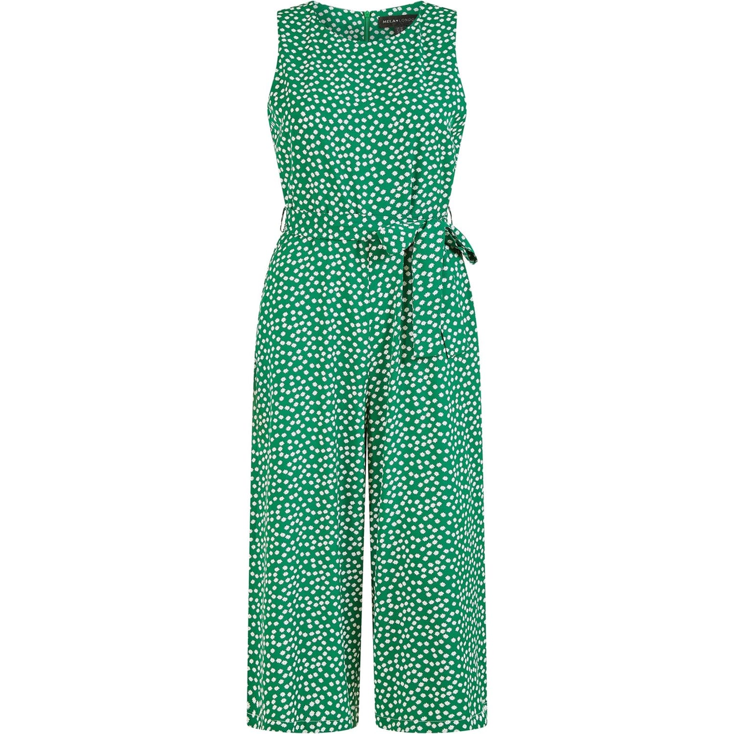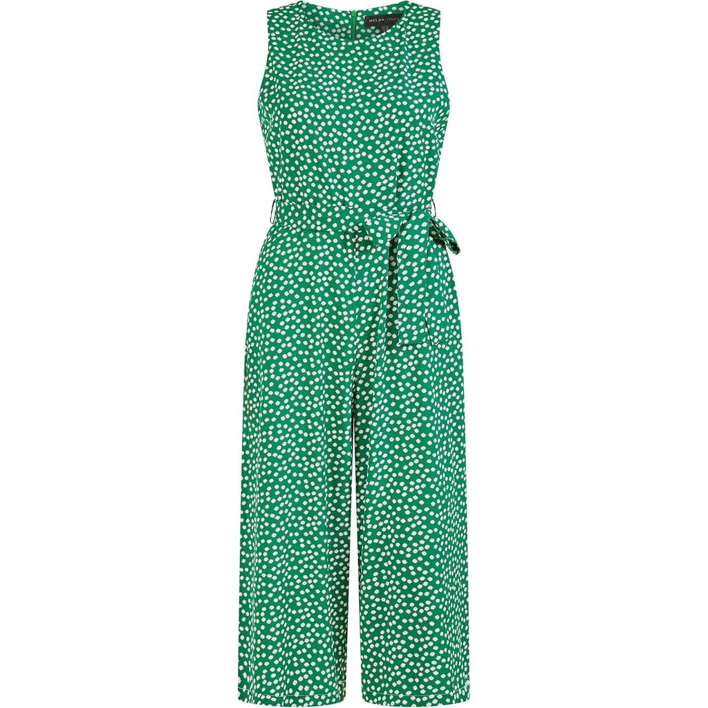 Jump into summertime in the Mela Green Ditsy Daisy Sleeveless Culotte Jumpsuit. This jumpsuit features a self tie belt to define the waist, and cropped wide leg trousers. Designed to wear work to weekend, adding comfort and style to everyday. -