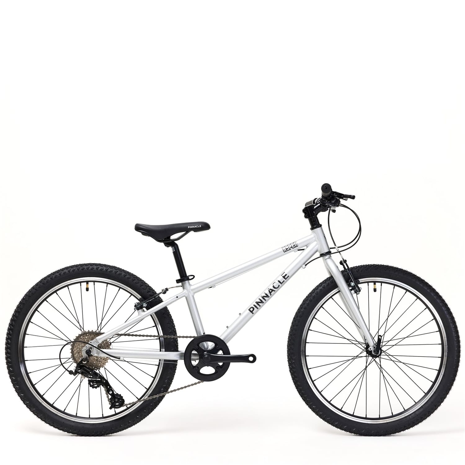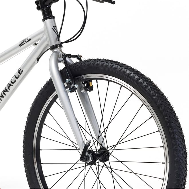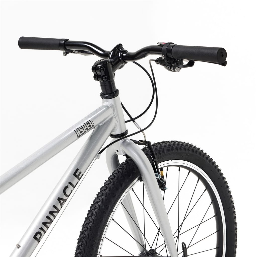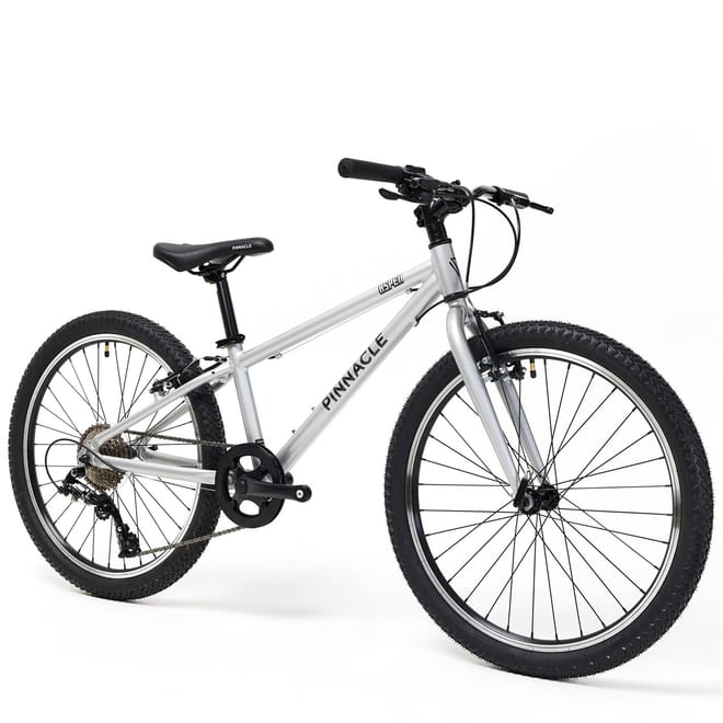 Ready for adventure, the Pinnacle Aspen 24 Bike Junior combines durability, style, and performance for young riders aged 7 to 11. Perfect for conquering neighbourhood streets or trails, it offers smooth handling and reliable features that build confidence on every ride. Lightweight Aluminum Frame: Crafted for durability without the extra weight, the Aspen 24 features a robust aluminum frame that ensures easy manoeuvrability and long-lasting strength. 24-inch Wheels: The ideal size for young riders, these wheels offer a smooth ride over a variety of terrains, from paved roads to bumpy trails. 8-Speed Thumb Shifter Gears: With an 8-speed thumb shifter, the Aspen 24 makes gear changes easy and smooth, allowing for effortless shifting on hills or flat surfaces. Suitable for ages 7 - 11 years old. Minimum inseam measurement 58cm Rims: 24 Alloy Rims, 32h. Tyres: 24 X 1.90 Rubber Tires Shifter: 8 speed Pinnacle Rear Derailleur: 8 speed Pinnacle Crankset: 36t Chainset with integrated chain guard. Cassette: 11-32t 8-Speed Pinnacle Cassette Bottom Bracket: 68mm BB Handlebar: 600mm width x 20mm rise, 6 degree backsweep. Stem: 60mm extension stem 15 deg rise. . Grips: Soft 120m, with plugs. Brakes: V-brake Seatpost: 27.2 X 300mm Seatpost with Quick release clamp. -