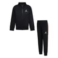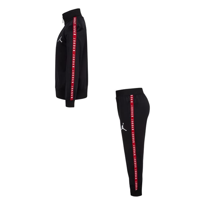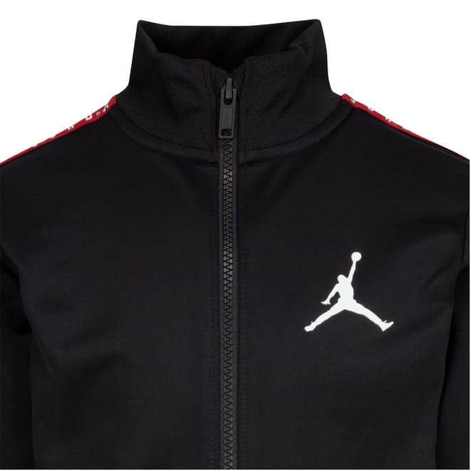 This Air Jordan full track suit for infants combines style and comfort. Featuring a funnel neck and long plain sleeves, the sweatshirt is adorned with a logo, adding a touch of brand identity. The set includes track-style bottoms, perfect for activewear collections. Ideal for little ones, this ensemble offers a seamless blend of casual and athletic appeal. -