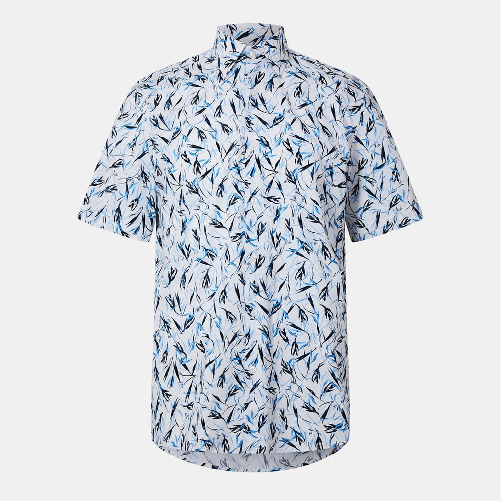 This Boss top features a floral pattern and a point collar, offering a stylish touch to your wardrobe. The short sleeves and button closure provide a classic look, while the logo embellishment adds a subtle brand detail. -