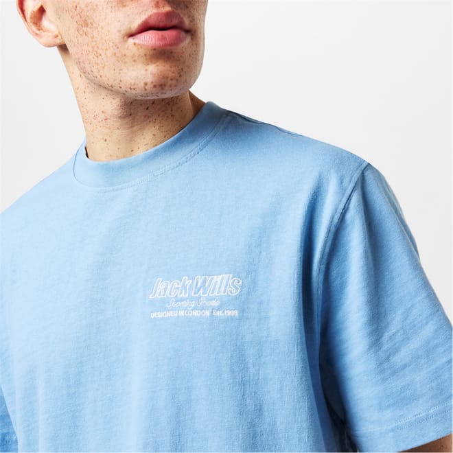 This Jack Wills top is a casual staple featuring a regular fit and short sleeves. The crew neck design is complemented by a graphic print with lettering, adding a stylish touch. The top is adorned with the brand's logo, making it a distinctive choice for everyday wear. -
