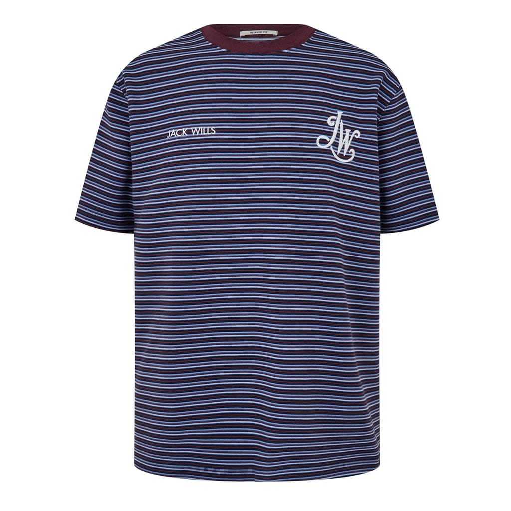 This Jack Wills top features a classic stripe pattern, perfect for casual collections. Designed with a regular fit, it offers a comfortable crew neck and short sleeves. The top is adorned with a logo and lettering graphic, adding a touch of brand identity to your wardrobe. -
