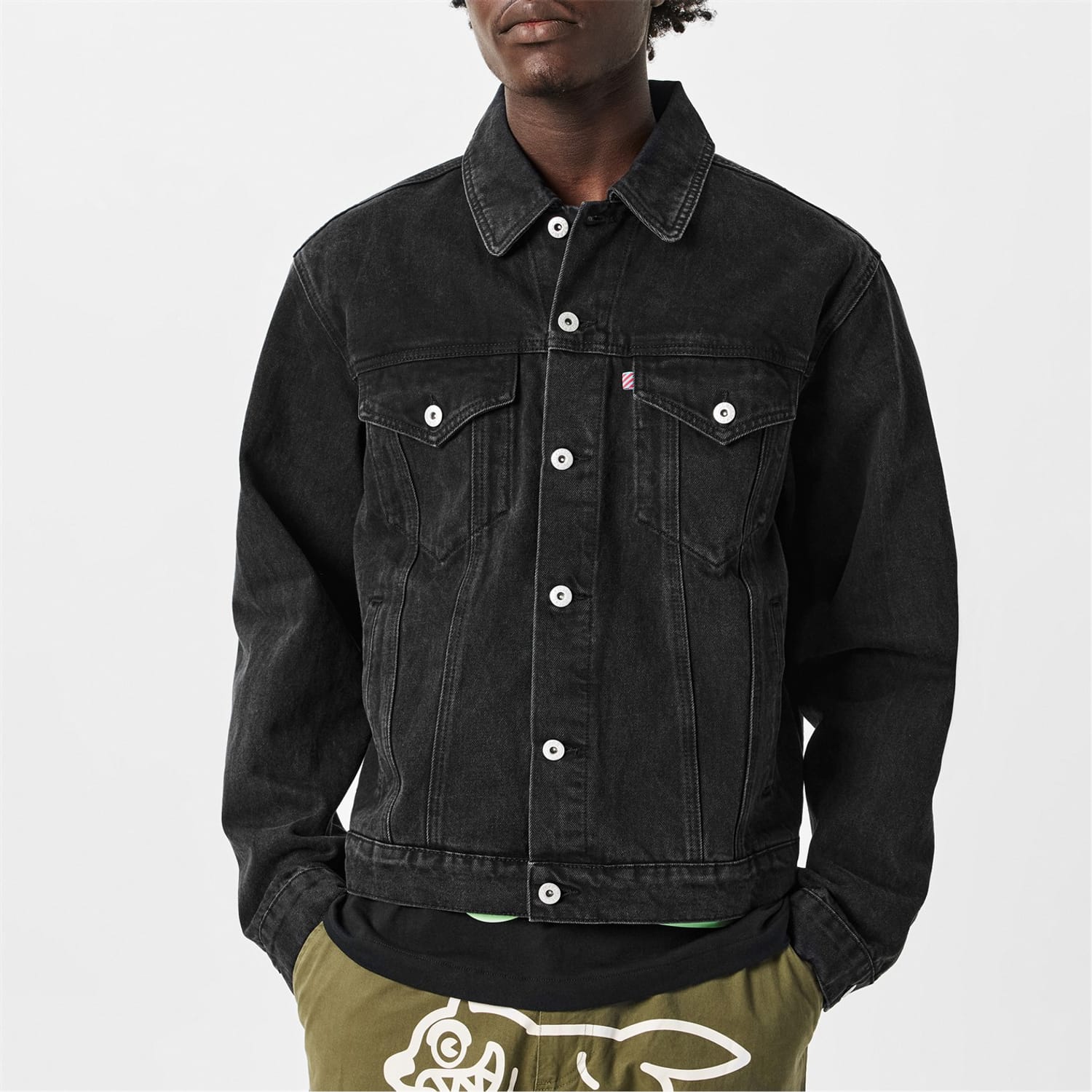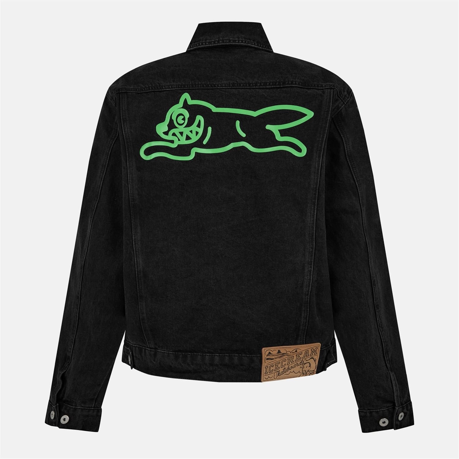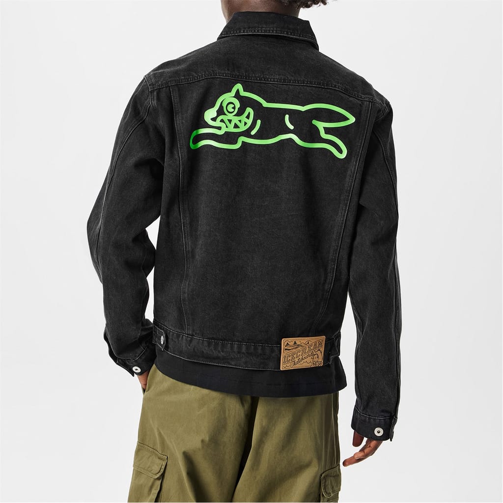 This Icecream denim jacket features a playful dog graphic, adding a unique touch to your wardrobe. The jacket is designed with long sleeves, making it a versatile piece for various occasions. Crafted with attention to detail, it combines style and comfort effortlessly. -