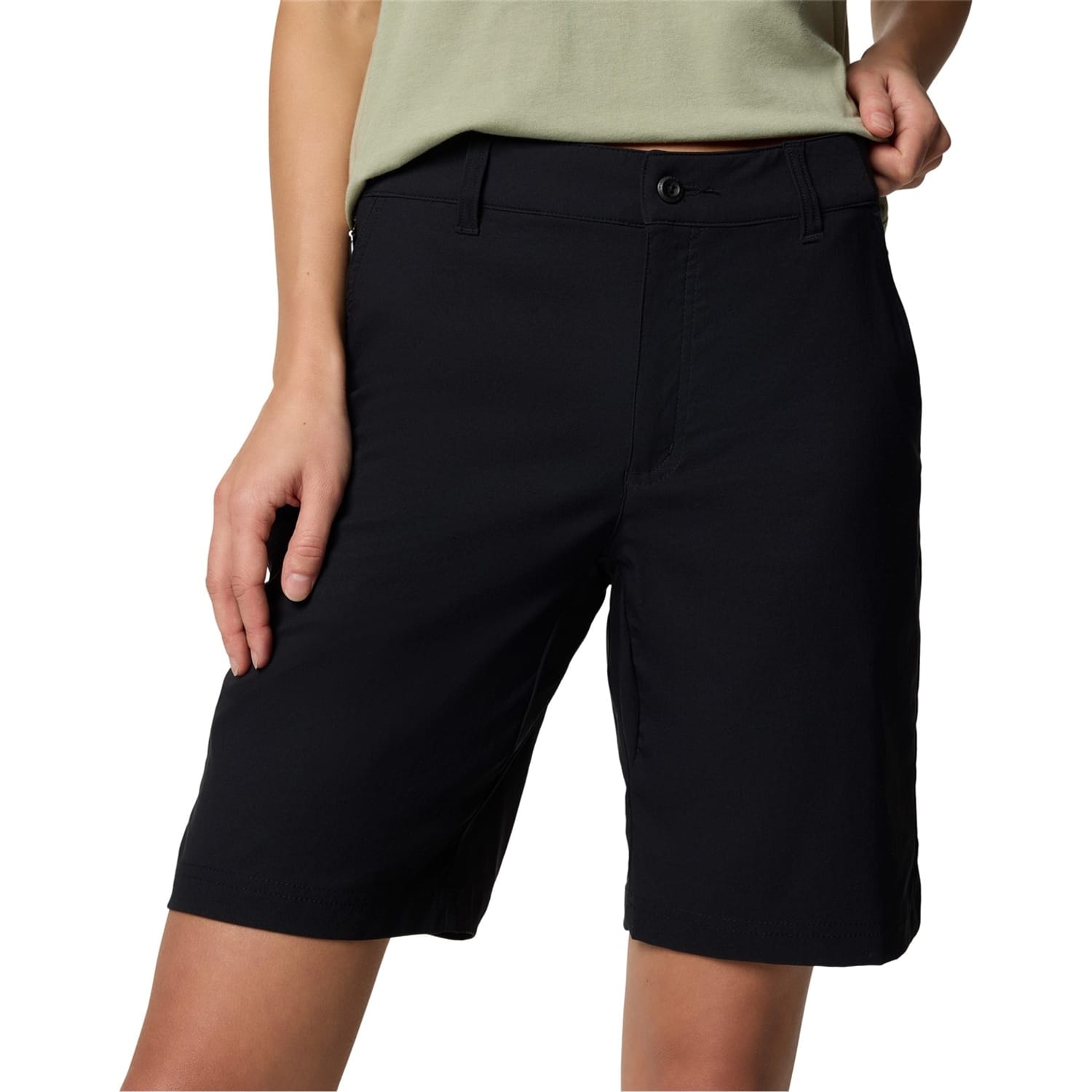 Columbia shorts designed for both casual and athletic pursuits. These solid bermuda shorts feature a zip fly closure and are adorned with a logo. Practicality is enhanced with side and back pockets, making them ideal for walking and casual collections. -