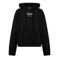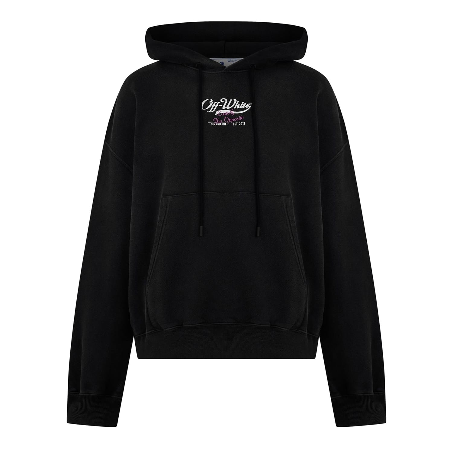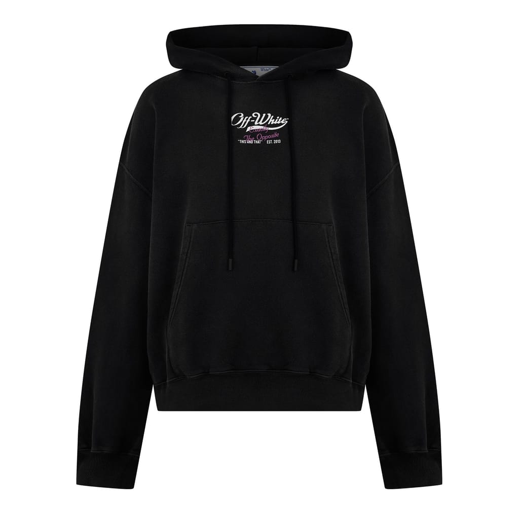 This Off-White hoodie sweatshirt features a relaxed fit with a drawstring hood. The long sleeves have a stylish drop shoulder design and ribbed cuffs. Embellished with an embroidered front logo, it offers a fashionable touch to your wardrobe. -