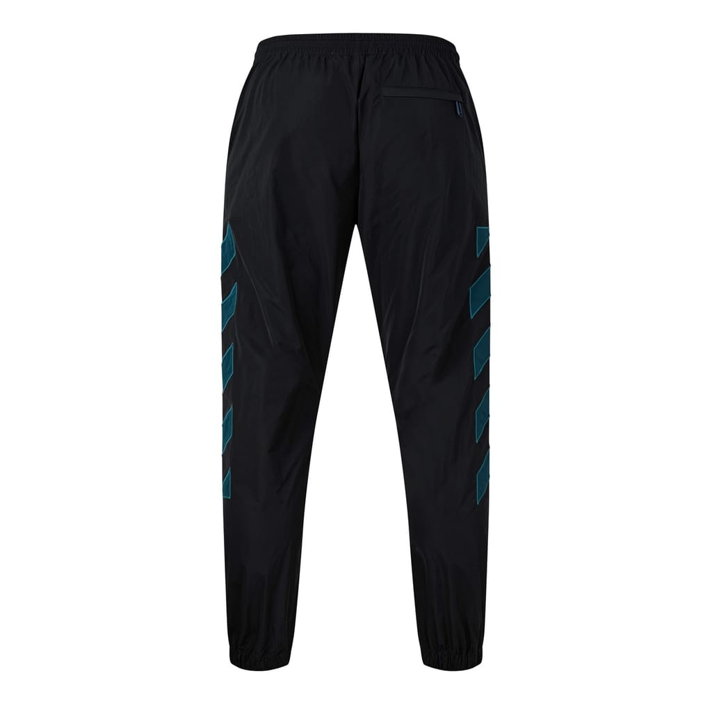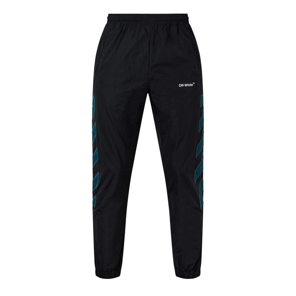 Off White joggers feature an elasticated waistband for comfort and a stylish color block pattern. The design is enhanced with side stripes and a distinctive logo, making these joggers a standout choice for casual wear. -