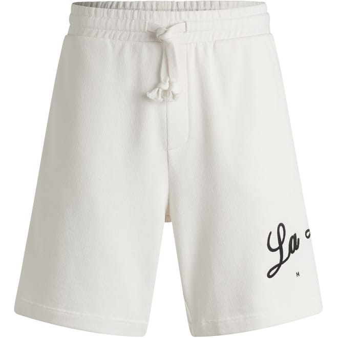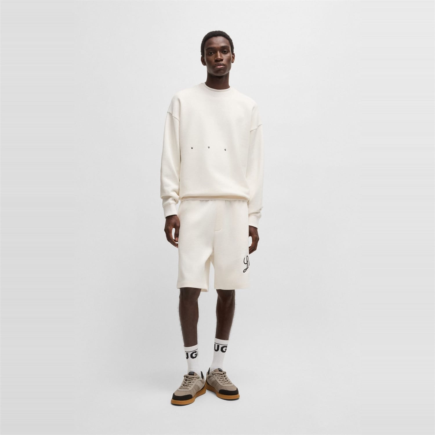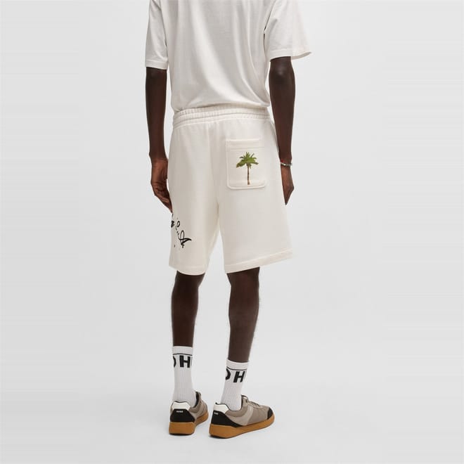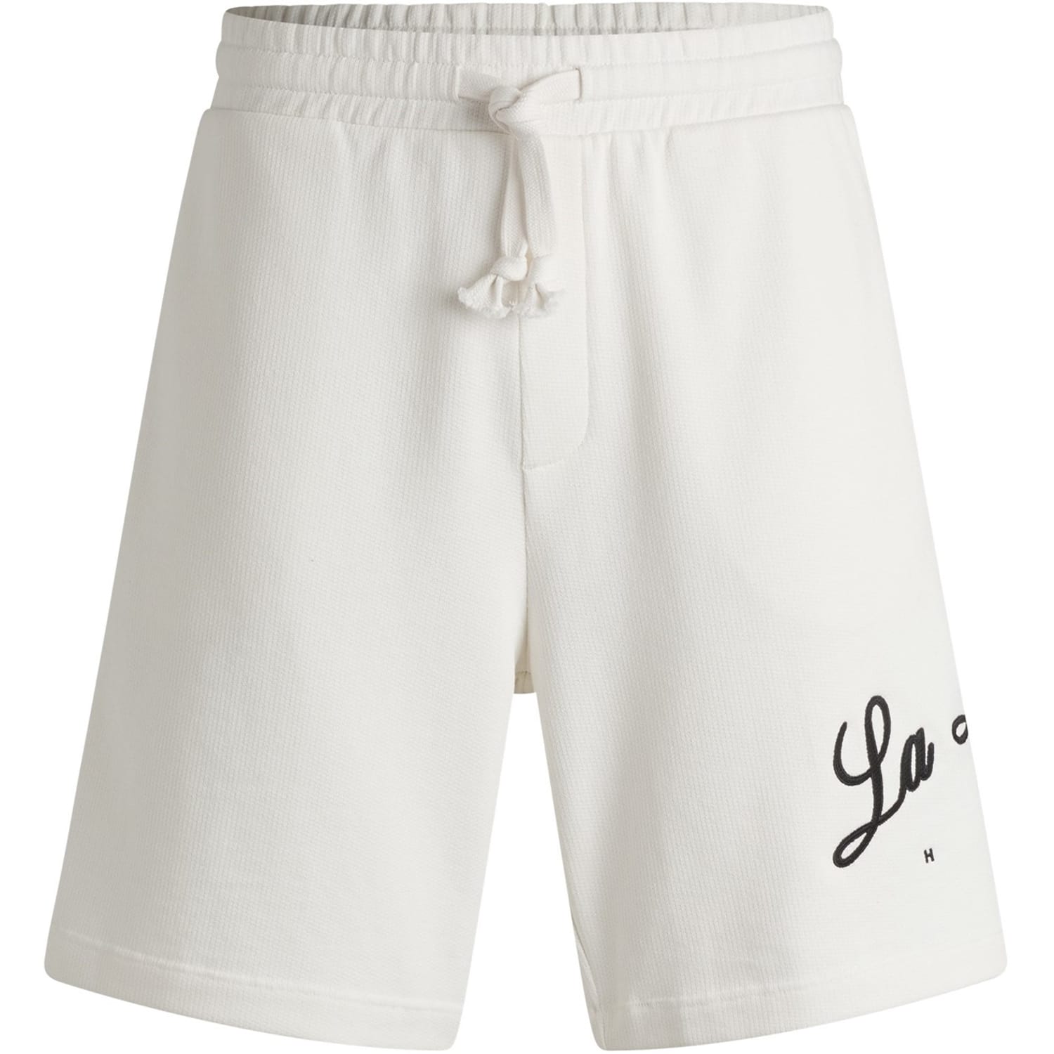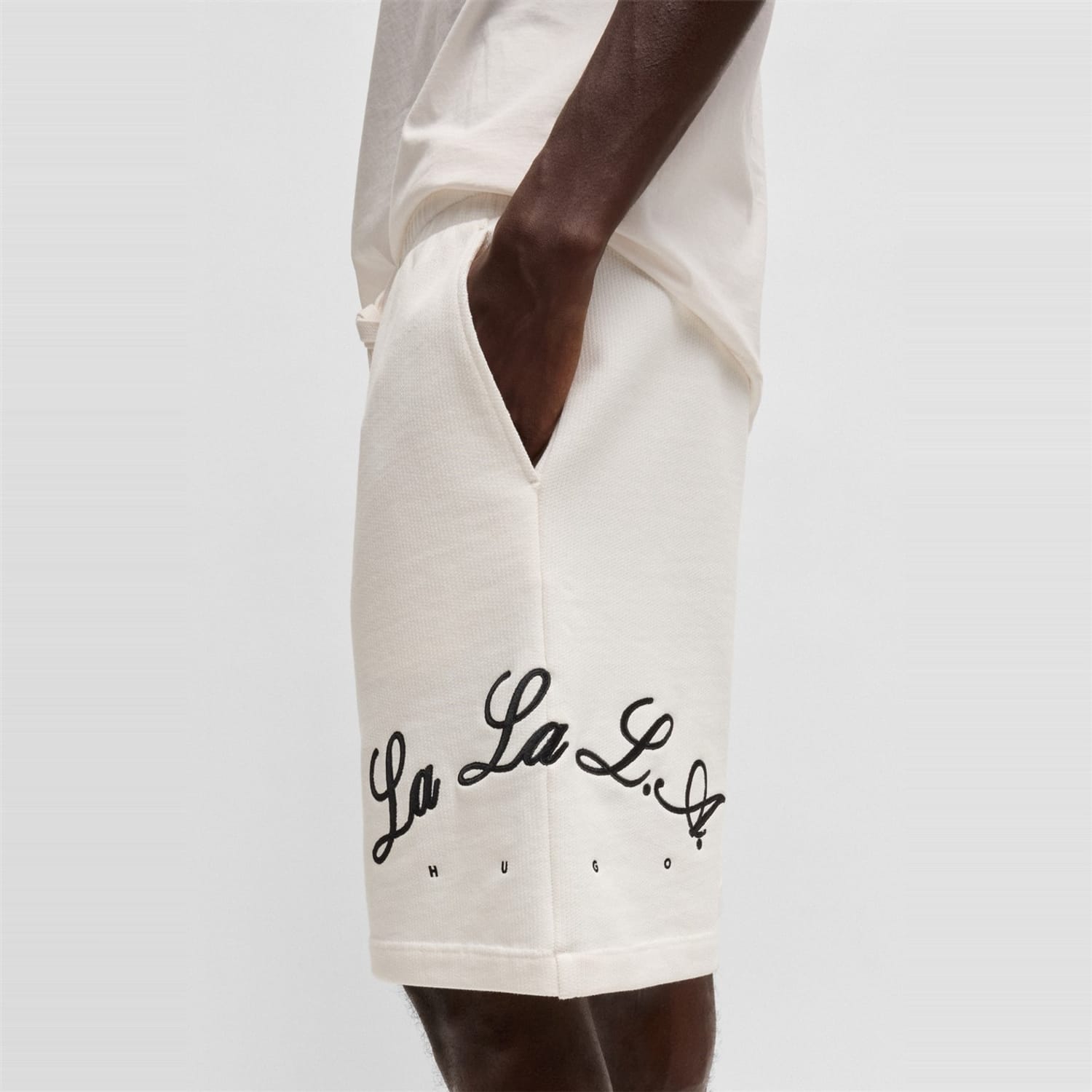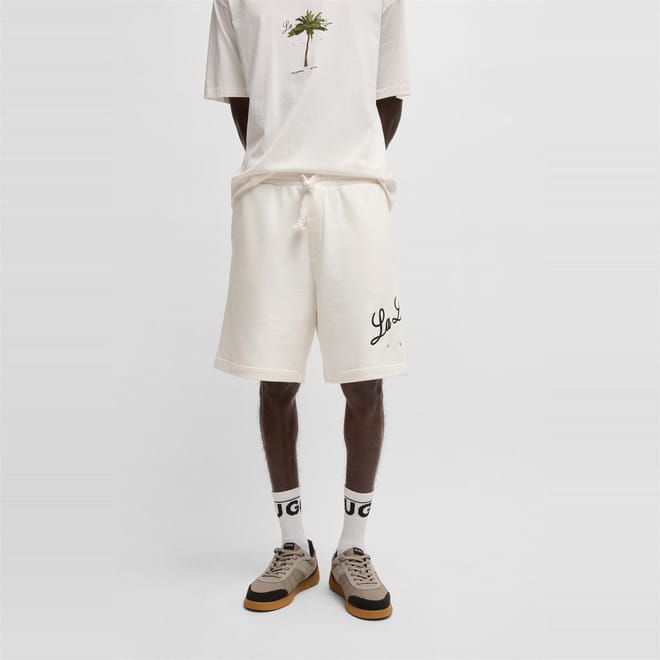 These Hugo sweat shorts are a perfect blend of style and comfort. Featuring a solid pattern, they come with a drawstring closure for a secure fit. The shorts are adorned with a logo and lettering graphic, adding a touch of flair. Practical pockets enhance functionality, making them ideal for casual collections. -
