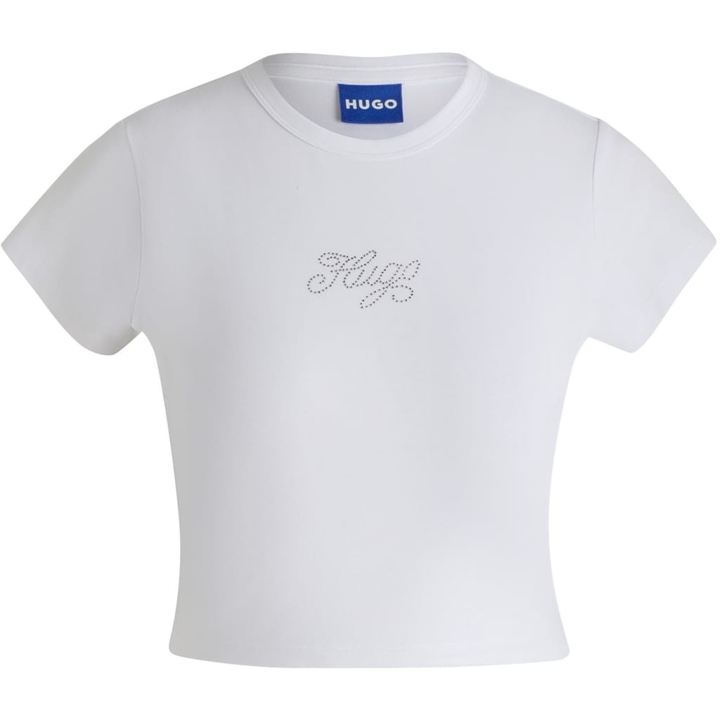 This Hugo cropped top features a solid pattern and a crew neck, offering a sleek and modern look. The short sleeves and slim fit ensure a flattering silhouette, while the logo embellishment adds a touch of brand identity. -