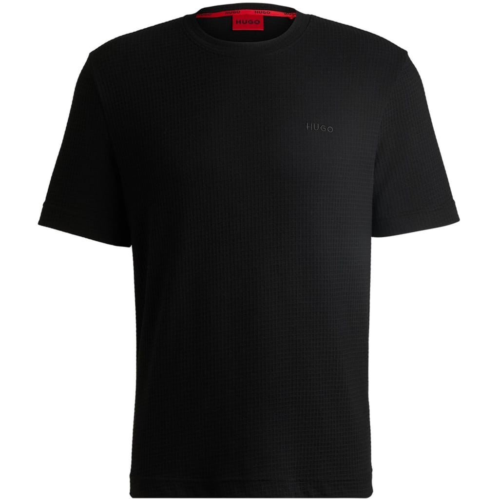 This Hugo top is perfect for casual wear, featuring a waffle pattern and a crew neck. Designed with short sleeves and a regular fit, it offers comfort and style. The top is adorned with a subtle logo, making it suitable for summer and all-season wear. -
