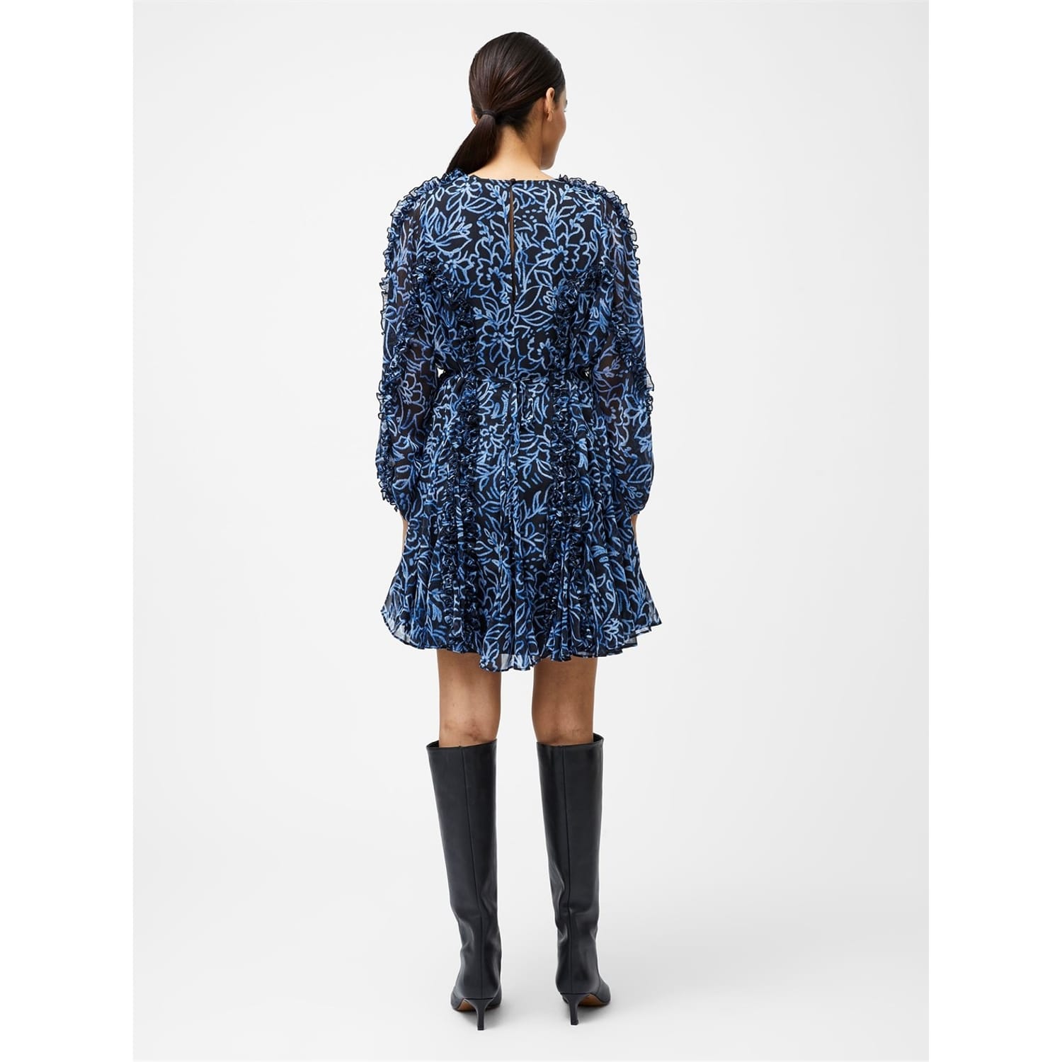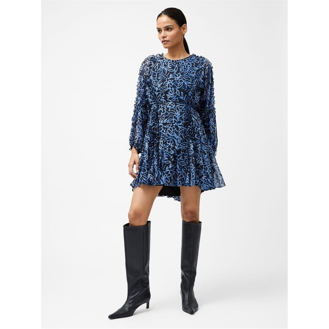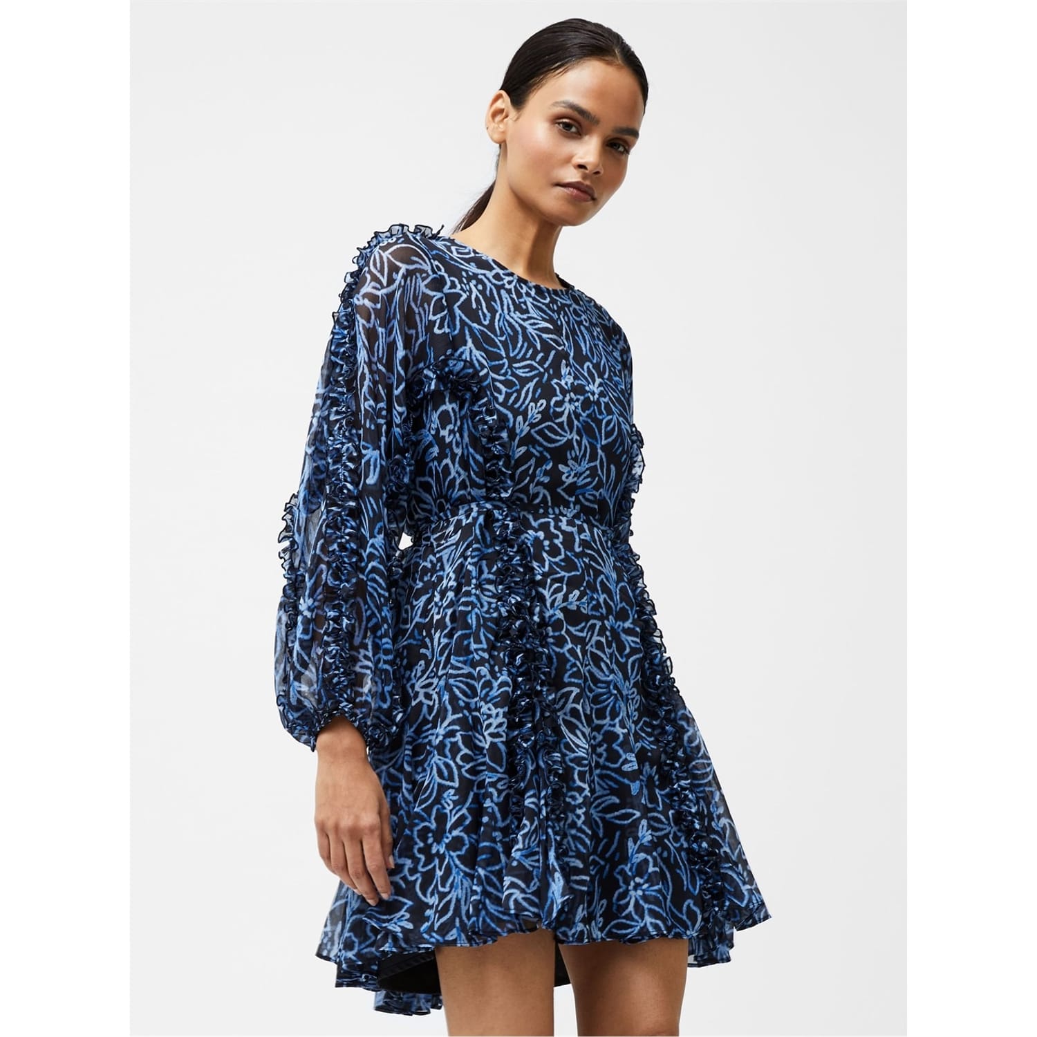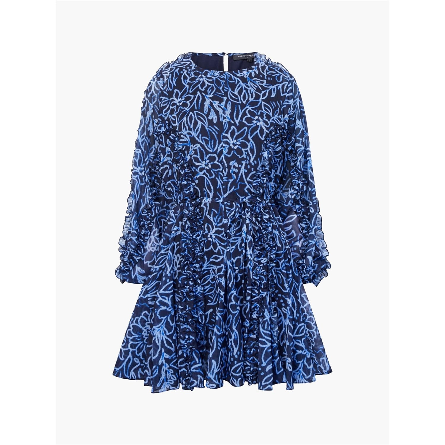 This French Connection mini dress features a charming floral pattern and a classic crew neck. The long puff sleeves add a touch of elegance, while the ruffle embellishments enhance its feminine appeal. Designed in an A-line style, this dress offers a flattering silhouette perfect for various occasions. -