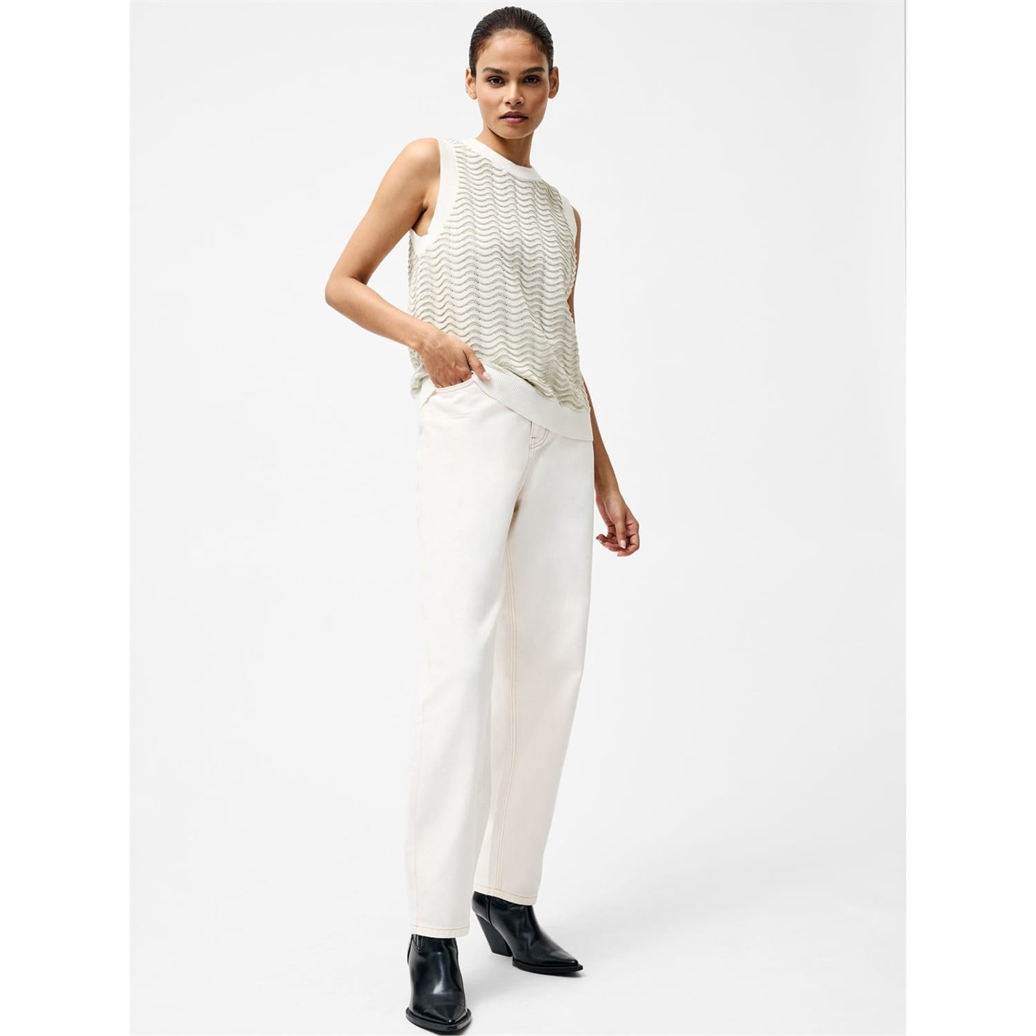 Discover the French Connection sleeveless top, featuring a relaxed fit and a stylish wave pattern. This knit design includes a crew neck and a practical pocket, offering both comfort and functionality. Perfect for those seeking a blend of casual elegance and unique style. -
