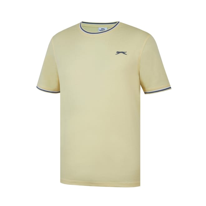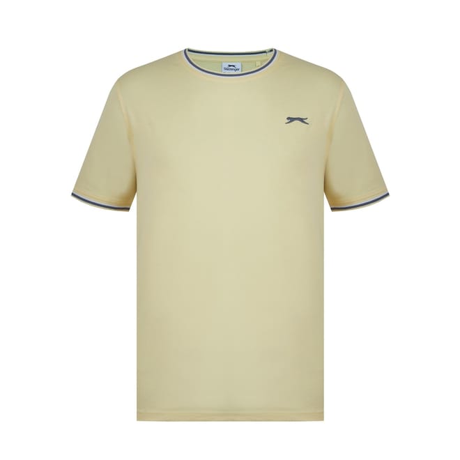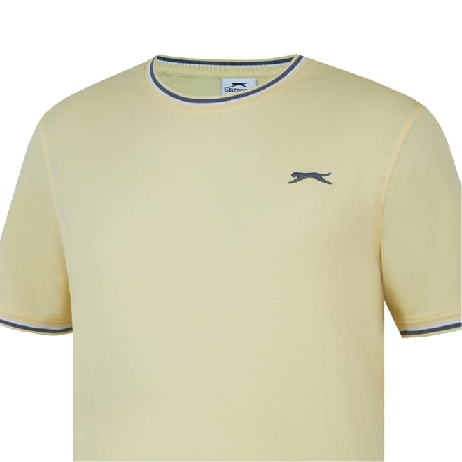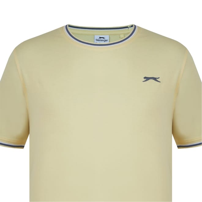 - This Slazenger Tipped T Shirt features short sleeves with a ribbed cuff with tipping for a colour pop. Tipped crew neckline with tipping for a classic look. Comfortable fit and is a lightweight construction. This t shirt is designed with an embroidered 3D logo to the chest for signature Slazenger branding.