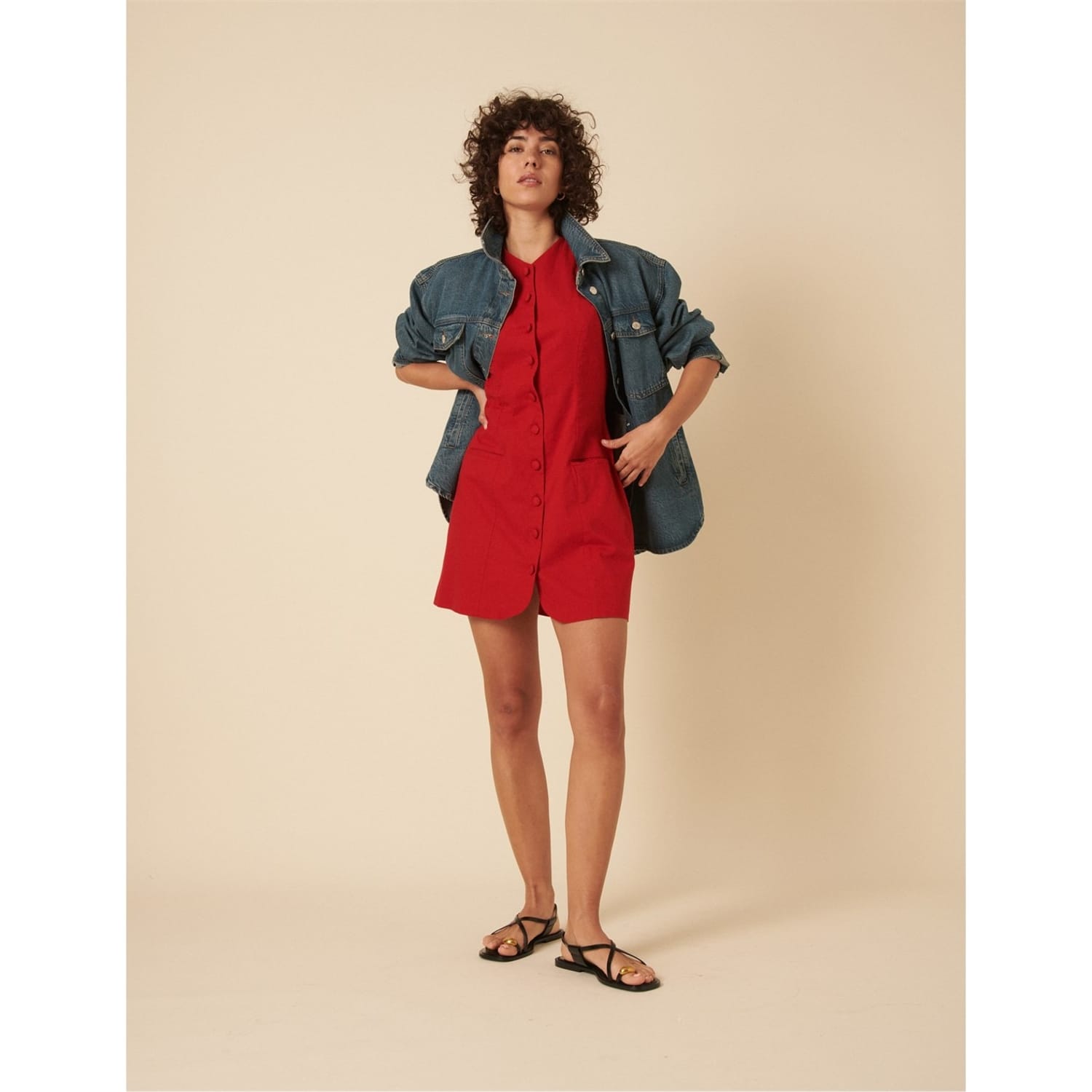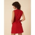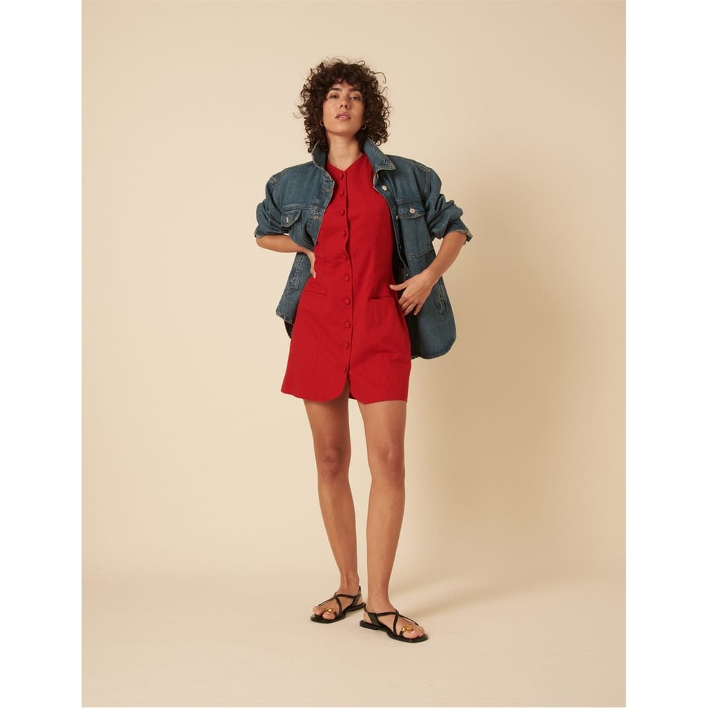 This mini dress from Nobody's Child features a classic A-line style with a V-neck and a straight hem. The solid pattern adds a timeless touch, while the button closure and pocket embellishments provide practical details. -