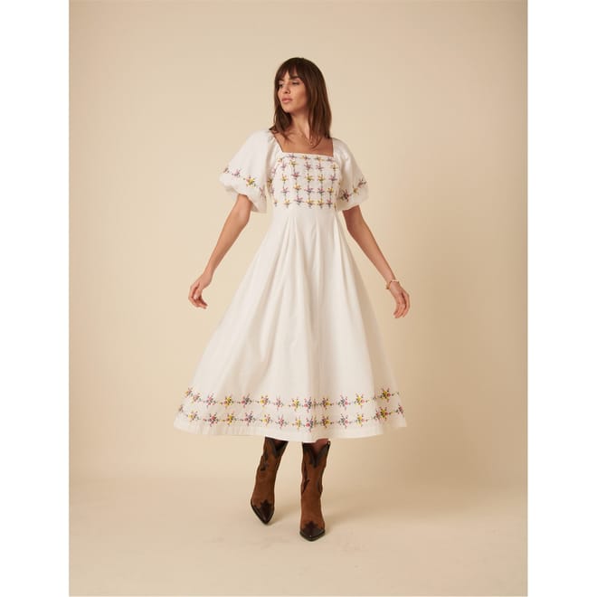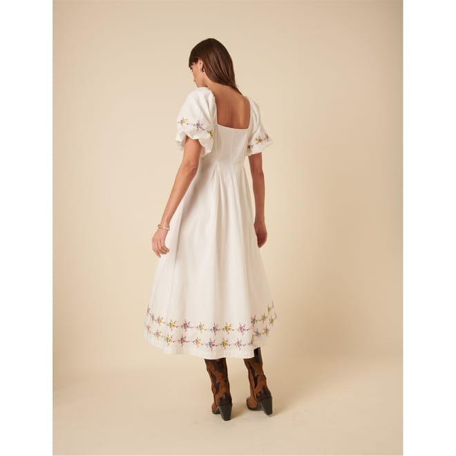 Discover the charm of Nobody's Child with this elegant midi dress. Featuring a floral pattern and floral embroidery, this A-line dress is designed with a square neckline and puff sleeves. Perfect for adding a touch of sophistication to your wardrobe. -