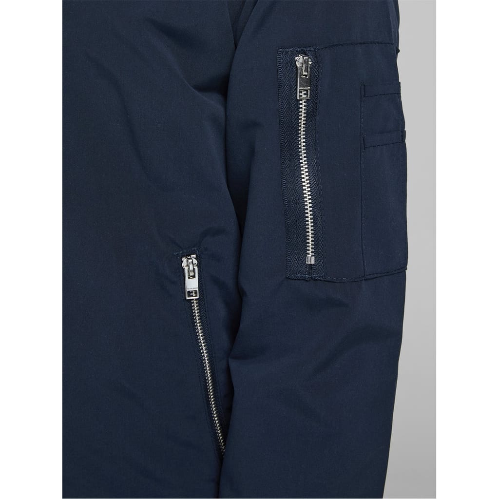 The Jack & Jones bomber jacket features a classic bomber collar and a regular fit, perfect for a stylish look. Crafted in a solid pattern, this short jacket includes a convenient zipper closure. The design is enhanced with functional pockets, including zipped pockets, providing practicality without compromising style. -
