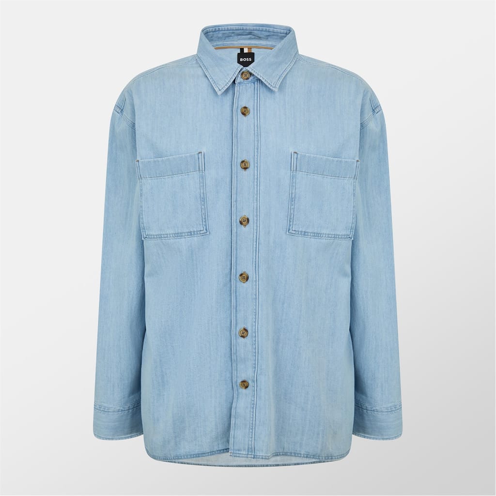 This Boss top features a relaxed fit with long sleeves and a solid pattern. It includes a button closure and a shirt collar, complemented by a practical chest pocket. -