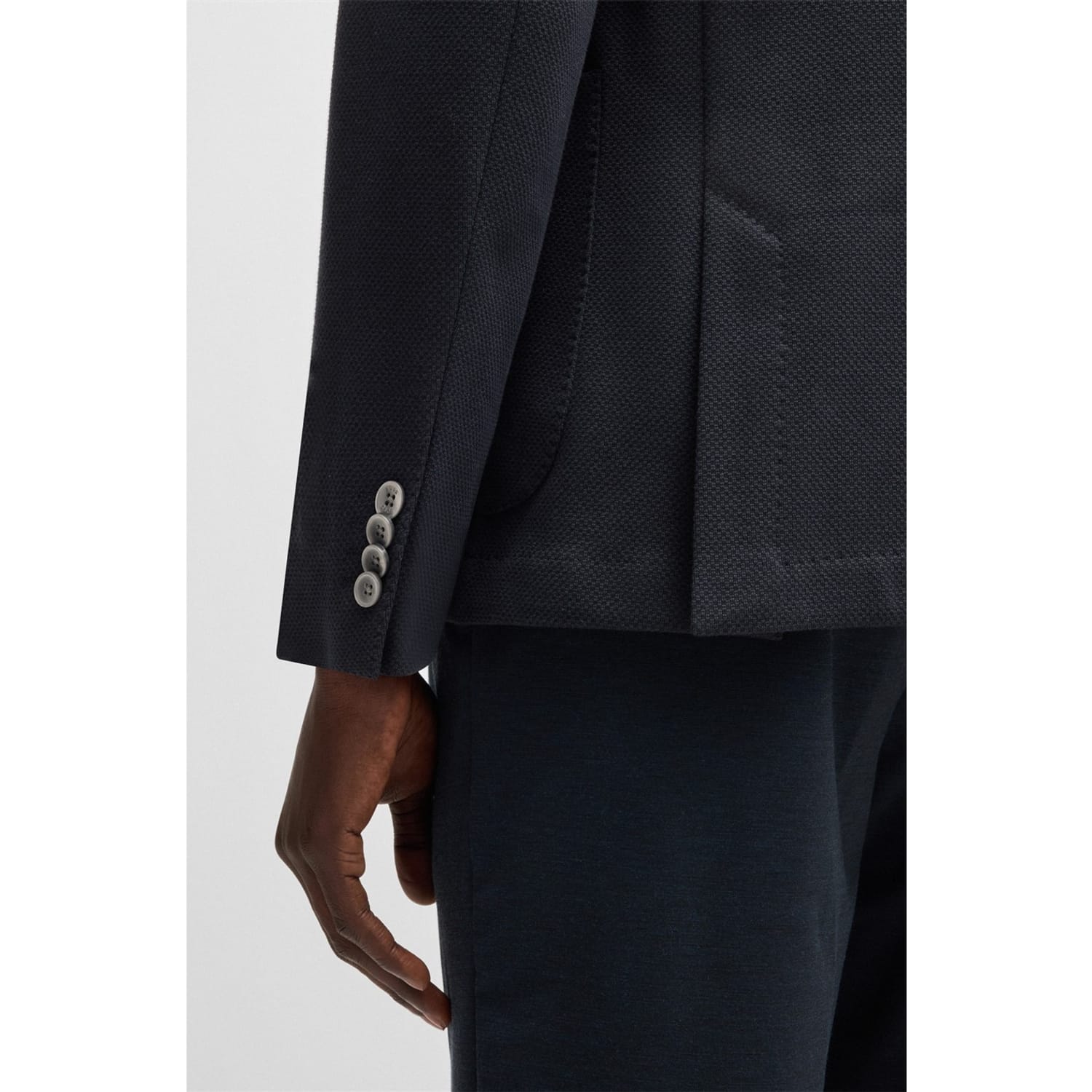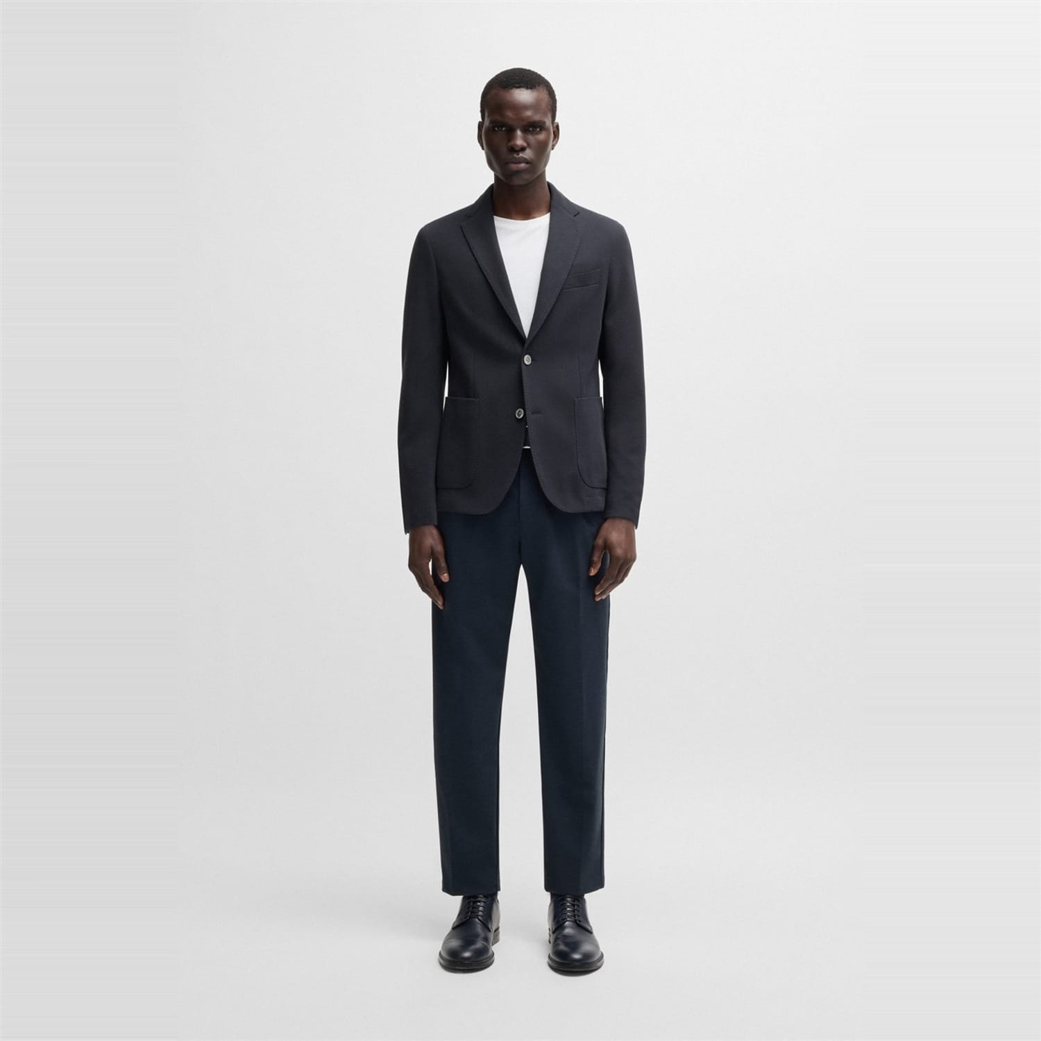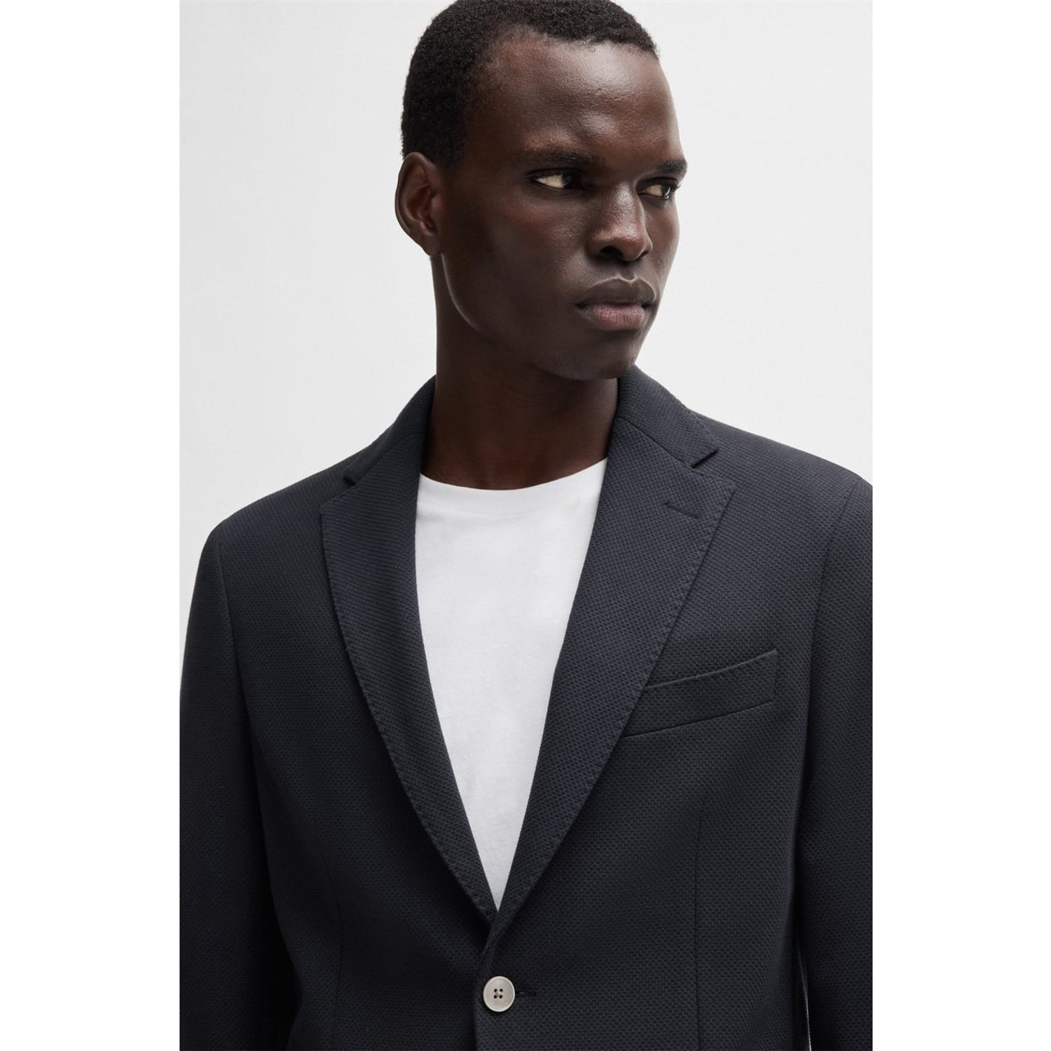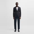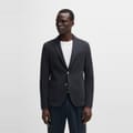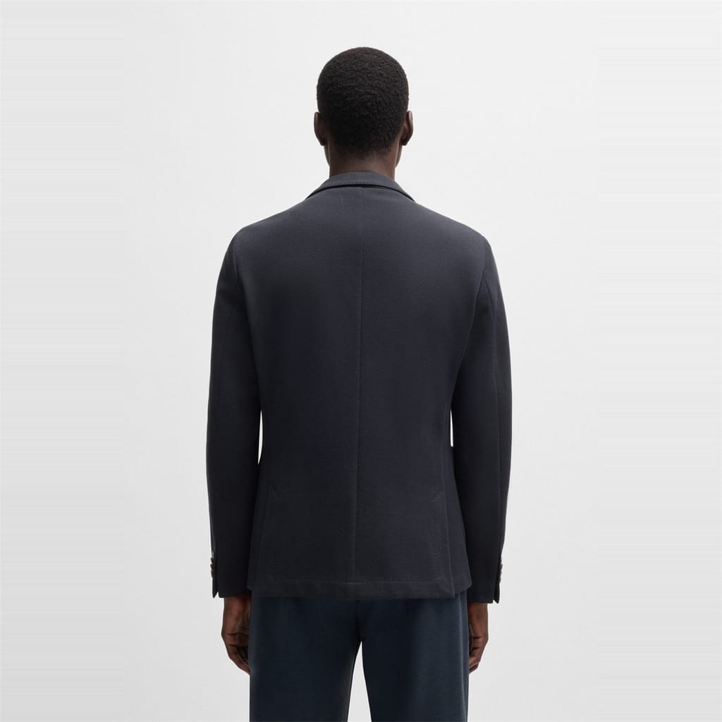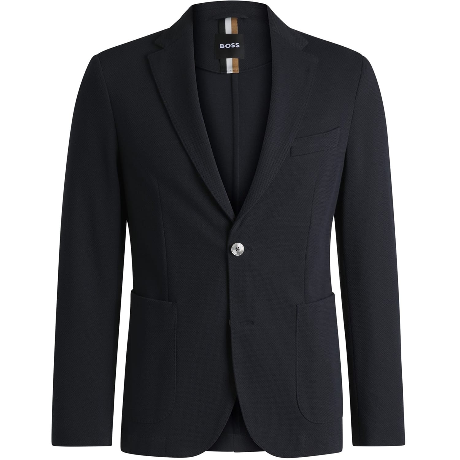 This Boss suit jacket features a notch collar and a straight hem, offering a regular fit. The solid pattern is complemented by a button closure and practical pockets. A subtle logo embellishment adds a touch of brand identity. -