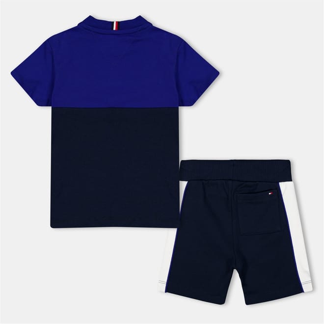 This Tommy Hilfiger top short set from the basic & essentials collection features a colour block pattern. The set includes a crew neck T-shirt with plain short sleeves and casual shorts. The T-shirt is adorned with a logo embellishment, adding a touch of brand identity to the ensemble. Perfect for a relaxed and stylish look. -