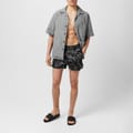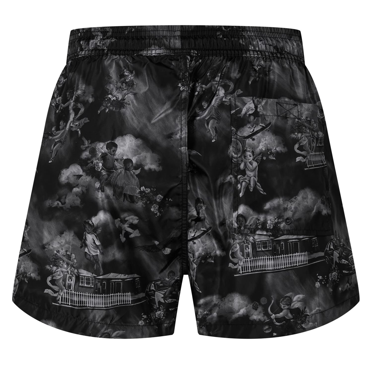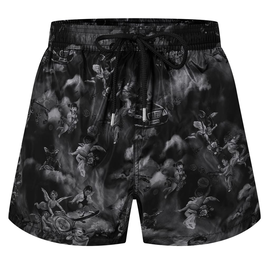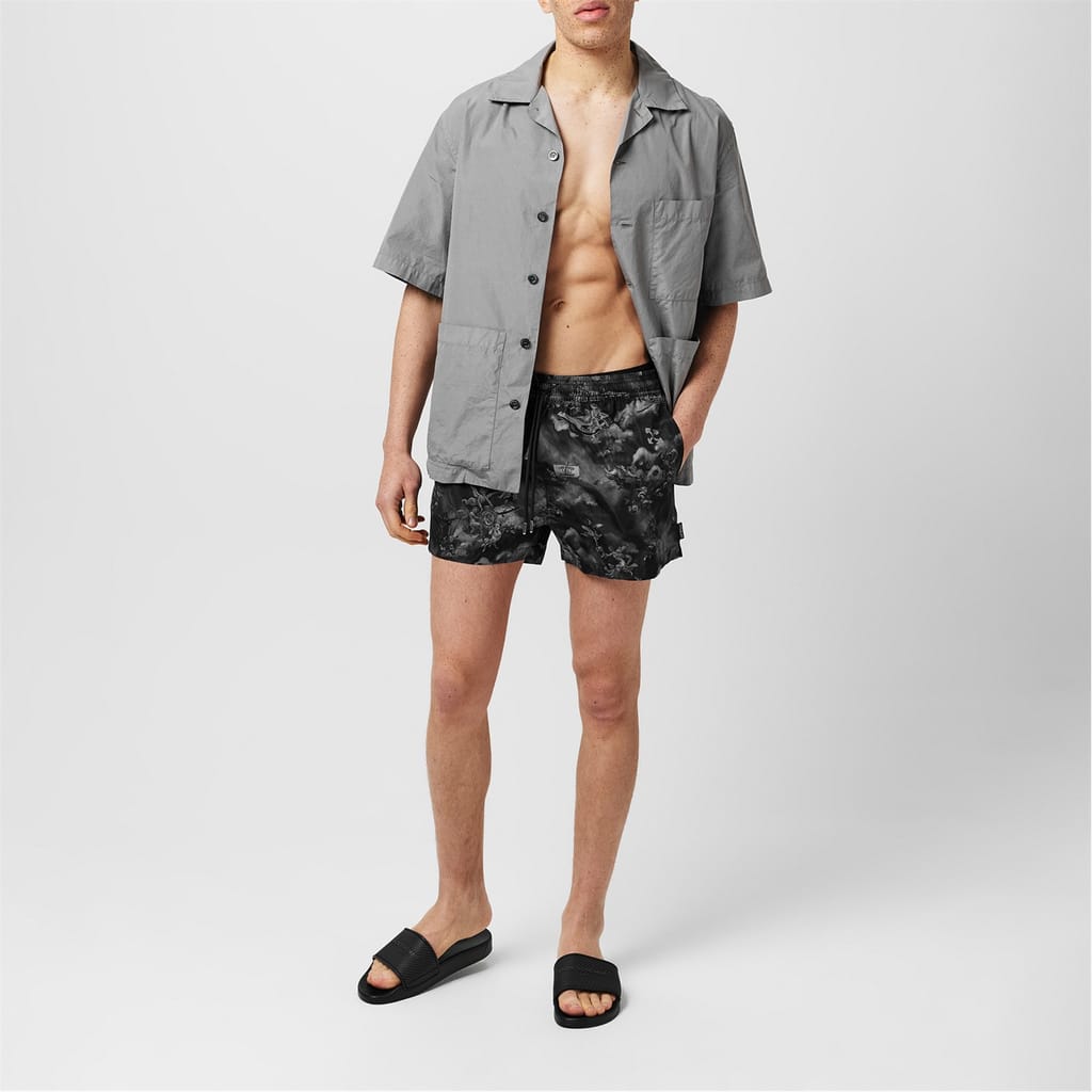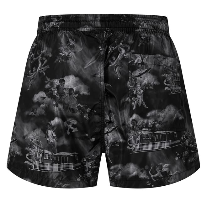 Off White swimwear swim bottom is designed for swimming enthusiasts. Featuring a graphic print pattern, it includes a drawstring closure for a secure fit. The swim bottom is embellished with a logo, adding a distinctive touch to its design. -