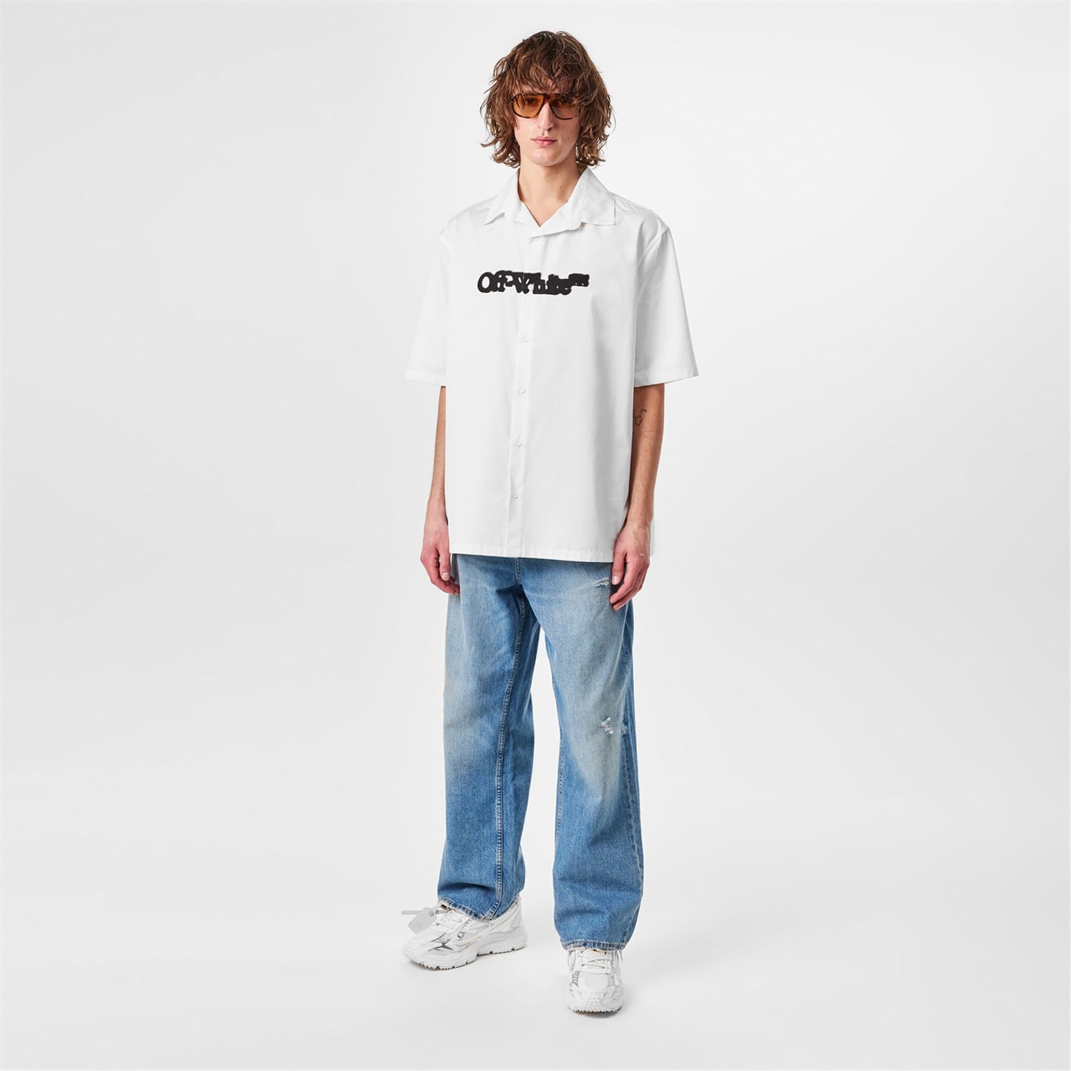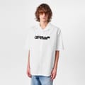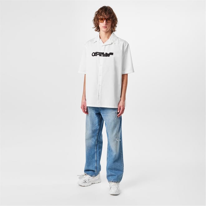 This Off White top features a relaxed fit with a shirt collar and short sleeves. The button-down closure adds a classic touch, while the graphic print and logo embellishment enhance its casual appeal. Perfect for those seeking a stylish yet comfortable option. -