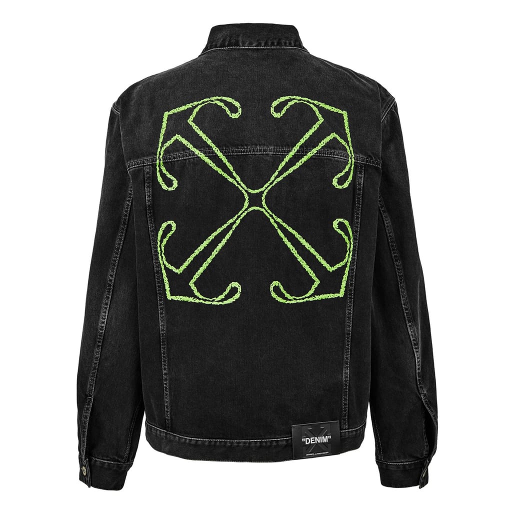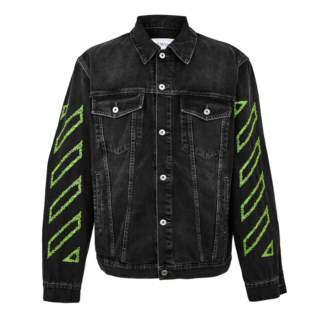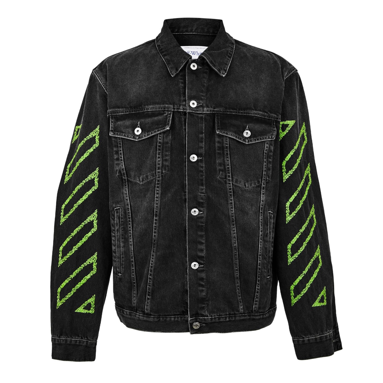 This Off-White denim jacket features a classic shirt collar and a straight hem. It is designed with a button closure and a regular fit, offering a comfortable and stylish look. The jacket is adorned with embroidered embellishments and a distinctive graphic print, adding a unique touch to your wardrobe. -