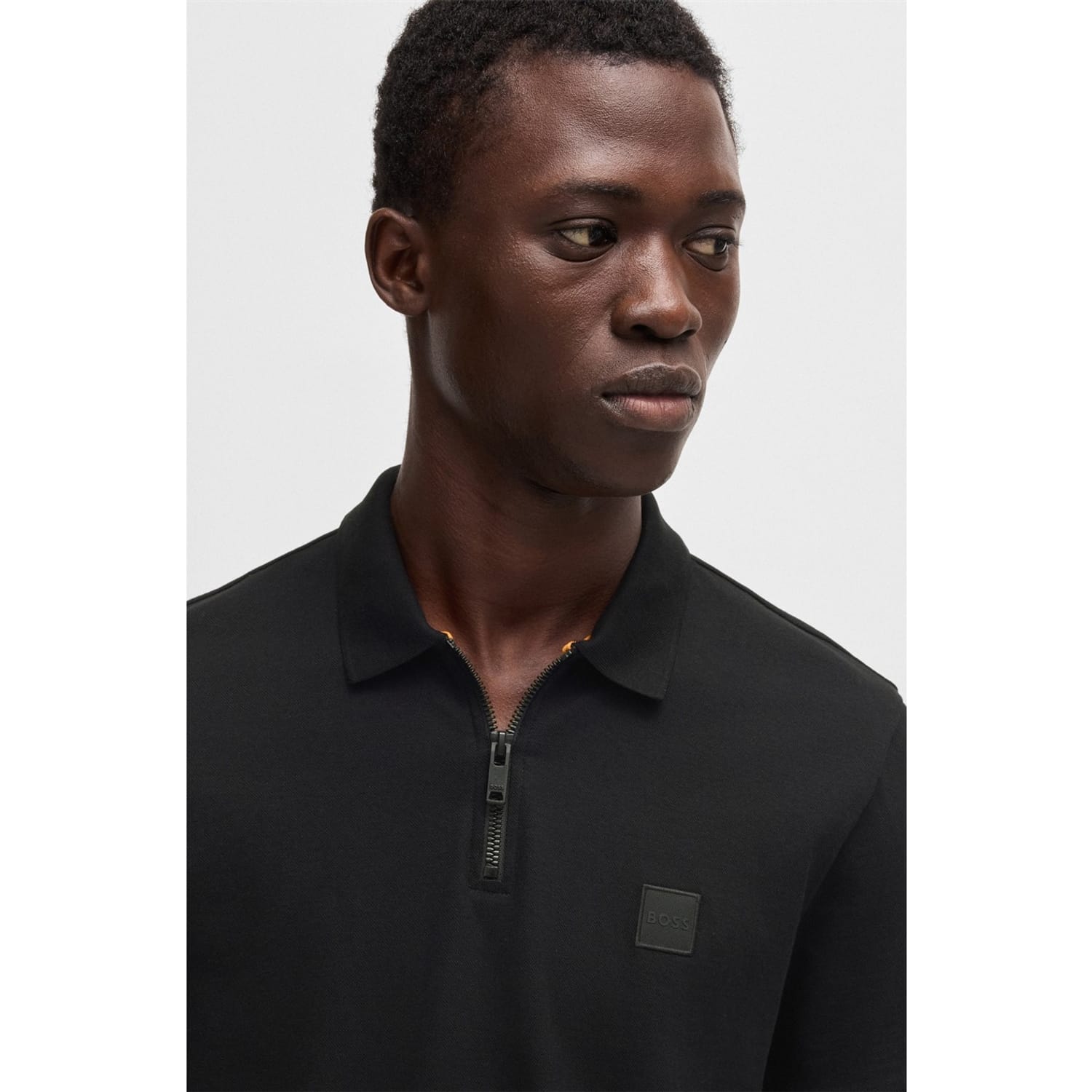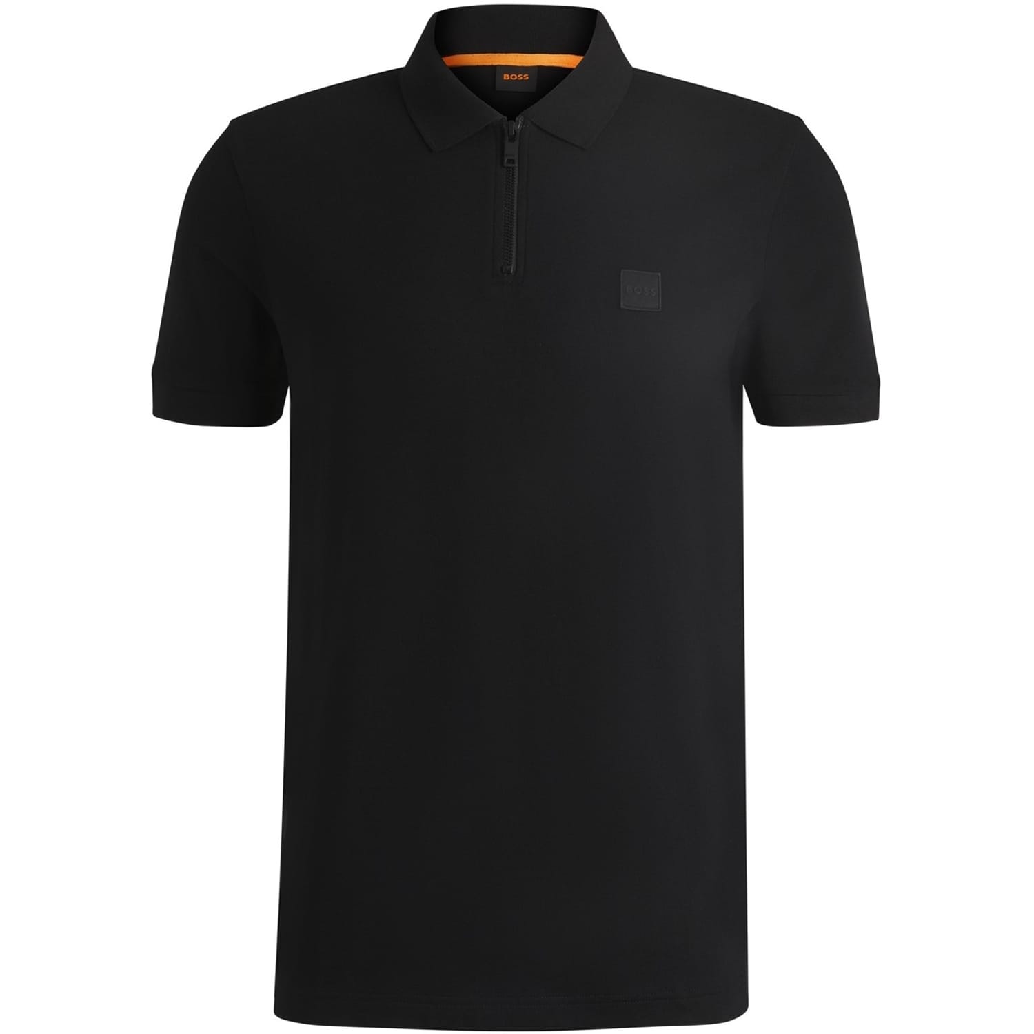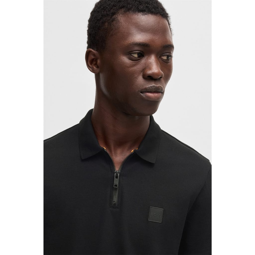 This Boss top features a classic polo collar and a solid pattern, offering a timeless look. The short sleeves and regular fit ensure comfort and style. A zipper closure adds a modern touch, while the logo embellishment subtly showcases brand identity. -