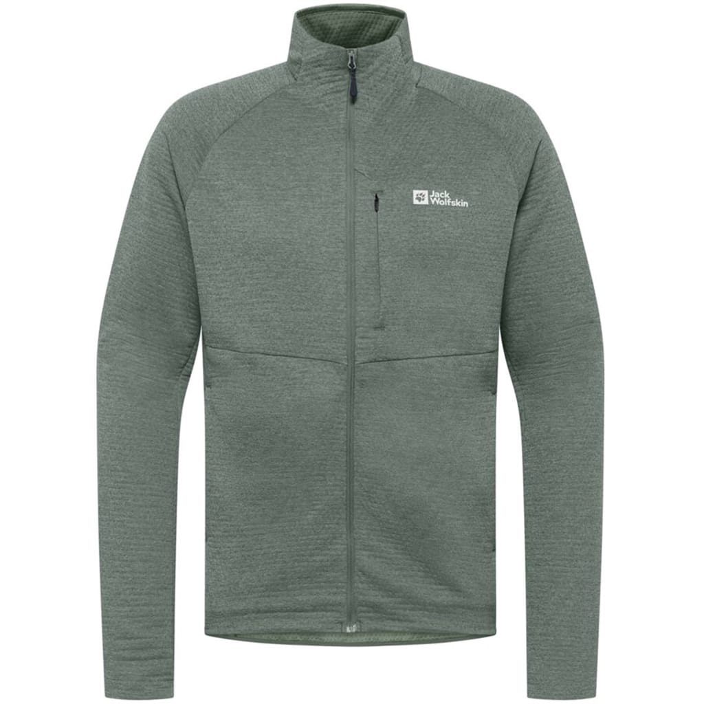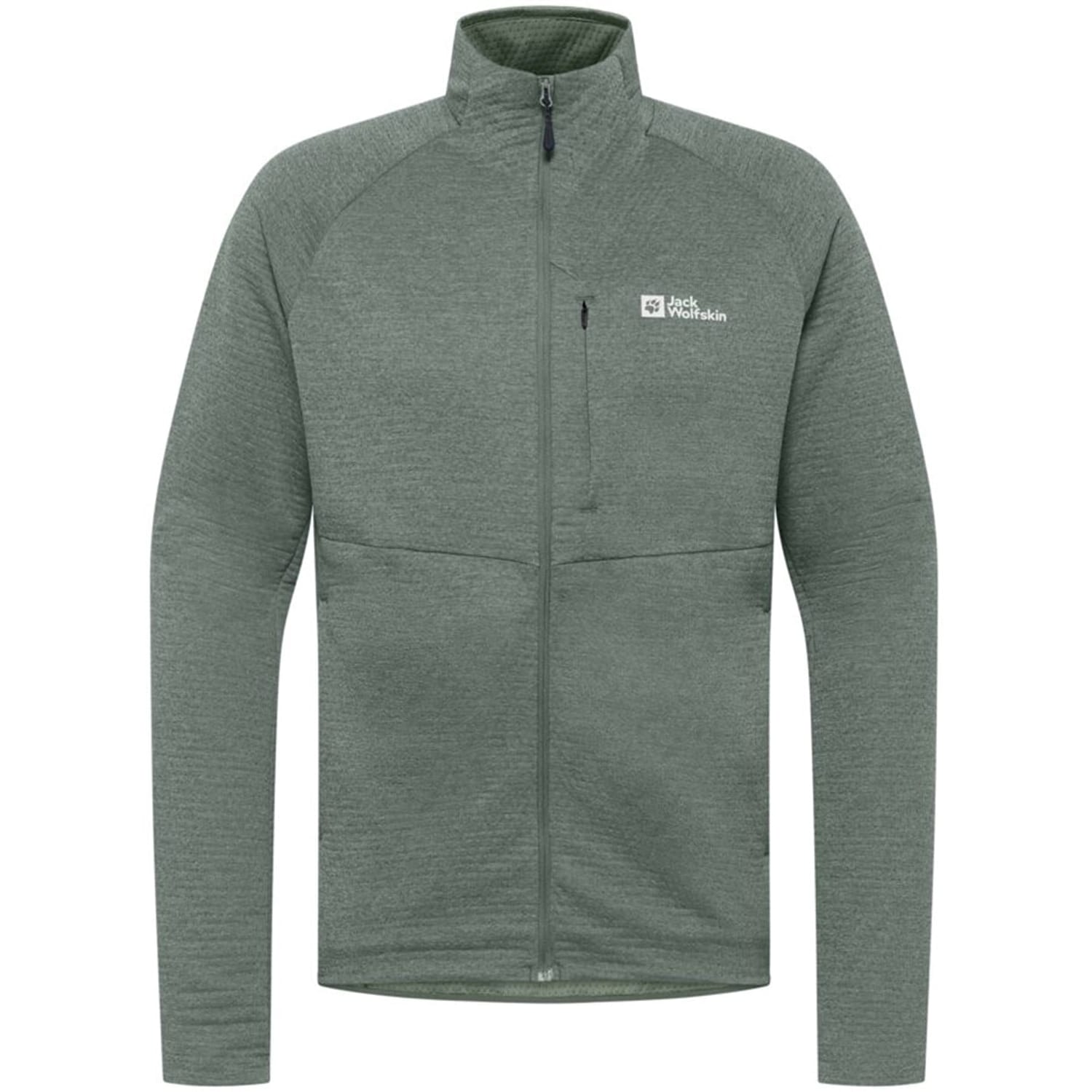 This Jack Wolfskin fleece jacket features a full zipper closure and a zip neck, offering a regular fit with a heathered pattern. The raglan sleeves and ribbed cuffs provide comfort and flexibility, while the straight hem adds a clean finish. Embellished with a logo and zipped pockets, this jacket combines functionality with style. -