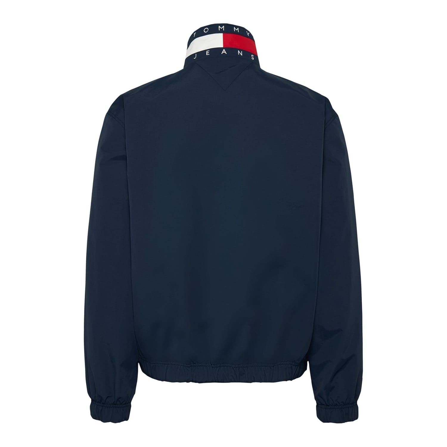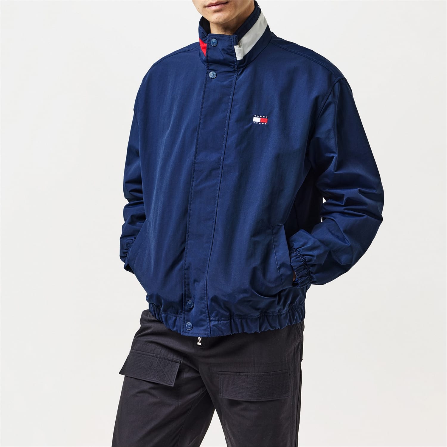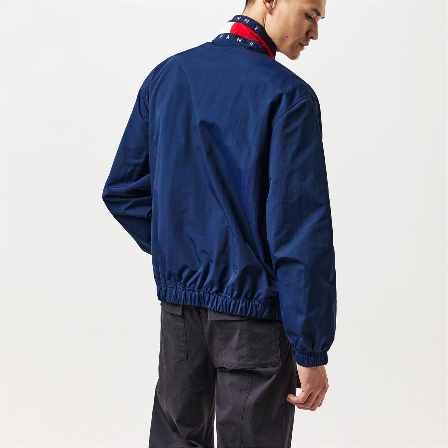This Tommy Jeans bomber jacket features a short length and a high collar, offering a classic silhouette. The jacket is designed with a regular fit and includes an elasticated hem and cuffs for added comfort. It has a solid pattern and is embellished with a logo. The jacket is equipped with a snap button and zipper closure for secure fastening. -