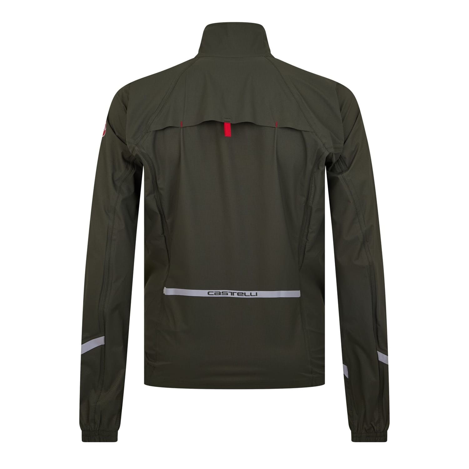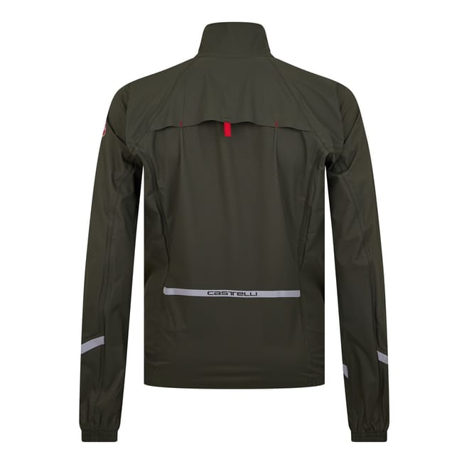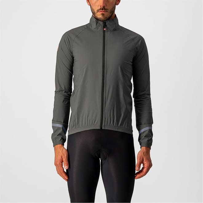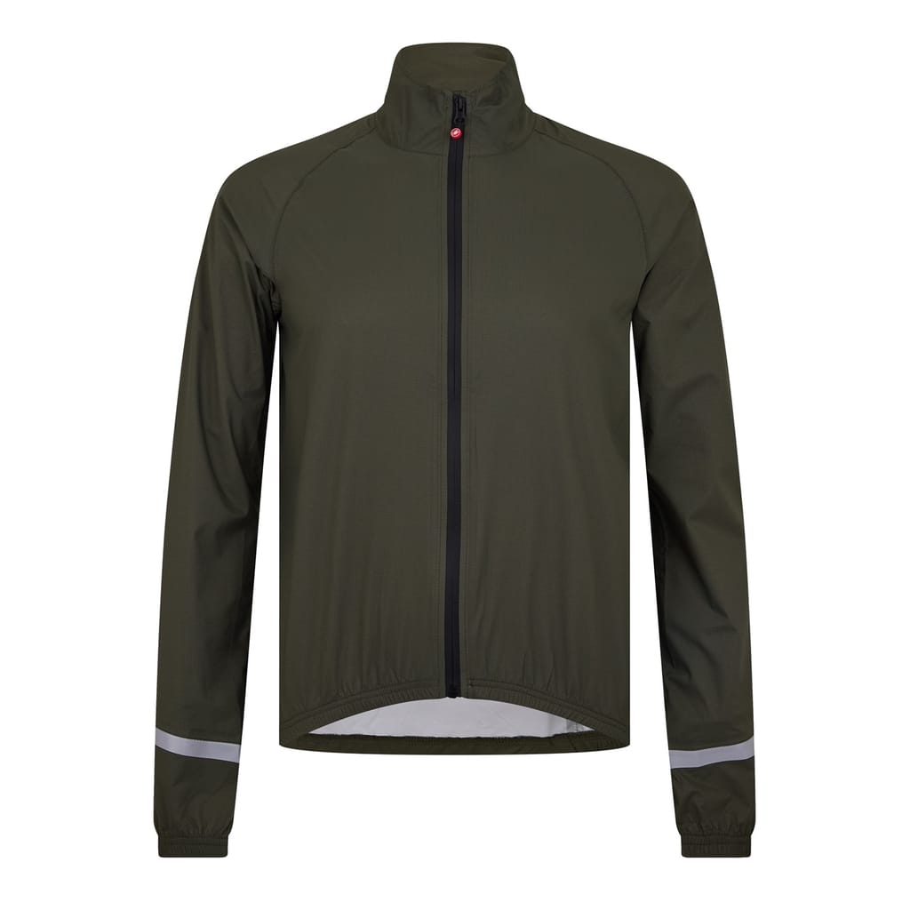The Castelli performance jacket is a stylish and functional choice. This jacket features a high neck and raglan sleeves for enhanced mobility. It has a zipper closure, ensuring a snug fit, complemented by elasticated cuffs. The regular fit and short length offer a comfortable wear, while the solid pattern is accentuated by a logo and reflective ribbon for added visibility. -