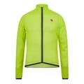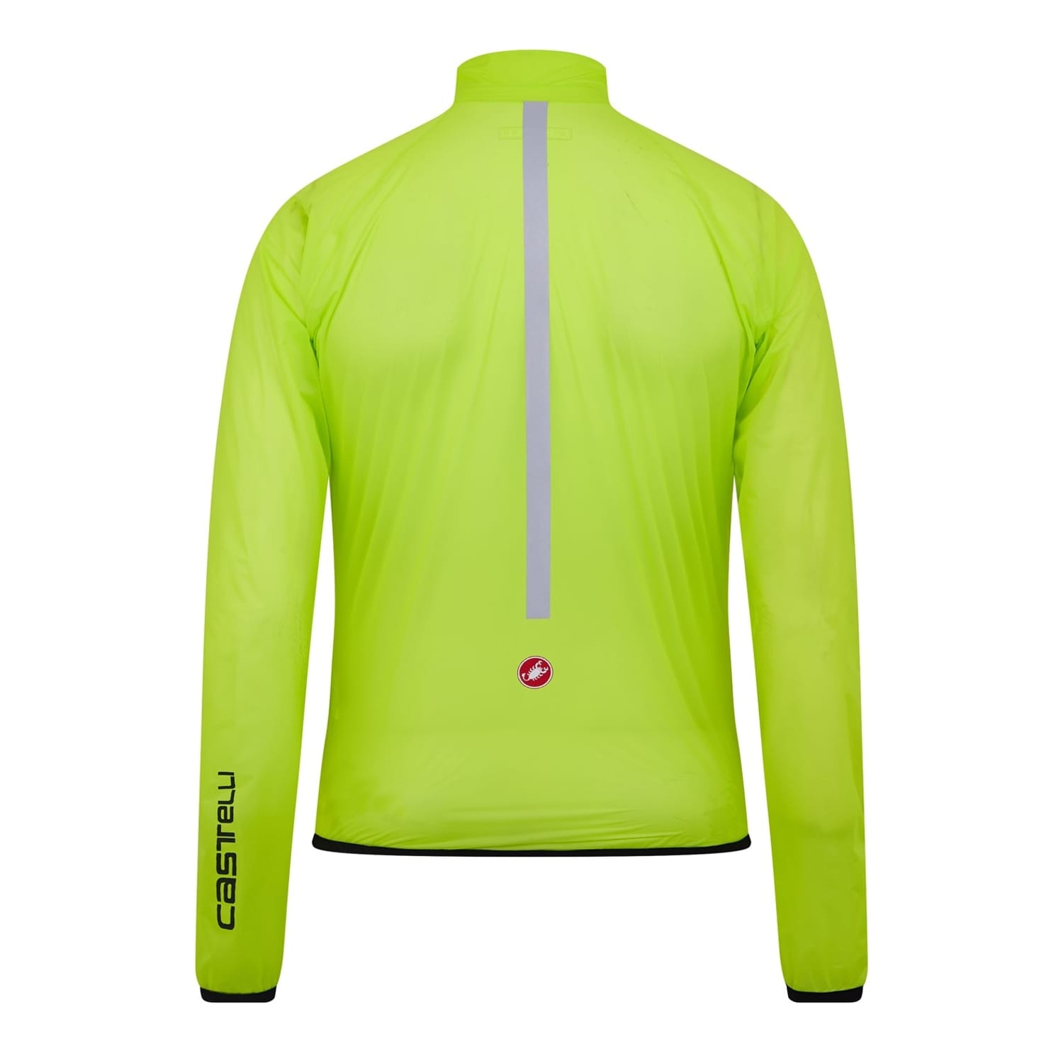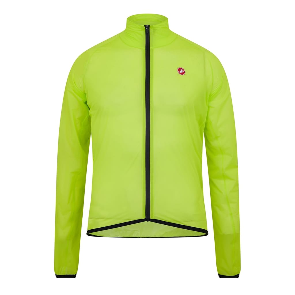 Introducing the Castelli performance jacket, a slim-fit piece designed for enhanced functionality. This solid jacket features a high neck, zipper closure, and elasticated cuffs for a secure fit. The jacket is adorned with a logo and reflective ribbon for visibility, making it a stylish and practical choice. -
