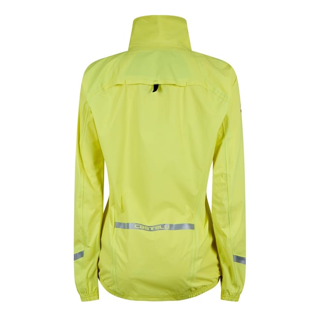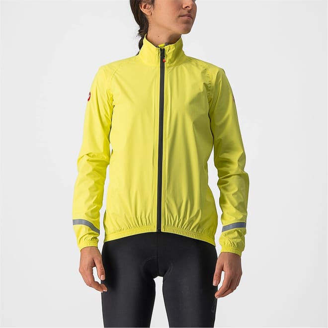 This Castelli performance jacket from the activewear collection is designed for optimal functionality. Featuring a high neck and raglan sleeves, it offers a regular fit for comfort. The solid pattern is complemented by a zipper closure and elasticated cuffs. Embellished with a logo and reflective ribbon, this jacket ensures visibility and style during your activities. -