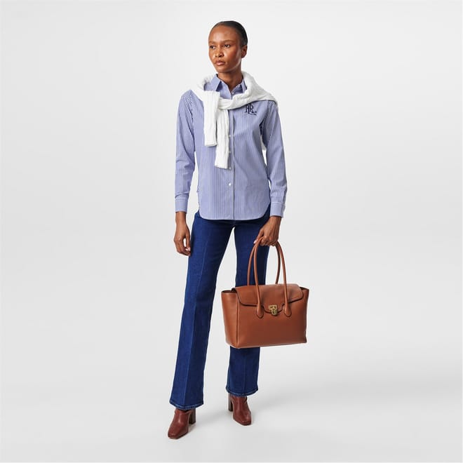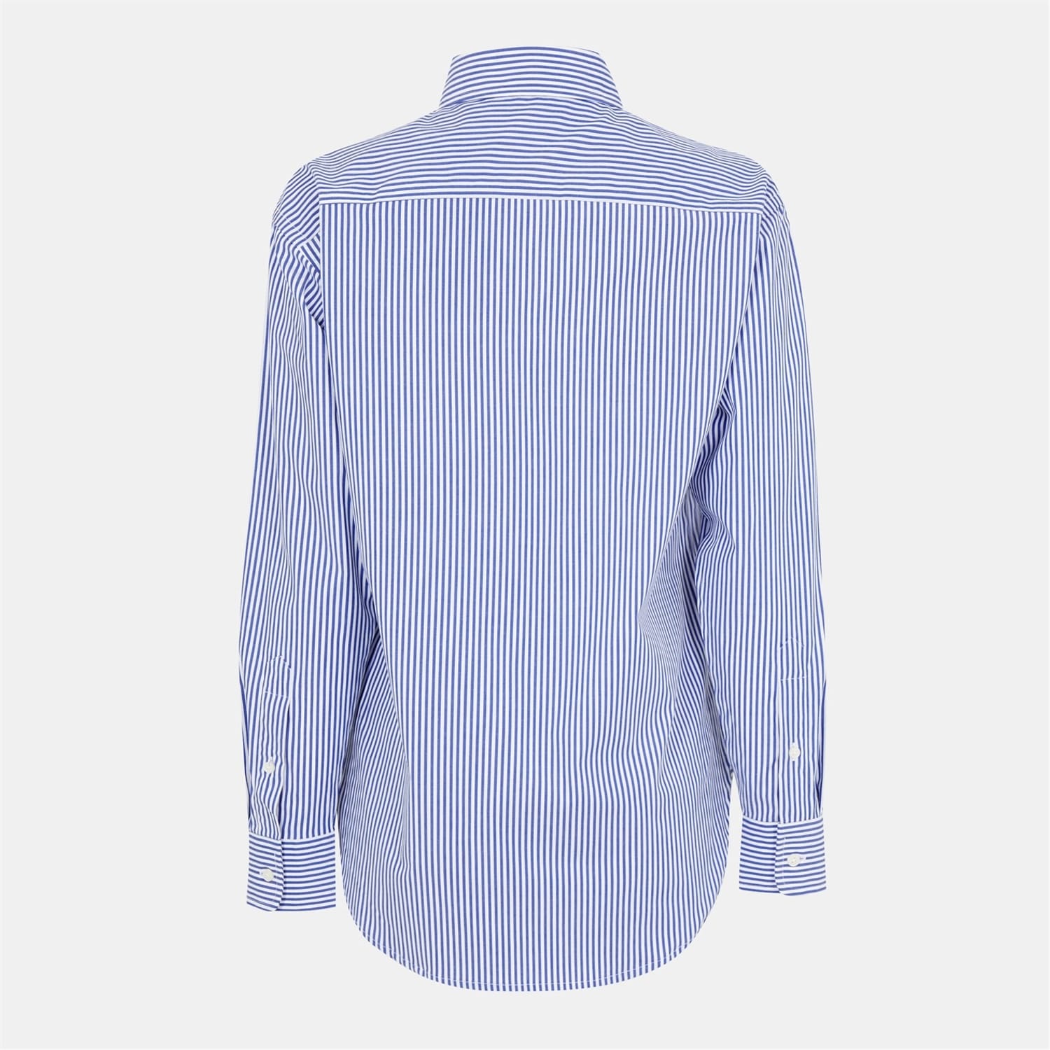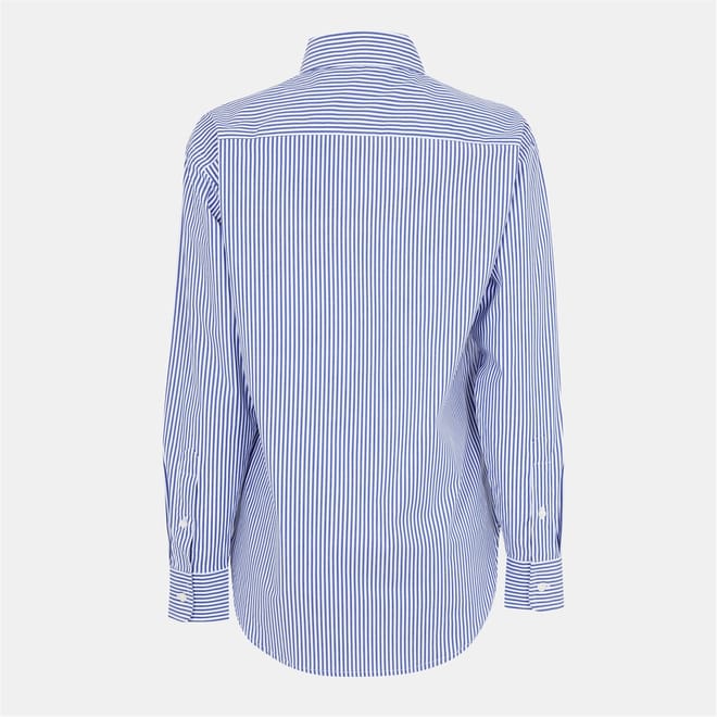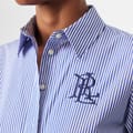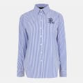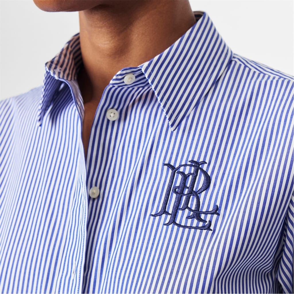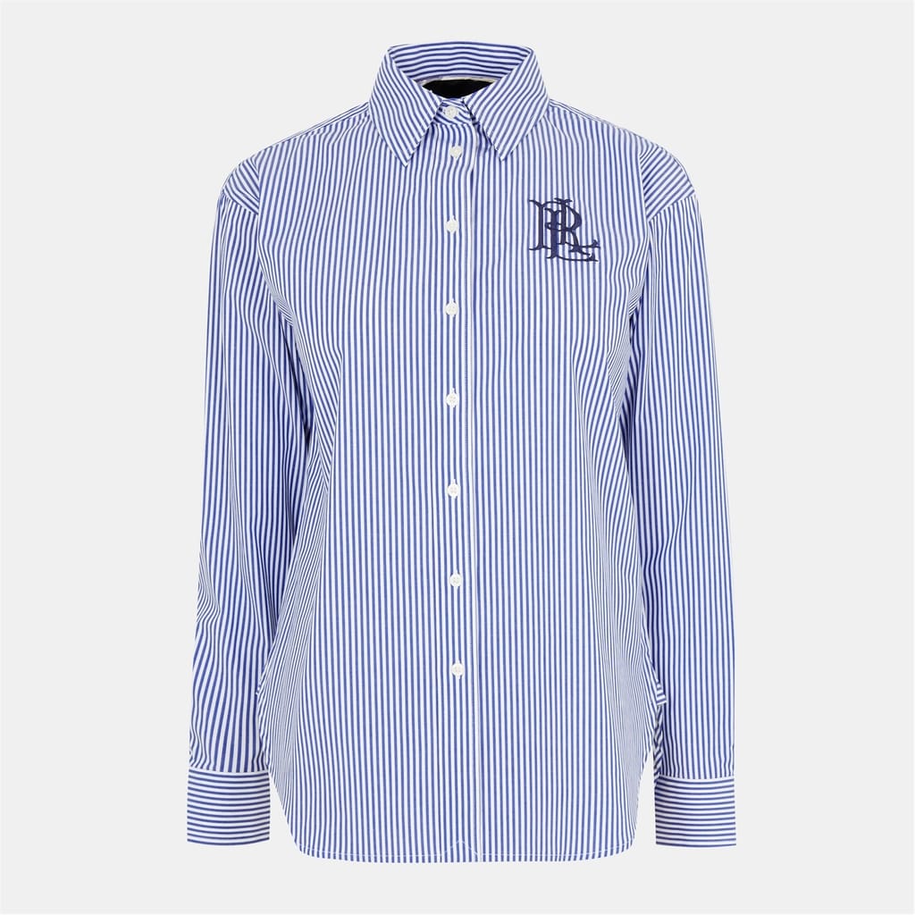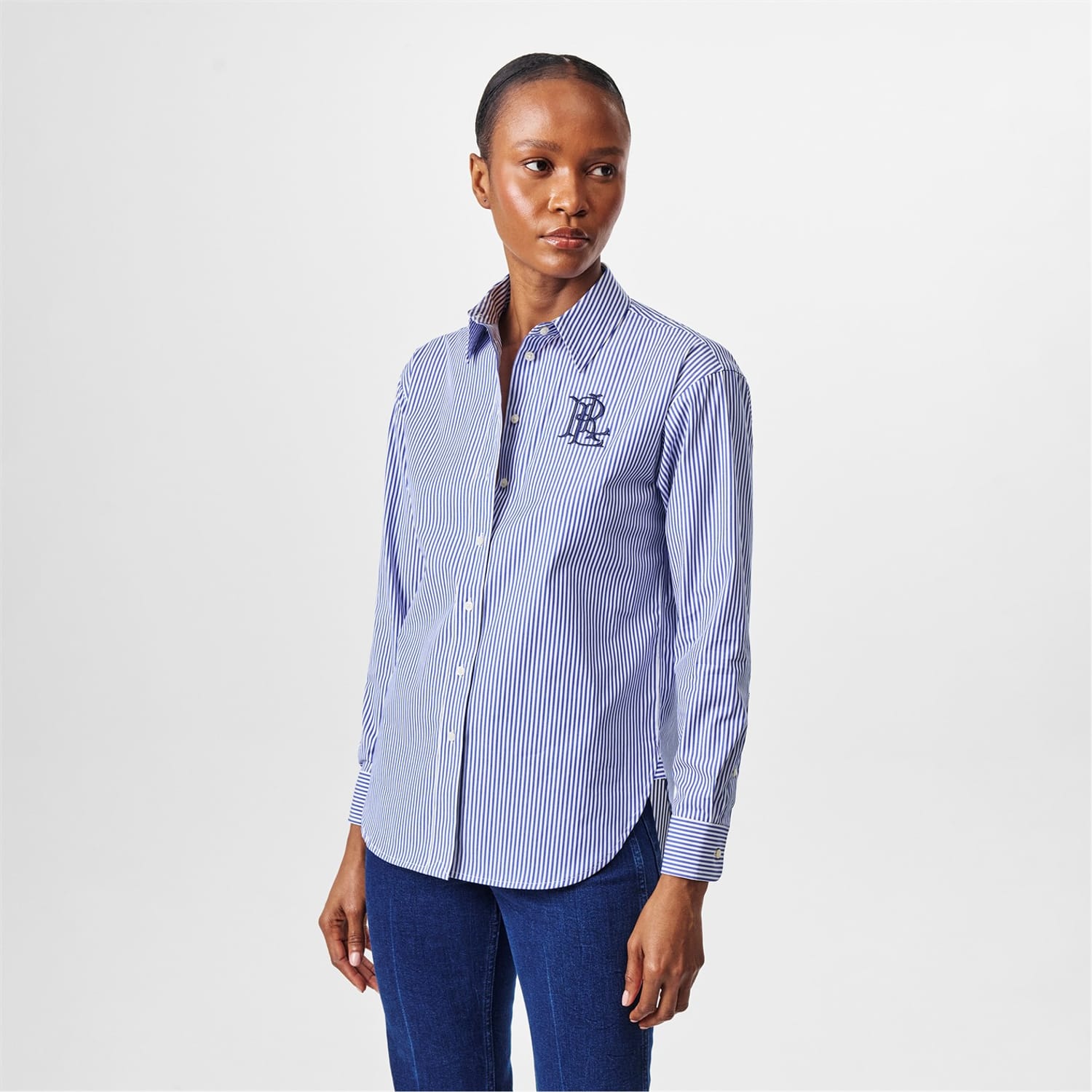 This Lauren by Ralph Lauren top features a classic shirt collar and long sleeves with cuff detailing. The button-down closure adds a touch of sophistication, while the regular fit ensures comfort. Adorned with a subtle stripe pattern, the top is elegantly finished with an embroidered monogram logo, making it a stylish choice for any occasion. -