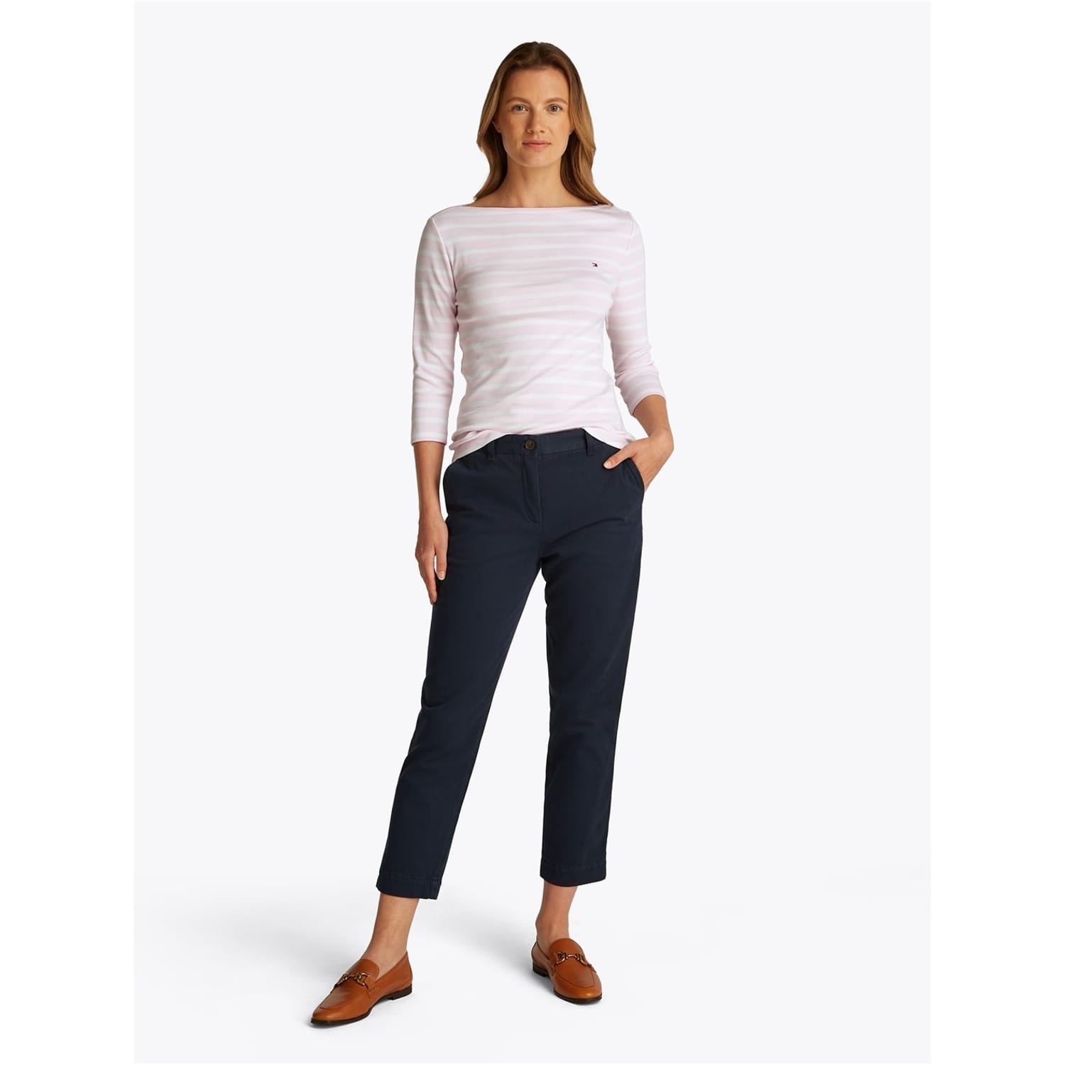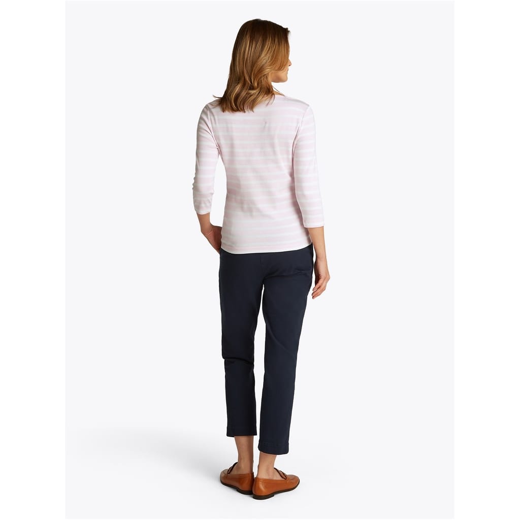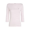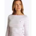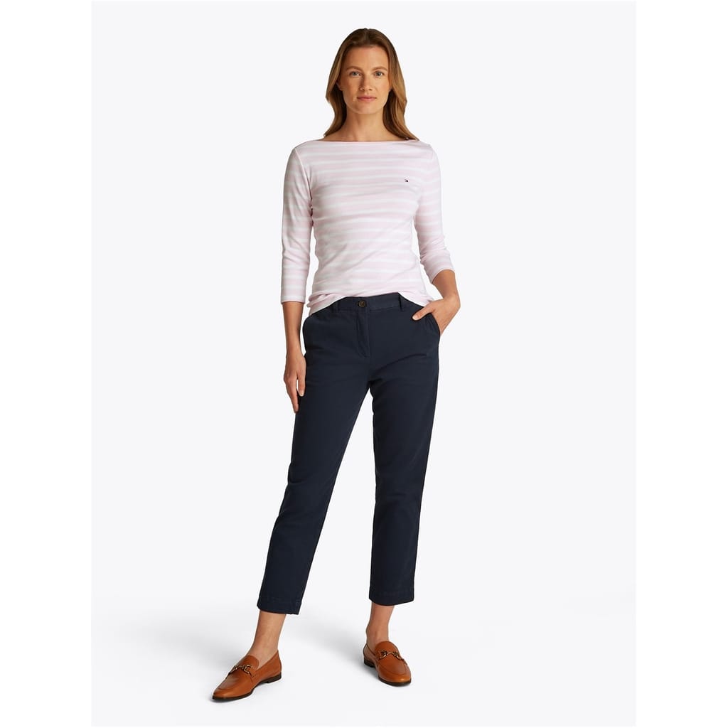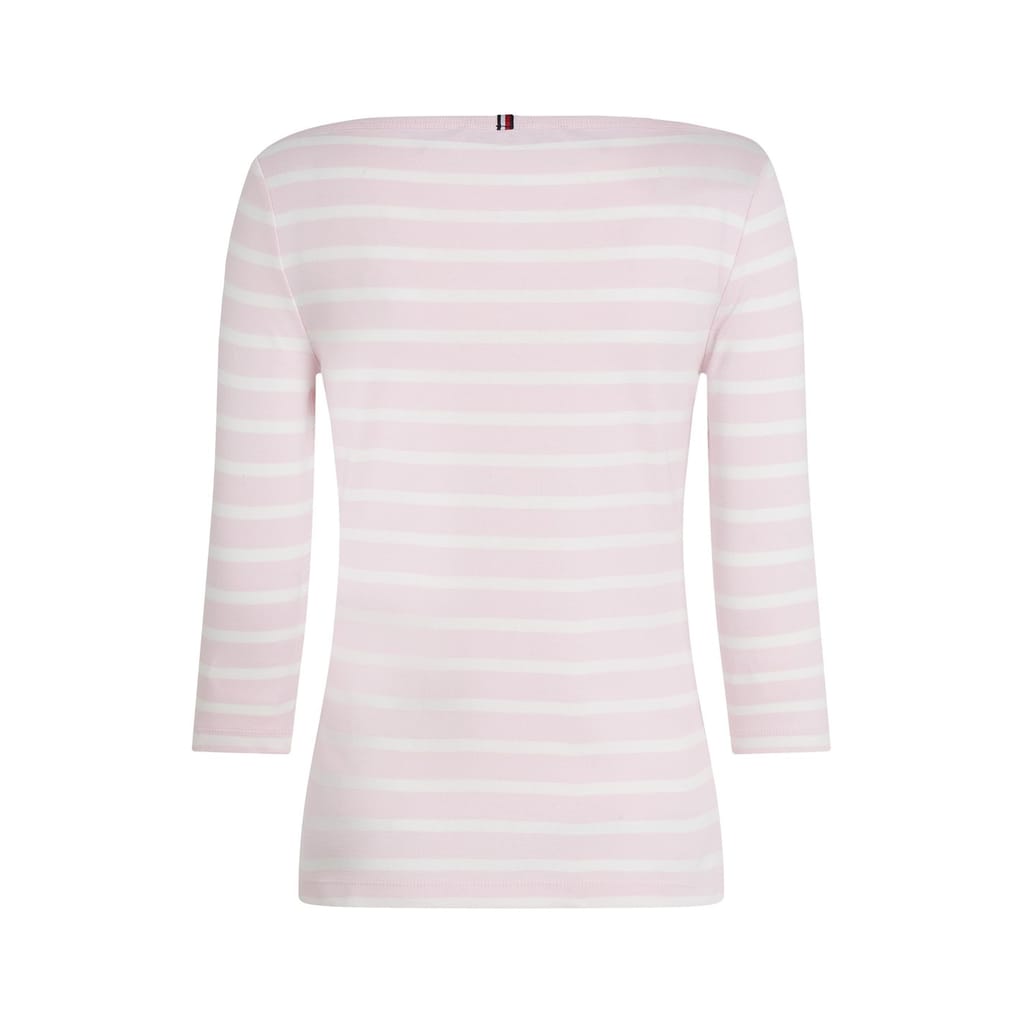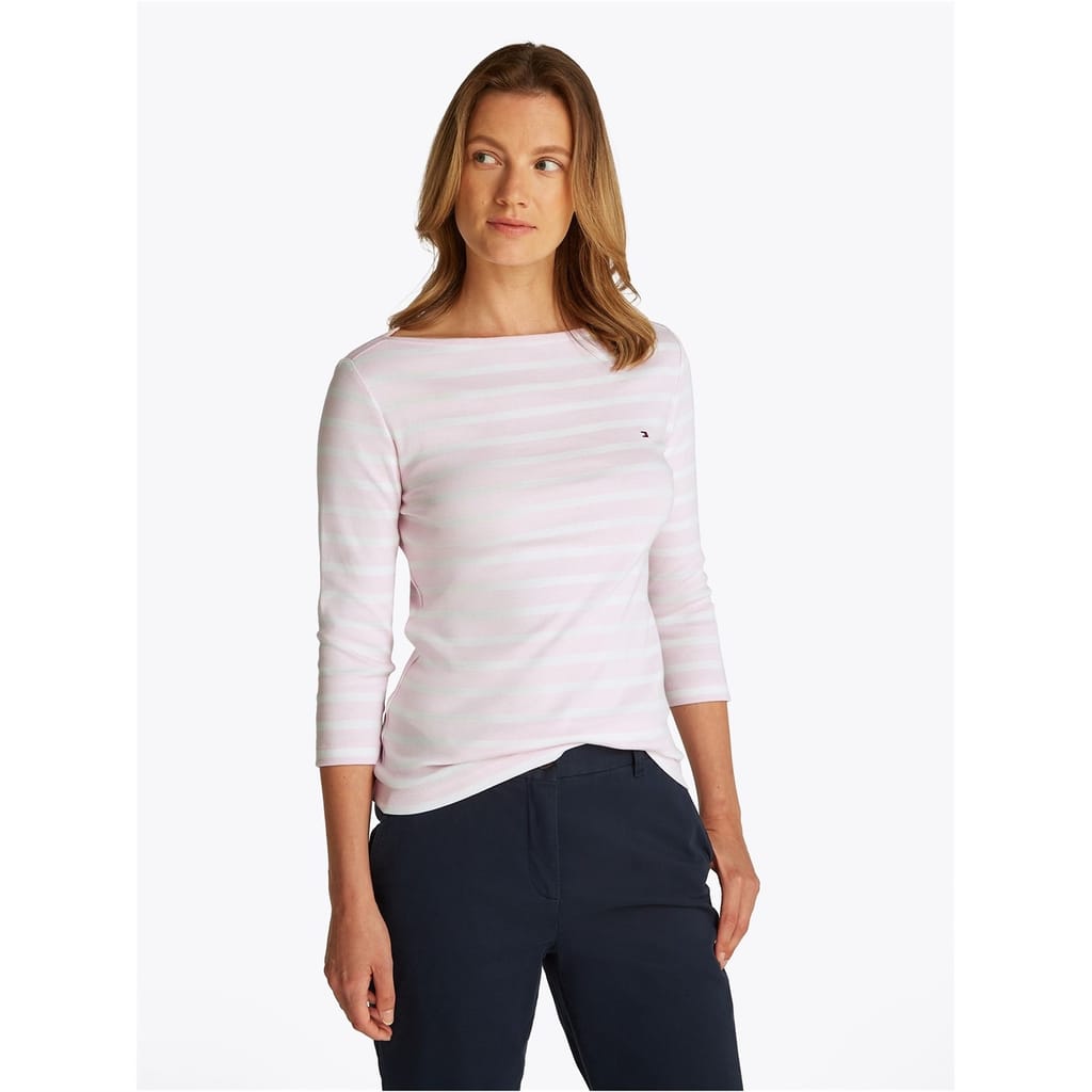 This Tommy Hilfiger top features a slim fit with a stylish boat neck and three-quarter sleeves. The striped pattern adds a classic touch, while the logo embellishment provides a subtle brand detail. -