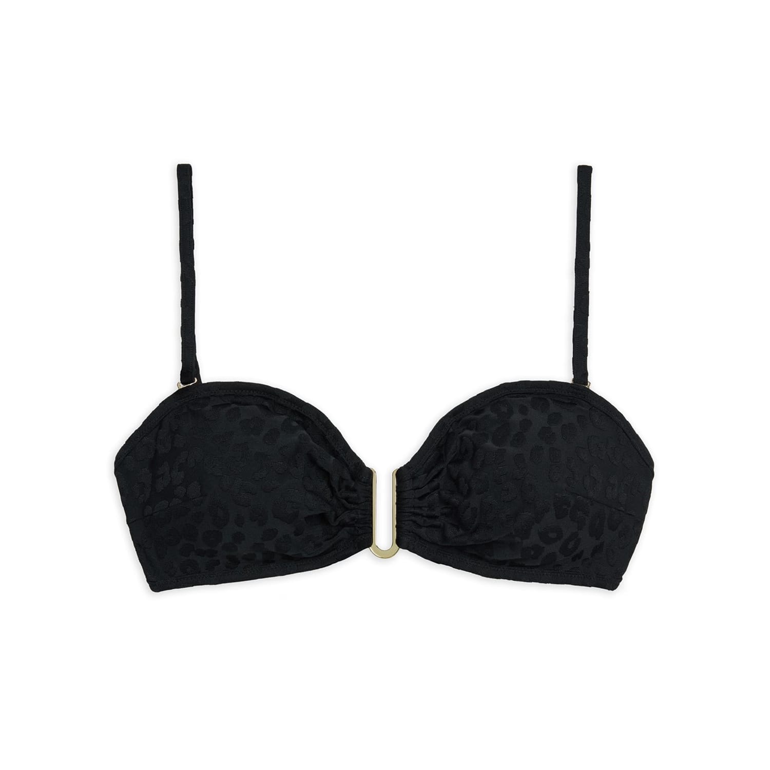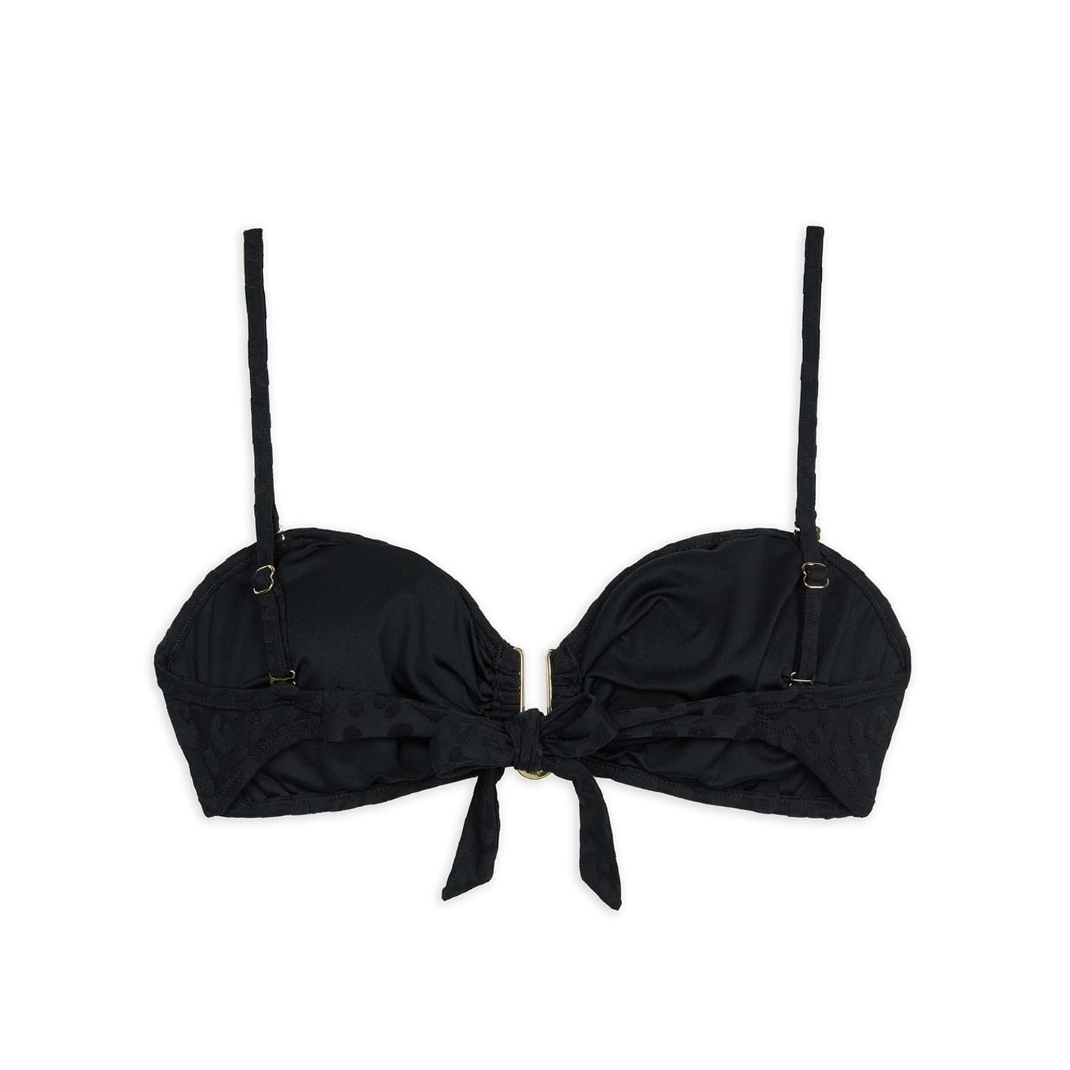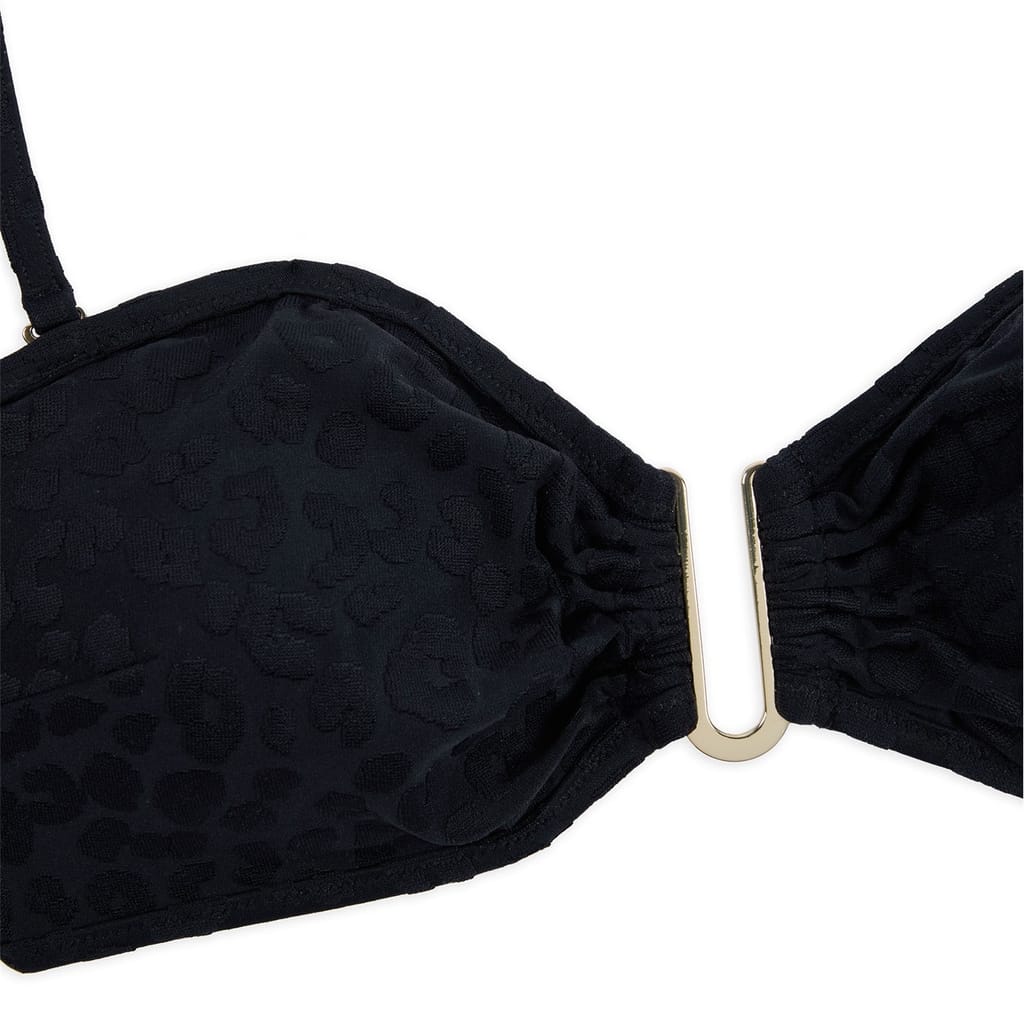 Chelsea Peers swimwear features a stylish bikini top with a playful animal pattern. The design is enhanced with ruffle embellishments, adding a touch of flair. The tie closure ensures a secure and adjustable fit, making it a chic choice for your swimwear collection. -