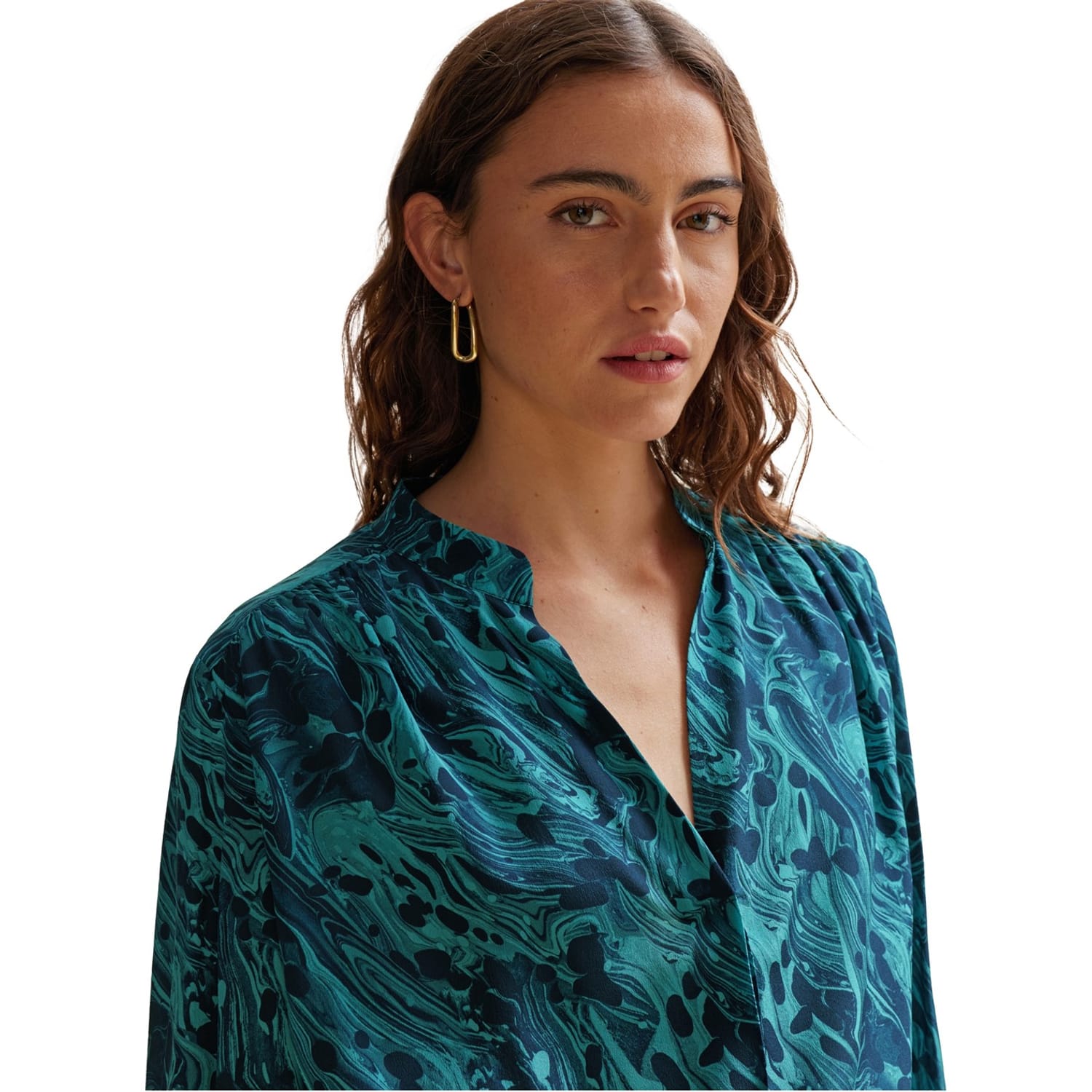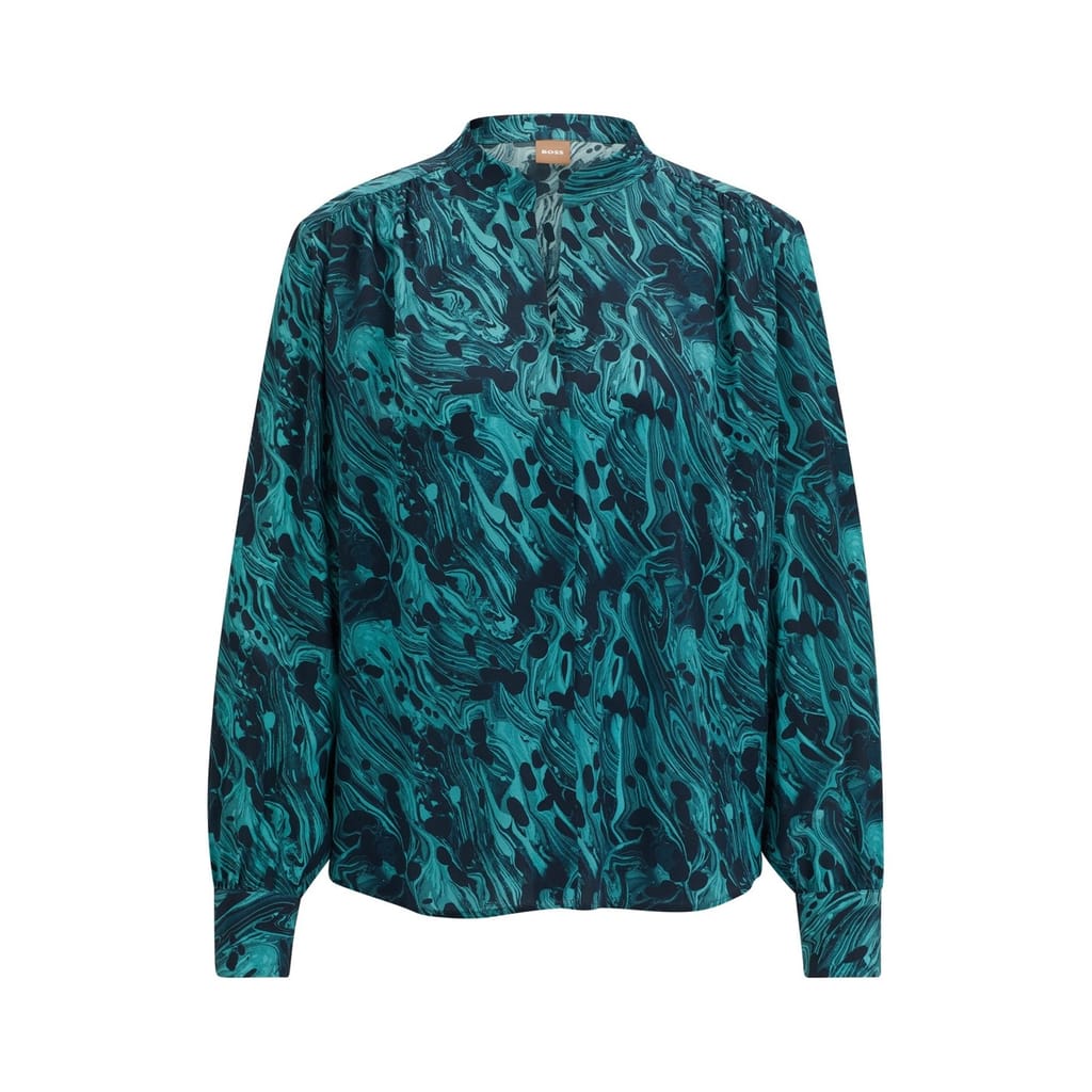 Elevate your wardrobe with this elegant Boss blouse. Featuring a unique marble pattern, this top boasts a band collar and long sleeves for a sophisticated look. Designed in a regular fit, it offers both comfort and style, making it a versatile addition to your collection. -