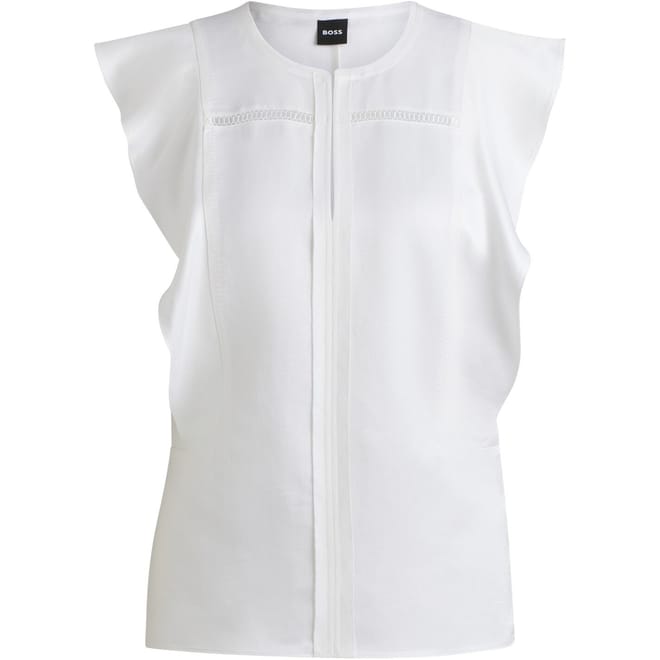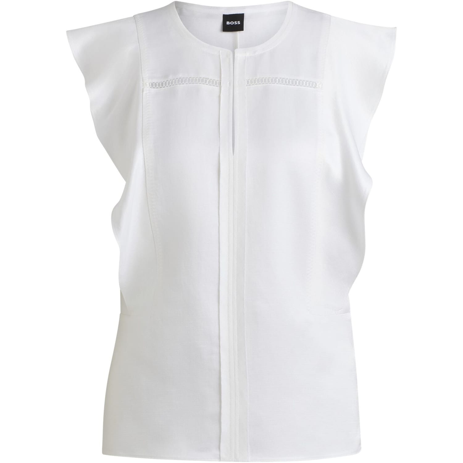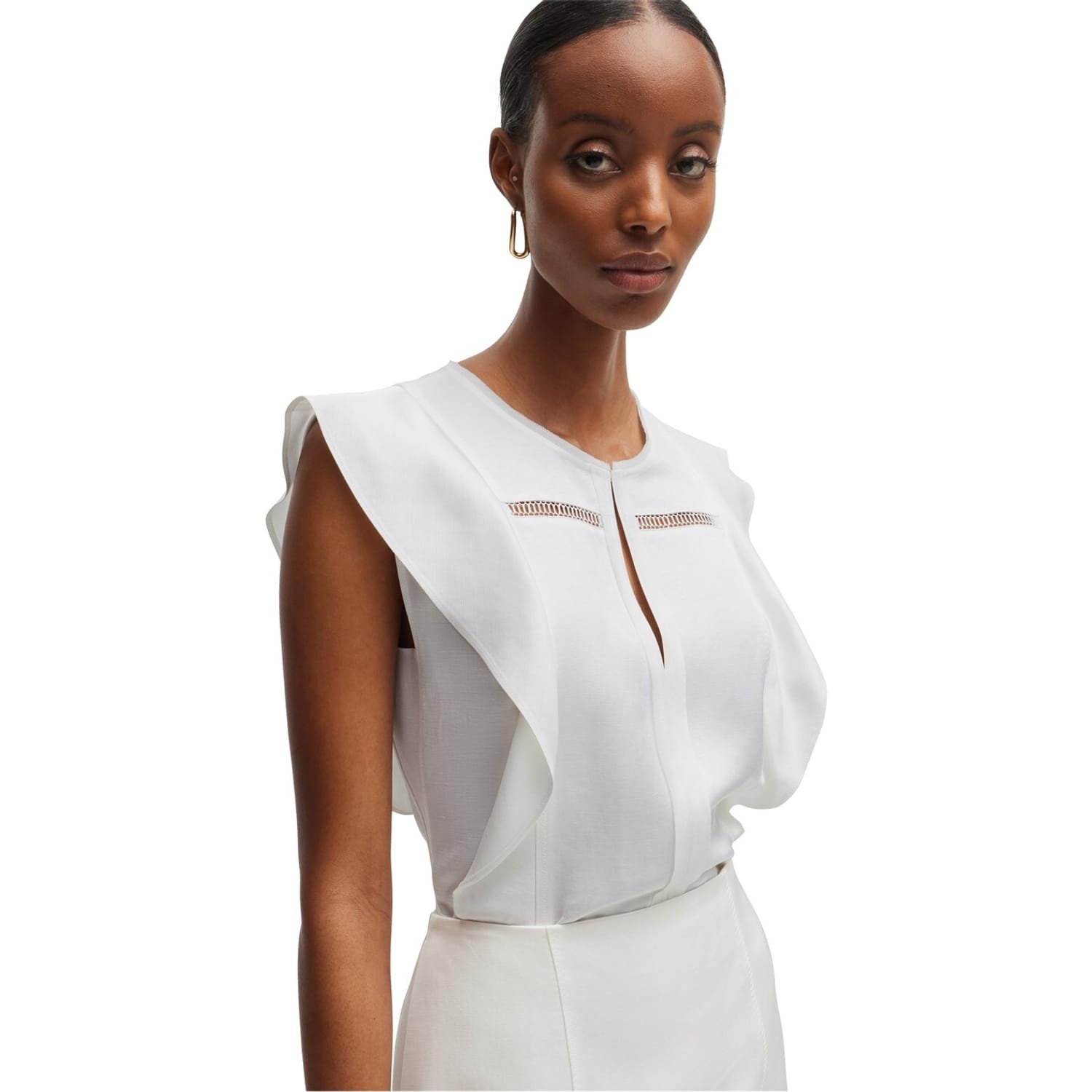 This Boss blouse features a stylish keyhole neck and ruffle sleeves, perfect for adding a touch of elegance. Designed in a regular fit, it ensures comfort and a flattering silhouette. A versatile addition to any wardrobe, this top offers a sophisticated look for various occasions. -